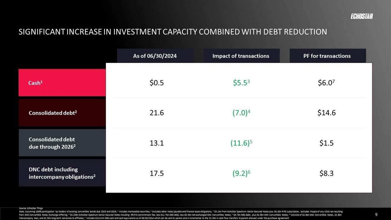 8 ENHANCED FINANCIAL PROFILE: PORTFOLIO REFOCUSED ON GROWING CONNE CTIVITY MARKETS Source: EchoStar filings Note: Revenue splits represent LTM as of 06/30/2024; 1 Excludes impact of Eliminations; 2 Revenue from Pay - TV business not in transaction perimeter $11,027 67.4% $3,587 21.9% $119 0.7% $1,639 10% Pay-TV Retail Wireless 5G Network Deployment Broadband and Satellite Services (LTM Revenue, $mm) Pro - forma (LTM Revenue, $mm) 1 1 $3,587 66.9% $119 2.2% $1,639 30.6% $16 0.3% Retail Wireless 5G Network Deployment Broadband and Satellite Services Other 2 $16,372 $5,361