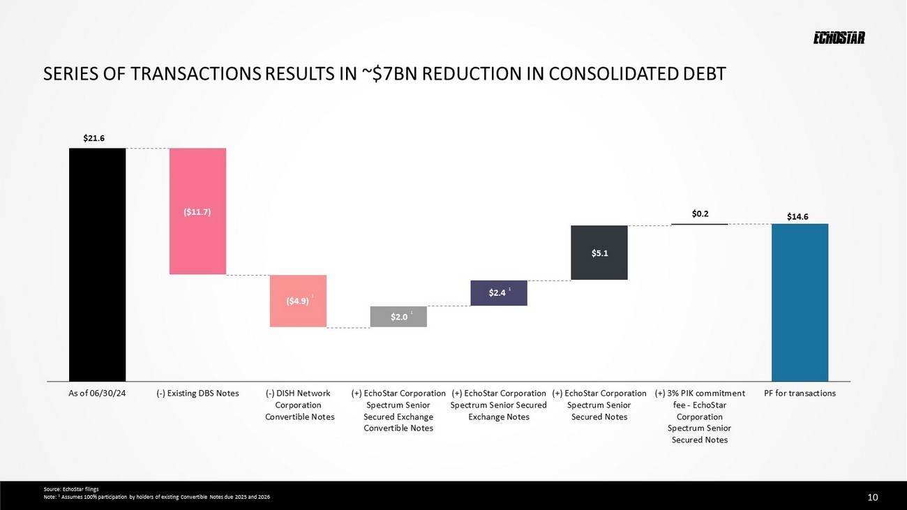 9 SIGNIFICANT INCREASE IN INVESTMENT CAPACITY COMBINED WITH DEBT R EDUCTION Cash 1 Consolidated debt 2 Consolidated debt due through 2026 2 DNC debt including intercompany obligations 2 As of 06/30/2024 PF for transactions Impact of transactions $6.0 7 $5.5 3 $0.5 $14.6 (7.0) 4 21.6 $1.5 (11.6) 5 13.1 $8.3 (9.2) 6 17.5 Source: EchoStar filings Note: Assuming 100% participation by holders of existing convertible bonds due 2025 and 2026; 1 Includes marketable securities; 2 Excludes other notes payable and finance lease obligations; 3 $5.1bn from EchoStar Spectrum Senior Secured Notes plus $0.4bn PIPE subscription, e xcludes impact of any CODI tax resulting from DNC Convertible Notes Exchange Offering ; 4 $5.25bn EchoStar Spectrum Senior Secured Notes including 3% PIK commitment fee, less $11.7bn DBS debt, less $0.5bn net exchanged DNC Convertible Notes; 5 $6.7bn DBS debt, plus $4.9bn DNC Convertible Notes; 6 Consists of $4.9bn DNC Convertible Notes, $2.8bn intercompany loan, and $1.5bn long - term advances to affiliates; 7 Includes $211mm DBS cash and cash equivalents as of 06/30/2024 which can be sent to parent and is incremental to the $1.5bn i n c ash flow transfers to parent allowed under the purchase agreement