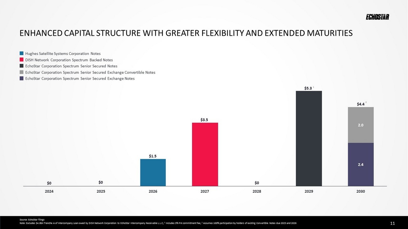 10 SERIES OF TRANSACTIONS RESULTS IN ~$7BN REDUCTION IN CONSOLIDATE D DEBT Source: EchoStar filings Note: 1 Assumes 100% participation by holders of existing Convertible Notes due 2025 and 2026 $21.6 $14.6 ($11.7) ($4.9) $2.0 $2.4 $5.1 $0.2 As of 06/30/24 (-) Existing DBS Notes (-) DISH Network Corporation Convertible Notes (+) EchoStar Corporation Spectrum Senior Secured Exchange Convertible Notes (+) EchoStar Corporation Spectrum Senior Secured Exchange Notes (+) EchoStar Corporation Spectrum Senior Secured Notes (+) 3% PIK commitment fee - EchoStar Corporation Spectrum Senior Secured Notes PF for transactions 1 1 1