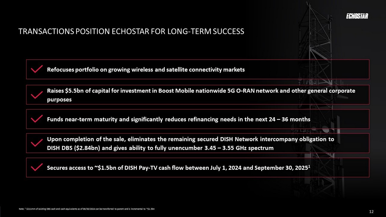 11 ENHANCED CAPITAL STRUCTURE WITH GREATER FLEXIBILITY AND EXTENDED MATURITIES $0 $0 $1.5 $3.5 $0 $5.3 $4.4 2.4 2.0 2024 2025 2026 2027 2028 2029 2030 Source: EchoStar filings Note: Excludes $4.8bn Tranche A of Intercompany Loan owed by DISH Network Corporation to EchoStar Intercompany Receivable L.L .C; 1 Includes 3% PIK commitment fee; 2 Assumes 100% participation by holders of existing Convertible Notes due 2025 and 2026 DISH Network Corporation Spectrum Backed Notes Hughes Satellite Systems Corporation Notes EchoStar Corporation Spectrum Senior Secured Exchange Notes EchoStar Corporation Spectrum Senior Secured Exchange Convertible Notes EchoStar Corporation Spectrum Senior Secured Notes 1 2