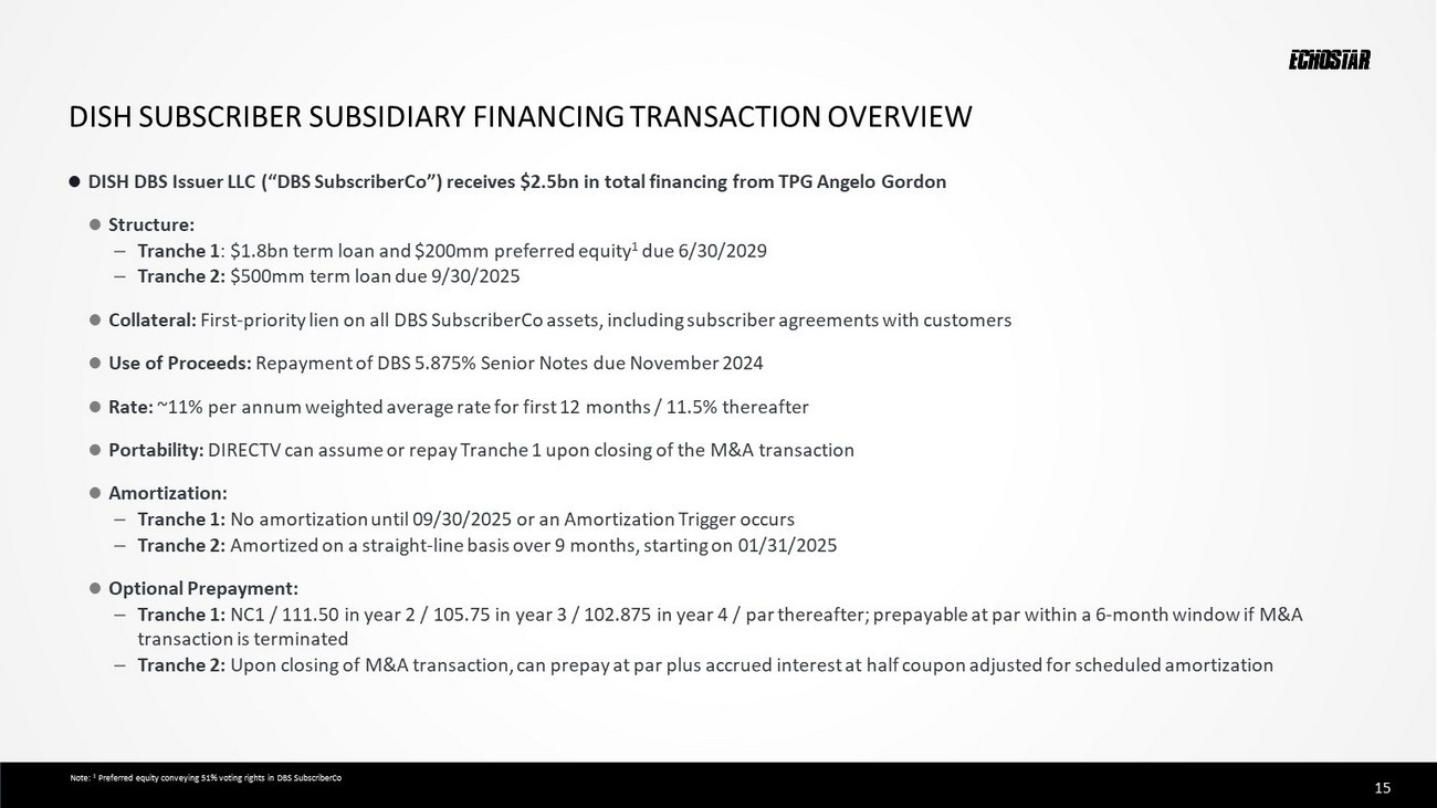15 DISH SUBSCRIBER SUBSIDIARY FINANCING TRANSACTION OVERVIEW DISH DBS Issuer LLC (“DBS SubscriberCo ”) receives $2.5bn in total financing from TPG Angelo Gordon Structure: – Tranche 1 : $1.8bn term loan and $200mm preferred equity 1 due 6/30/2029 – Tranche 2: $500mm term loan due 9/30/2025 Collateral: First - priority lien on all DBS SubscriberCo assets, including subscriber agreements with customers Use of Proceeds: Repayment of DBS 5.875% Senior Notes due November 2024 Rate: ~11% per annum weighted average rate for first 12 months / 11.5% thereafter Portability: DIRECTV can assume or repay Tranche 1 upon closing of the M&A transaction Amortization: – Tranche 1: No amortization until 09/30/2025 or an Amortization Trigger occurs – Tranche 2: Amortized on a straight - line basis over 9 months, starting on 01/31/2025 Optional Prepayment: – Tranche 1: NC1 / 111.50 in year 2 / 105.75 in year 3 / 102.875 in year 4 / par thereafter; prepayable at par within a 6 - month window if M&A transaction is terminated – Tranche 2: Upon closing of M&A transaction, can prepay at par plus accrued interest at half coupon adjusted for scheduled amortization Note: 1 Preferred equity conveying 51% voting rights in DBS SubscriberCo