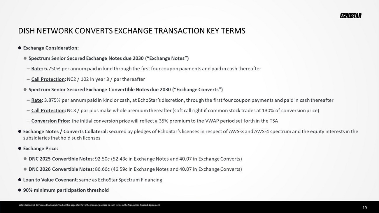 18 ECHOSTAR SPECTRUM FINANCING KEY TERMS Amount : $5.1bn Spectrum Senior Secured Notes Maturity : 5 years Collateral : secured by pledges of EchoStar’s licenses in respect of AWS - 3 and AWS - 4 spectrum and the equity interests in the subsidiaries that hold such licenses Use of Proceeds : General corporate purposes Rate : 10.750% per annum payable in cash Fee : 3.0% upfront fee payable in kind Call Protection : NC2 / 105.375 in year 3 / 102.6875 in year 4 / par thereafter Loan to Value Covenant : Incremental Pari Debt : up to 37.5% LTV on the Collateral Junior Secured Debt : up to 60.0% LTV on the Collateral Pari Debt Cap : $13bn for first 2 years; thereafter, Company can call for an appraisal and the Pari Debt Cap is set on the lesser of (i) 37 .5% LTV on updated Collateral appraisal value and (ii) $15bn, but no less than $13bn Note: Capitalized terms used but not defined on this page shall have the meaning ascribed to such terms in the Transaction Su ppo rt Agreement