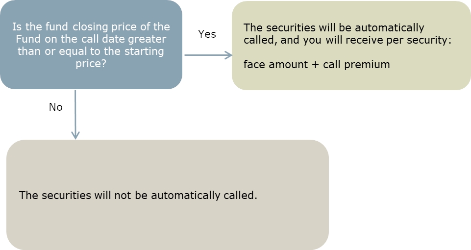If the fund closing price of the Fund on the call date is greater than or equal to the starting price, the securities will be automatically called, and on the call