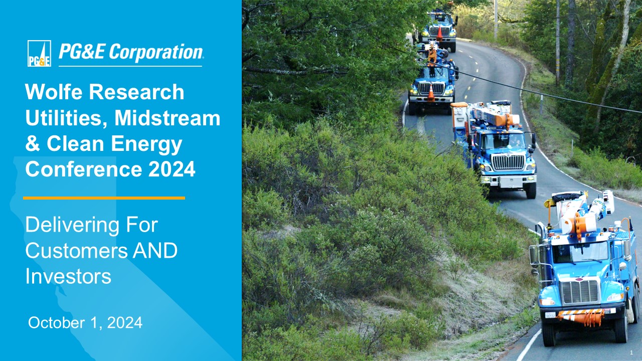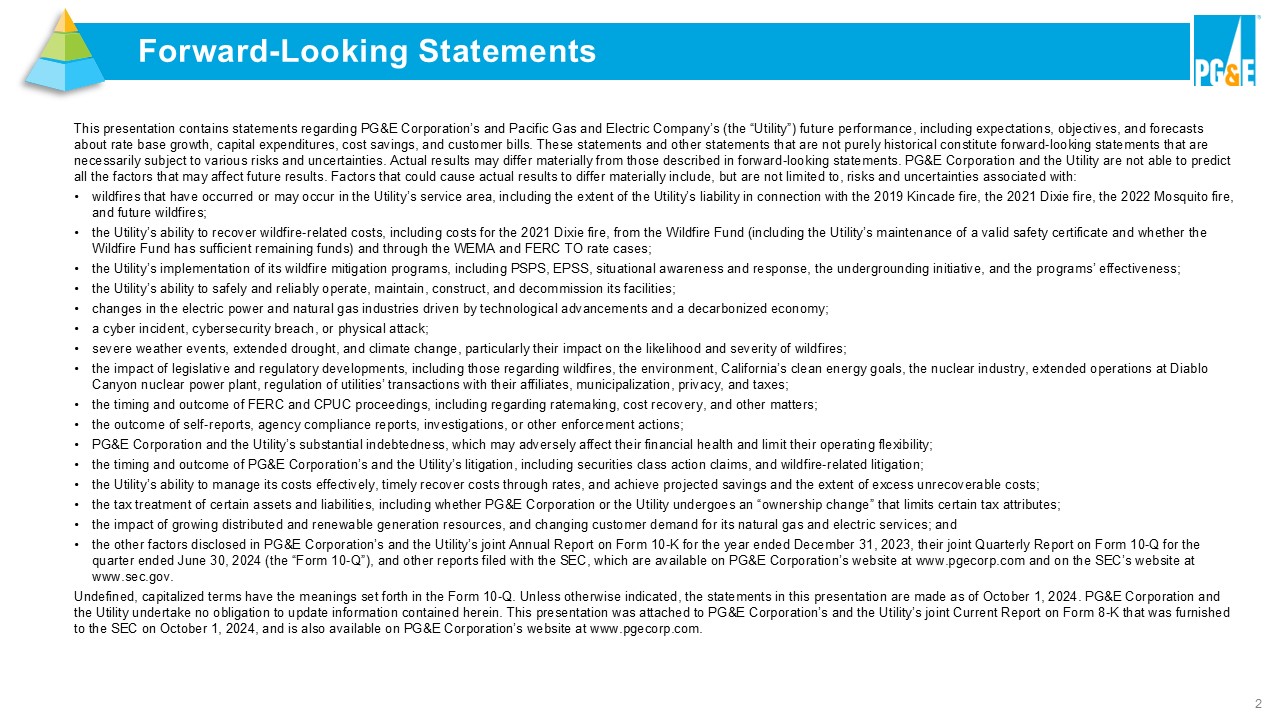 2 This presentation contains statements regarding PG&E Corporation’s and Pacific Gas and Electric Company’s (the “Utility”) fut ure performance, including expectations, objectives, and forecasts about rate base growth, capital expenditures, cost savings, and customer bills. These statements and other statements that are not purely historical constitute forward - lookin g statements that are necessarily subject to various risks and uncertainties. Actual results may differ materially from those described in forward - loo king statements. PG&E Corporation and the Utility are not able to predict all the factors that may affect future results. Factors that could cause actual results to differ materially include, but are no t limited to, risks and uncertainties associated with: • wildfires that have occurred or may occur in the Utility’s service area , including the extent of the Utility’s liability in connection with the 2019 Kincade fire, the 2021 Dixie fire, the 2022 Mosquito fire, and future wildfires; • the Utility’s ability to recover wildfire - related costs, including costs for the 2021 Dixie fire, from the Wildfire Fund (includ ing the Utility’s maintenance of a valid safety certificate and whether the Wildfire Fund has sufficient remaining funds) and through the WEMA and FERC TO rate cases; • the Utility’s implementation of its wildfire mitigation programs, including PSPS, EPSS, situational awareness and response, t he undergrounding initiative, and the programs’ effectiveness; • the Utility’s ability to safely and reliably operate, maintain, construct, and decommission its facilities; • changes in the electric power and natural gas industries driven by technological advancements and a decarbonized economy; • a cyber incident, cybersecurity breach, or physical attack; • severe weather events, extended drought, and climate change, particularly their impact on the likelihood and severity of wild fir es; • the impact of legislative and regulatory developments, including those regarding wildfires, the environment, California’s cle an energy goals, the nuclear industry, extended operations at Diablo Canyon nuclear power plant, regulation of utilities’ transactions with their affiliates, municipalization, privacy, and taxes ; • the timing and outcome of FERC and CPUC proceedings, including regarding ratemaking, cost recovery , and other matters; • the outcome of self - reports, agency compliance reports, investigations, or other enforcement actions; • PG&E Corporation and the Utility’s substantial indebtedness, which may adversely affect their financial health and limit thei r o perating flexibility; • the timing and outcome of PG&E Corporation’s and the Utility’s litigation, including securities class action claims, and wild fir e - related litigation; • the Utility’s ability to manage its costs effectively, timely recover costs through rates, and achieve projected savings and the extent of excess unrecoverable costs; • the tax treatment of certain assets and liabilities, including whether PG&E Corporation or the Utility undergoes an “ownershi p c hange” that limits certain tax attributes; • the impact of growing distributed and renewable generation resources, and changing customer demand for its natural gas and el ect ric services; and • the other factors disclosed in PG&E Corporation’s and the Utility’s joint Annual Report on Form 10 - K for the year ended December 31, 2023, their joint Quarterly Report on Form 10 - Q for the quarter ended June 30, 2024 (the “Form 10 - Q”), and other reports filed with the SEC, which are available on PG&E Corporation’s w ebsite at www.pgecorp.com and on the SEC’s website at www.sec.gov. Undefined, capitalized terms have the meanings set forth in the Form 10 - Q. Unless otherwise indicated, the statements in this pr esentation are made as of October 1, 2024. PG&E Corporation and the Utility undertake no obligation to update information contained herein. This presentation was attached to PG&E Corporation’s and the Utility’s joint Current Report on Form 8 - K that was furnished to the SEC on October 1, 2024, and is also available on PG&E Corporation’s website at www.pgecorp.com. Forward - Looking Statements