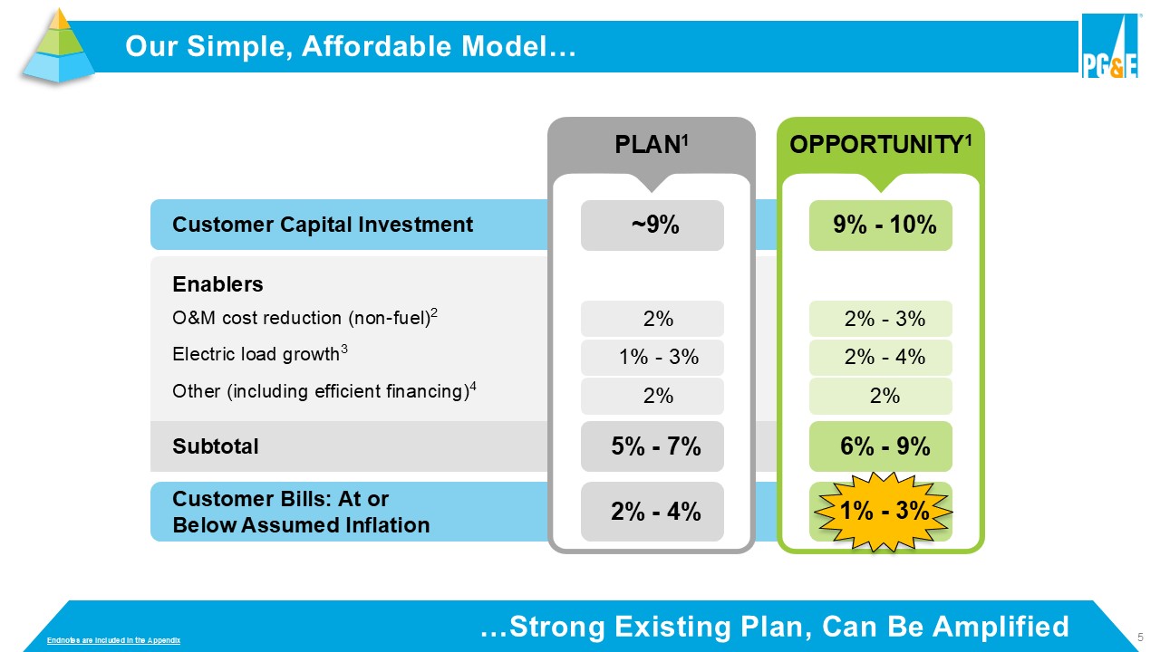 5 Subtotal Enablers O&M cost reduction (non - fuel) 2 Electric load growth 3 Other (including efficient financing) 4 Customer Capital Investment Customer Bills: At or Below Assumed Inflation Our Simple, Affordable Model… 2% 1% - 3% 2% ~9% 5% - 7% 2% - 4% PLAN 1 …Strong Existing Plan, Can Be Amplified 2% - 3% 2% - 4% 2% 9% - 10% 6% - 9% 1% - 3% 2% - 3% 2% - 4% 2% 9% - 10% 6% - 9% 1% - 3% OPPORTUNITY 1 Endnotes are included in the Appendix 1 % - 3%