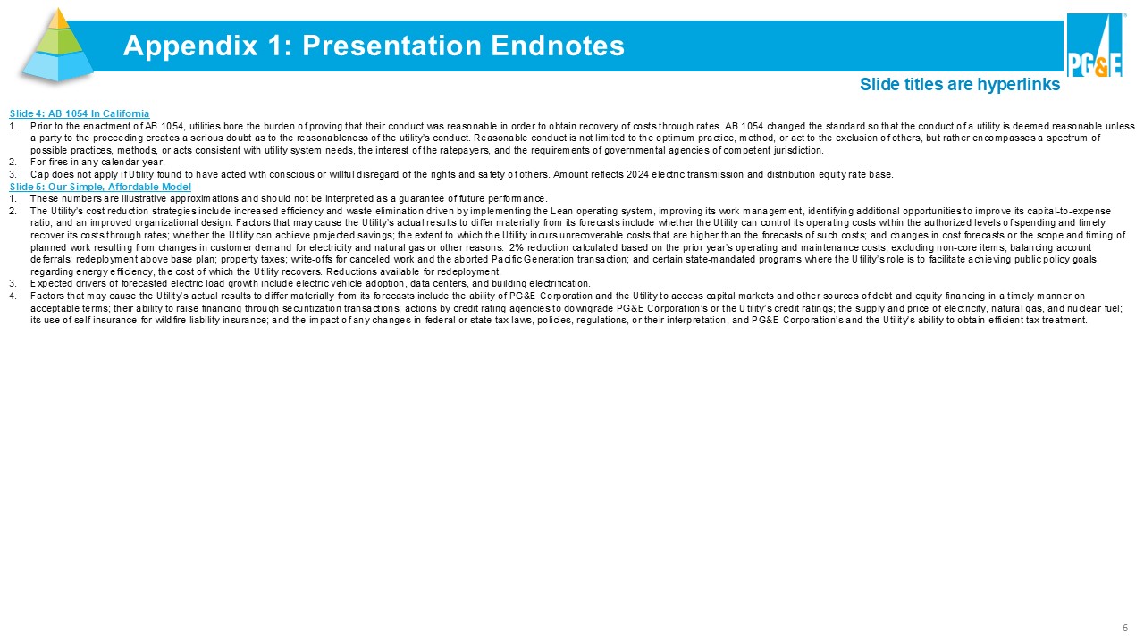 6 Appendix 1: Presentation Endnotes Slide 4: AB 1054 In California 1. Prior to the enactment of AB 1054, utilities bore the burden of proving that their conduct was reasonable in order to obtain rec overy of costs through rates. AB 1054 changed the standard so that the conduct of a utility is deemed reasonable unless a party to the proceeding creates a serious doubt as to the reasonableness of the utility’s conduct. Reasonable conduct is no t l imited to the optimum practice, method, or act to the exclusion of others, but rather encompasses a spectrum of possible practices, methods, or acts consistent with utility system needs, the interest of the ratepayers, and the requiremen ts of governmental agencies of competent jurisdiction. 2. For fires in any calendar year. 3. Cap does not apply if Utility found to have acted with conscious or willful disregard of the rights and safety of others. Amo unt reflects 2024 electric transmission and distribution equity rate base. Slide 5: Our Simple, Affordable Model 1. These numbers are illustrative approximations and should not be interpreted as a guarantee of future performance. 2. The Utility’s cost reduction strategies include increased efficiency and waste elimination driven by implementing the Lean op era ting system, improving its work management, identifying additional opportunities to improve its capital - to - expense ratio, and an improved organizational design. Factors that may cause the Utility’s actual results to differ materially from i ts forecasts include whether the Utility can control its operating costs within the authorized levels of spending and timely recover its costs through rates; whether the Utility can achieve projected savings; the extent to which the Utility incurs un rec overable costs that are higher than the forecasts of such costs; and changes in cost forecasts or the scope and timing of planned work resulting from changes in customer demand for electricity and natural gas or other reasons. 2% reduction calculate d based on the prior year’s operating and maintenance costs, excluding non - core items; balancing account deferrals; redeployment above base plan; property taxes; write - offs for canceled work and the aborted Pacific Generation transac tion; and certain state - mandated programs where the Utility’s role is to facilitate achieving public policy goals regarding energy efficiency, the cost of which the Utility recovers. Reductions available for redeployment. 3. Expected drivers of forecasted electric load growth include electric vehicle adoption, data centers, and building electrifica tio n. 4. Factors that may cause the Utility’s actual results to differ materially from its forecasts include the ability of PG&E Corpo rat ion and the Utility to access capital markets and other sources of debt and equity financing in a timely manner on acceptable terms; their ability to raise financing through securitization transactions; actions by credit rating agencies to dow ngrade PG&E Corporation’s or the Utility’s credit ratings; the supply and price of electricity, natural gas, and nuclear fuel ; its use of self - insurance for wildfire liability insurance; and the impact of any changes in federal or state tax laws, policies , regulations, or their interpretation, and PG&E Corporation’s and the Utility’s ability to obtain efficient tax treatment . Slide titles are hyperlinks