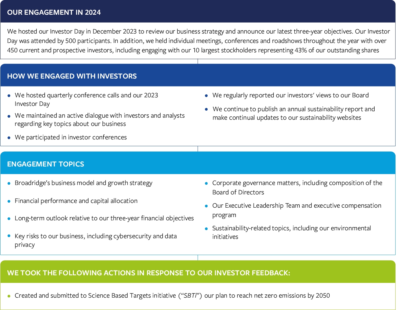 All of the nominees are currently Broadridge directors who were elected by stockholders at the 2023 annual meeting of stockholders. Mr. Brun, who has served on our Board since 2007, will retire from our Board at the 2024 Annual Meeting pursuant to the mandatory retirement policy set forth in our Corporate Governance Principles. | ||||||||||||||