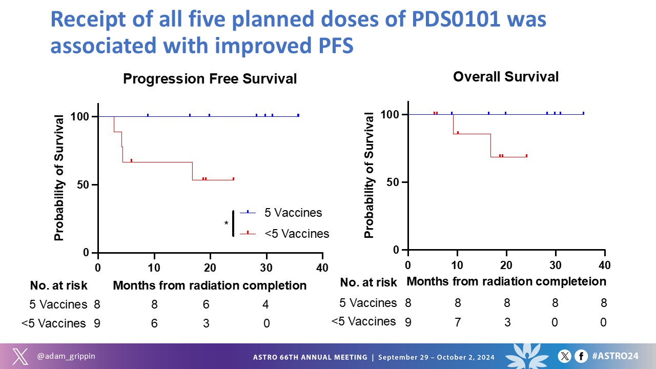 36-month overall survival (OS) rate was 84.4%, and 100% for the eight patients who received all five doses of Versamune® HPV. Historical published data show 36-month OS rate with