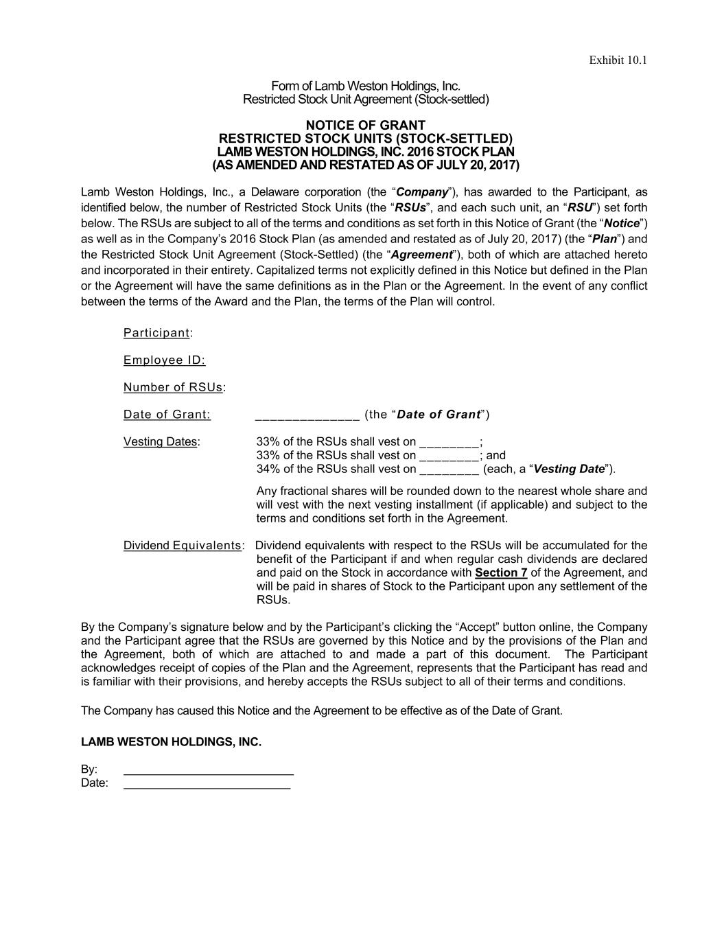 Exhibit 10.1 Form of Lamb Weston Holdings, Inc. Restricted Stock Unit Agreement (Stock-settled) NOTICE OF GRANT RESTRICTED STOCK UNITS (STOCK-SETTLED) LAMB WESTON HOLDINGS, INC. 2016 STOCK PLAN (AS AMENDED AND RESTATED AS OF JULY 20, 2017) Lamb Weston Holdings, Inc., a Delaware corporation (the “Company”), has awarded to the Participant, as identified below, the number of Restricted Stock Units (the “RSUs”, and each such unit, an “RSU”) set forth below. The RSUs are subject to all of the terms and conditions as set forth in this Notice of Grant (the “Notice”) as well as in the Company’s 2016 Stock Plan (as amended and restated as of July 20, 2017) (the “Plan”) and the Restricted Stock Unit Agreement (Stock-Settled) (the “Agreement”), both of which are attached hereto and incorporated in their entirety. Capitalized terms not explicitly defined in this Notice but defined in the Plan or the Agreement will have the same definitions as in the Plan or the Agreement. In the event of any conflict between the terms of the Award and the Plan, the terms of the Plan will control. Participant: Employee ID: Number of RSUs: Date of Grant: ______________ (the “Date of Grant”) Vesting Dates: 33% of the RSUs shall vest on ________; 33% of the RSUs shall vest on ________; and 34% of the RSUs shall vest on ________ (each, a “Vesting Date”). Any fractional shares will be rounded down to the nearest whole share and will vest with the next vesting installment (if applicable) and subject to the terms and conditions set forth in the Agreement. Dividend Equivalents: Dividend equivalents with respect to the RSUs will be accumulated for the benefit of the Participant if and when regular cash dividends are declared and paid on the Stock in accordance with Section 7 of the Agreement, and will be paid in shares of Stock to the Participant upon any settlement of the RSUs. By the Company’s signature below and by the Participant’s clicking the “Accept” button online, the Company and the Participant agree that the RSUs are governed by this Notice and by the provisions of the Plan and the Agreement, both of which are attached to and made a part of this document. The Participant acknowledges receipt of copies of the Plan and the Agreement, represents that the Participant has read and is familiar with their provisions, and hereby accepts the RSUs subject to all of their terms and conditions. The Company has caused this Notice and the Agreement to be effective as of the Date of Grant. LAMB WESTON HOLDINGS, INC. By: Date: __________________________