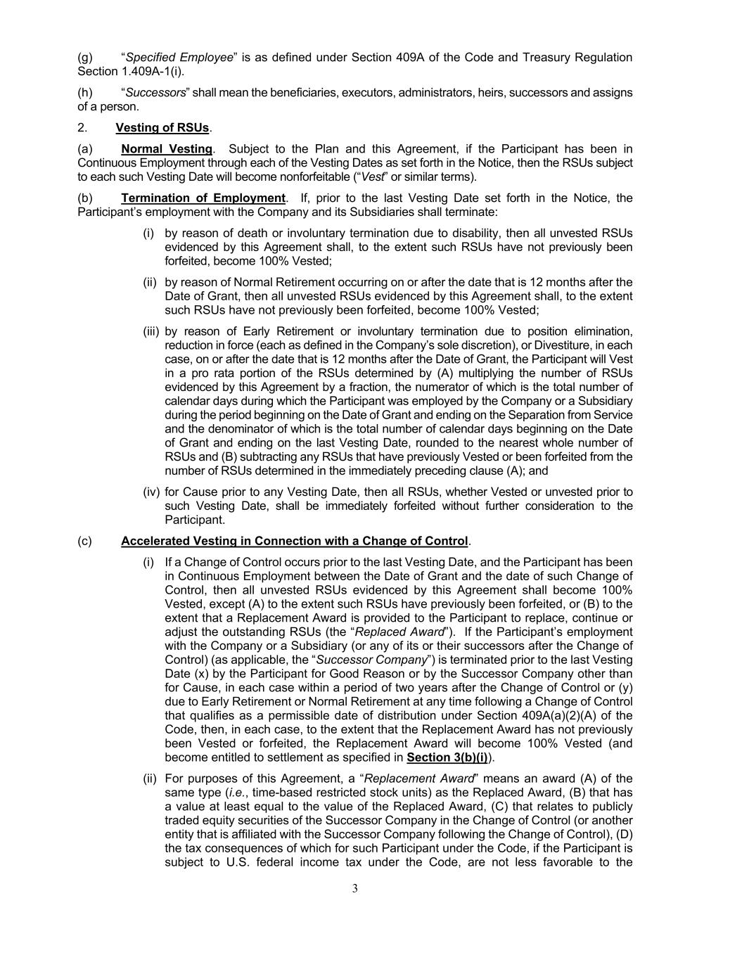 3 (g) “Specified Employee” is as defined under Section 409A of the Code and Treasury Regulation Section 1.409A-1(i). (h) “Successors” shall mean the beneficiaries, executors, administrators, heirs, successors and assigns of a person. 2. Vesting of RSUs. (a) Normal Vesting. Subject to the Plan and this Agreement, if the Participant has been in Continuous Employment through each of the Vesting Dates as set forth in the Notice, then the RSUs subject to each such Vesting Date will become nonforfeitable (“Vest” or similar terms). (b) Termination of Employment. If, prior to the last Vesting Date set forth in the Notice, the Participant’s employment with the Company and its Subsidiaries shall terminate: (i) by reason of death or involuntary termination due to disability, then all unvested RSUs evidenced by this Agreement shall, to the extent such RSUs have not previously been forfeited, become 100% Vested; (ii) by reason of Normal Retirement occurring on or after the date that is 12 months after the Date of Grant, then all unvested RSUs evidenced by this Agreement shall, to the extent such RSUs have not previously been forfeited, become 100% Vested; (iii) by reason of Early Retirement or involuntary termination due to position elimination, reduction in force (each as defined in the Company’s sole discretion), or Divestiture, in each case, on or after the date that is 12 months after the Date of Grant, the Participant will Vest in a pro rata portion of the RSUs determined by (A) multiplying the number of RSUs evidenced by this Agreement by a fraction, the numerator of which is the total number of calendar days during which the Participant was employed by the Company or a Subsidiary during the period beginning on the Date of Grant and ending on the Separation from Service and the denominator of which is the total number of calendar days beginning on the Date of Grant and ending on the last Vesting Date, rounded to the nearest whole number of RSUs and (B) subtracting any RSUs that have previously Vested or been forfeited from the number of RSUs determined in the immediately preceding clause (A); and (iv) for Cause prior to any Vesting Date, then all RSUs, whether Vested or unvested prior to such Vesting Date, shall be immediately forfeited without further consideration to the Participant. (c) Accelerated Vesting in Connection with a Change of Control. (i) If a Change of Control occurs prior to the last Vesting Date, and the Participant has been in Continuous Employment between the Date of Grant and the date of such Change of Control, then all unvested RSUs evidenced by this Agreement shall become 100% Vested, except (A) to the extent such RSUs have previously been forfeited, or (B) to the extent that a Replacement Award is provided to the Participant to replace, continue or adjust the outstanding RSUs (the “Replaced Award”). If the Participant’s employment with the Company or a Subsidiary (or any of its or their successors after the Change of Control) (as applicable, the “Successor Company”) is terminated prior to the last Vesting Date (x) by the Participant for Good Reason or by the Successor Company other than for Cause, in each case within a period of two years after the Change of Control or (y) due to Early Retirement or Normal Retirement at any time following a Change of Control that qualifies as a permissible date of distribution under Section 409A(a)(2)(A) of the Code, then, in each case, to the extent that the Replacement Award has not previously been Vested or forfeited, the Replacement Award will become 100% Vested (and become entitled to settlement as specified in Section 3(b)(i)). (ii) For purposes of this Agreement, a “Replacement Award” means an award (A) of the same type (i.e., time-based restricted stock units) as the Replaced Award, (B) that has a value at least equal to the value of the Replaced Award, (C) that relates to publicly traded equity securities of the Successor Company in the Change of Control (or another entity that is affiliated with the Successor Company following the Change of Control), (D) the tax consequences of which for such Participant under the Code, if the Participant is subject to U.S. federal income tax under the Code, are not less favorable to the