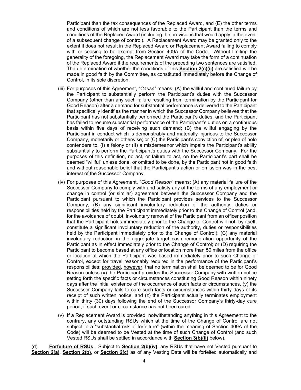 4 Participant than the tax consequences of the Replaced Award, and (E) the other terms and conditions of which are not less favorable to the Participant than the terms and conditions of the Replaced Award (including the provisions that would apply in the event of a subsequent change of control). A Replacement Award may be granted only to the extent it does not result in the Replaced Award or Replacement Award failing to comply with or ceasing to be exempt from Section 409A of the Code. Without limiting the generality of the foregoing, the Replacement Award may take the form of a continuation of the Replaced Award if the requirements of the preceding two sentences are satisfied. The determination of whether the conditions of this Section 2(c)(ii) are satisfied will be made in good faith by the Committee, as constituted immediately before the Change of Control, in its sole discretion. (iii) For purposes of this Agreement, “Cause” means: (A) the willful and continued failure by the Participant to substantially perform the Participant’s duties with the Successor Company (other than any such failure resulting from termination by the Participant for Good Reason) after a demand for substantial performance is delivered to the Participant that specifically identifies the manner in which the Successor Company believes that the Participant has not substantially performed the Participant’s duties, and the Participant has failed to resume substantial performance of the Participant’s duties on a continuous basis within five days of receiving such demand; (B) the willful engaging by the Participant in conduct which is demonstrably and materially injurious to the Successor Company, monetarily or otherwise; or (C) the Participant’s conviction of, or plea of nolo contendere to, (I) a felony or (II) a misdemeanor which impairs the Participant’s ability substantially to perform the Participant’s duties with the Successor Company. For the purposes of this definition, no act, or failure to act, on the Participant’s part shall be deemed “willful” unless done, or omitted to be done, by the Participant not in good faith and without reasonable belief that the Participant’s action or omission was in the best interest of the Successor Company. (iv) For purposes of this Agreement, “Good Reason” means: (A) any material failure of the Successor Company to comply with and satisfy any of the terms of any employment or change in control (or similar) agreement between the Successor Company and the Participant pursuant to which the Participant provides services to the Successor Company; (B) any significant involuntary reduction of the authority, duties or responsibilities held by the Participant immediately prior to the Change of Control (and, for the avoidance of doubt, involuntary removal of the Participant from an officer position that the Participant holds immediately prior to the Change of Control will not, by itself, constitute a significant involuntary reduction of the authority, duties or responsibilities held by the Participant immediately prior to the Change of Control); (C) any material involuntary reduction in the aggregate target cash remuneration opportunity of the Participant as in effect immediately prior to the Change of Control; or (D) requiring the Participant to become based at any office or location more than 50 miles from the office or location at which the Participant was based immediately prior to such Change of Control, except for travel reasonably required in the performance of the Participant’s responsibilities; provided, however, that no termination shall be deemed to be for Good Reason unless (x) the Participant provides the Successor Company with written notice setting forth the specific facts or circumstances constituting Good Reason within ninety days after the initial existence of the occurrence of such facts or circumstances, (y) the Successor Company fails to cure such facts or circumstances within thirty days of its receipt of such written notice, and (z) the Participant actually terminates employment within thirty (30) days following the end of the Successor Company’s thirty-day cure period, if such event or circumstance has not been cured. (v) If a Replacement Award is provided, notwithstanding anything in this Agreement to the contrary, any outstanding RSUs which at the time of the Change of Control are not subject to a “substantial risk of forfeiture” (within the meaning of Section 409A of the Code) will be deemed to be Vested at the time of such Change of Control (and such Vested RSUs shall be settled in accordance with Section 3(b)(ii) below). (d) Forfeiture of RSUs. Subject to Section 2(b)(iv), any RSUs that have not Vested pursuant to Section 2(a), Section 2(b), or Section 2(c) as of any Vesting Date will be forfeited automatically and