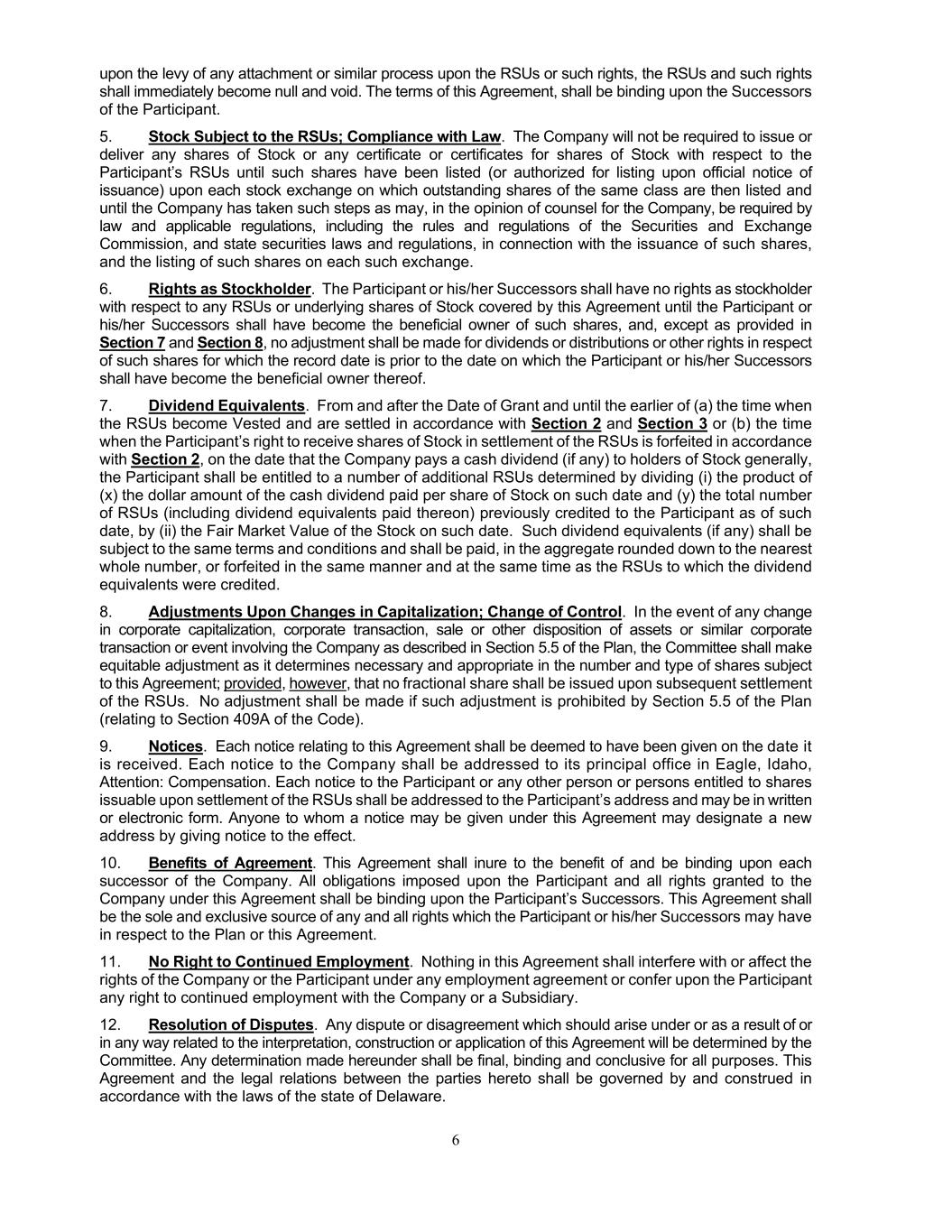 6 upon the levy of any attachment or similar process upon the RSUs or such rights, the RSUs and such rights shall immediately become null and void. The terms of this Agreement, shall be binding upon the Successors of the Participant. 5. Stock Subject to the RSUs; Compliance with Law. The Company will not be required to issue or deliver any shares of Stock or any certificate or certificates for shares of Stock with respect to the Participant’s RSUs until such shares have been listed (or authorized for listing upon official notice of issuance) upon each stock exchange on which outstanding shares of the same class are then listed and until the Company has taken such steps as may, in the opinion of counsel for the Company, be required by law and applicable regulations, including the rules and regulations of the Securities and Exchange Commission, and state securities laws and regulations, in connection with the issuance of such shares, and the listing of such shares on each such exchange. 6. Rights as Stockholder. The Participant or his/her Successors shall have no rights as stockholder with respect to any RSUs or underlying shares of Stock covered by this Agreement until the Participant or his/her Successors shall have become the beneficial owner of such shares, and, except as provided in Section 7 and Section 8, no adjustment shall be made for dividends or distributions or other rights in respect of such shares for which the record date is prior to the date on which the Participant or his/her Successors shall have become the beneficial owner thereof. 7. Dividend Equivalents. From and after the Date of Grant and until the earlier of (a) the time when the RSUs become Vested and are settled in accordance with Section 2 and Section 3 or (b) the time when the Participant’s right to receive shares of Stock in settlement of the RSUs is forfeited in accordance with Section 2, on the date that the Company pays a cash dividend (if any) to holders of Stock generally, the Participant shall be entitled to a number of additional RSUs determined by dividing (i) the product of (x) the dollar amount of the cash dividend paid per share of Stock on such date and (y) the total number of RSUs (including dividend equivalents paid thereon) previously credited to the Participant as of such date, by (ii) the Fair Market Value of the Stock on such date. Such dividend equivalents (if any) shall be subject to the same terms and conditions and shall be paid, in the aggregate rounded down to the nearest whole number, or forfeited in the same manner and at the same time as the RSUs to which the dividend equivalents were credited. 8. Adjustments Upon Changes in Capitalization; Change of Control. In the event of any change in corporate capitalization, corporate transaction, sale or other disposition of assets or similar corporate transaction or event involving the Company as described in Section 5.5 of the Plan, the Committee shall make equitable adjustment as it determines necessary and appropriate in the number and type of shares subject to this Agreement; provided, however, that no fractional share shall be issued upon subsequent settlement of the RSUs. No adjustment shall be made if such adjustment is prohibited by Section 5.5 of the Plan (relating to Section 409A of the Code). 9. Notices. Each notice relating to this Agreement shall be deemed to have been given on the date it is received. Each notice to the Company shall be addressed to its principal office in Eagle, Idaho, Attention: Compensation. Each notice to the Participant or any other person or persons entitled to shares issuable upon settlement of the RSUs shall be addressed to the Participant’s address and may be in written or electronic form. Anyone to whom a notice may be given under this Agreement may designate a new address by giving notice to the effect. 10. Benefits of Agreement. This Agreement shall inure to the benefit of and be binding upon each successor of the Company. All obligations imposed upon the Participant and all rights granted to the Company under this Agreement shall be binding upon the Participant’s Successors. This Agreement shall be the sole and exclusive source of any and all rights which the Participant or his/her Successors may have in respect to the Plan or this Agreement. 11. No Right to Continued Employment. Nothing in this Agreement shall interfere with or affect the rights of the Company or the Participant under any employment agreement or confer upon the Participant any right to continued employment with the Company or a Subsidiary. 12. Resolution of Disputes. Any dispute or disagreement which should arise under or as a result of or in any way related to the interpretation, construction or application of this Agreement will be determined by the Committee. Any determination made hereunder shall be final, binding and conclusive for all purposes. This Agreement and the legal relations between the parties hereto shall be governed by and construed in accordance with the laws of the state of Delaware.