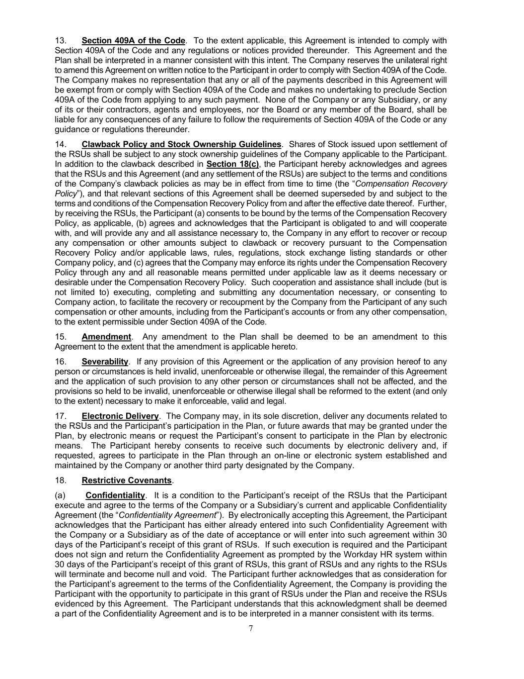 7 13. Section 409A of the Code. To the extent applicable, this Agreement is intended to comply with Section 409A of the Code and any regulations or notices provided thereunder. This Agreement and the Plan shall be interpreted in a manner consistent with this intent. The Company reserves the unilateral right to amend this Agreement on written notice to the Participant in order to comply with Section 409A of the Code. The Company makes no representation that any or all of the payments described in this Agreement will be exempt from or comply with Section 409A of the Code and makes no undertaking to preclude Section 409A of the Code from applying to any such payment. None of the Company or any Subsidiary, or any of its or their contractors, agents and employees, nor the Board or any member of the Board, shall be liable for any consequences of any failure to follow the requirements of Section 409A of the Code or any guidance or regulations thereunder. 14. Clawback Policy and Stock Ownership Guidelines. Shares of Stock issued upon settlement of the RSUs shall be subject to any stock ownership guidelines of the Company applicable to the Participant. In addition to the clawback described in Section 18(c), the Participant hereby acknowledges and agrees that the RSUs and this Agreement (and any settlement of the RSUs) are subject to the terms and conditions of the Company’s clawback policies as may be in effect from time to time (the “Compensation Recovery Policy”), and that relevant sections of this Agreement shall be deemed superseded by and subject to the terms and conditions of the Compensation Recovery Policy from and after the effective date thereof. Further, by receiving the RSUs, the Participant (a) consents to be bound by the terms of the Compensation Recovery Policy, as applicable, (b) agrees and acknowledges that the Participant is obligated to and will cooperate with, and will provide any and all assistance necessary to, the Company in any effort to recover or recoup any compensation or other amounts subject to clawback or recovery pursuant to the Compensation Recovery Policy and/or applicable laws, rules, regulations, stock exchange listing standards or other Company policy, and (c) agrees that the Company may enforce its rights under the Compensation Recovery Policy through any and all reasonable means permitted under applicable law as it deems necessary or desirable under the Compensation Recovery Policy. Such cooperation and assistance shall include (but is not limited to) executing, completing and submitting any documentation necessary, or consenting to Company action, to facilitate the recovery or recoupment by the Company from the Participant of any such compensation or other amounts, including from the Participant’s accounts or from any other compensation, to the extent permissible under Section 409A of the Code. 15. Amendment. Any amendment to the Plan shall be deemed to be an amendment to this Agreement to the extent that the amendment is applicable hereto. 16. Severability. If any provision of this Agreement or the application of any provision hereof to any person or circumstances is held invalid, unenforceable or otherwise illegal, the remainder of this Agreement and the application of such provision to any other person or circumstances shall not be affected, and the provisions so held to be invalid, unenforceable or otherwise illegal shall be reformed to the extent (and only to the extent) necessary to make it enforceable, valid and legal. 17. Electronic Delivery. The Company may, in its sole discretion, deliver any documents related to the RSUs and the Participant’s participation in the Plan, or future awards that may be granted under the Plan, by electronic means or request the Participant’s consent to participate in the Plan by electronic means. The Participant hereby consents to receive such documents by electronic delivery and, if requested, agrees to participate in the Plan through an on-line or electronic system established and maintained by the Company or another third party designated by the Company. 18. Restrictive Covenants. (a) Confidentiality. It is a condition to the Participant’s receipt of the RSUs that the Participant execute and agree to the terms of the Company or a Subsidiary’s current and applicable Confidentiality Agreement (the “Confidentiality Agreement”). By electronically accepting this Agreement, the Participant acknowledges that the Participant has either already entered into such Confidentiality Agreement with the Company or a Subsidiary as of the date of acceptance or will enter into such agreement within 30 days of the Participant’s receipt of this grant of RSUs. If such execution is required and the Participant does not sign and return the Confidentiality Agreement as prompted by the Workday HR system within 30 days of the Participant’s receipt of this grant of RSUs, this grant of RSUs and any rights to the RSUs will terminate and become null and void. The Participant further acknowledges that as consideration for the Participant’s agreement to the terms of the Confidentiality Agreement, the Company is providing the Participant with the opportunity to participate in this grant of RSUs under the Plan and receive the RSUs evidenced by this Agreement. The Participant understands that this acknowledgment shall be deemed a part of the Confidentiality Agreement and is to be interpreted in a manner consistent with its terms.