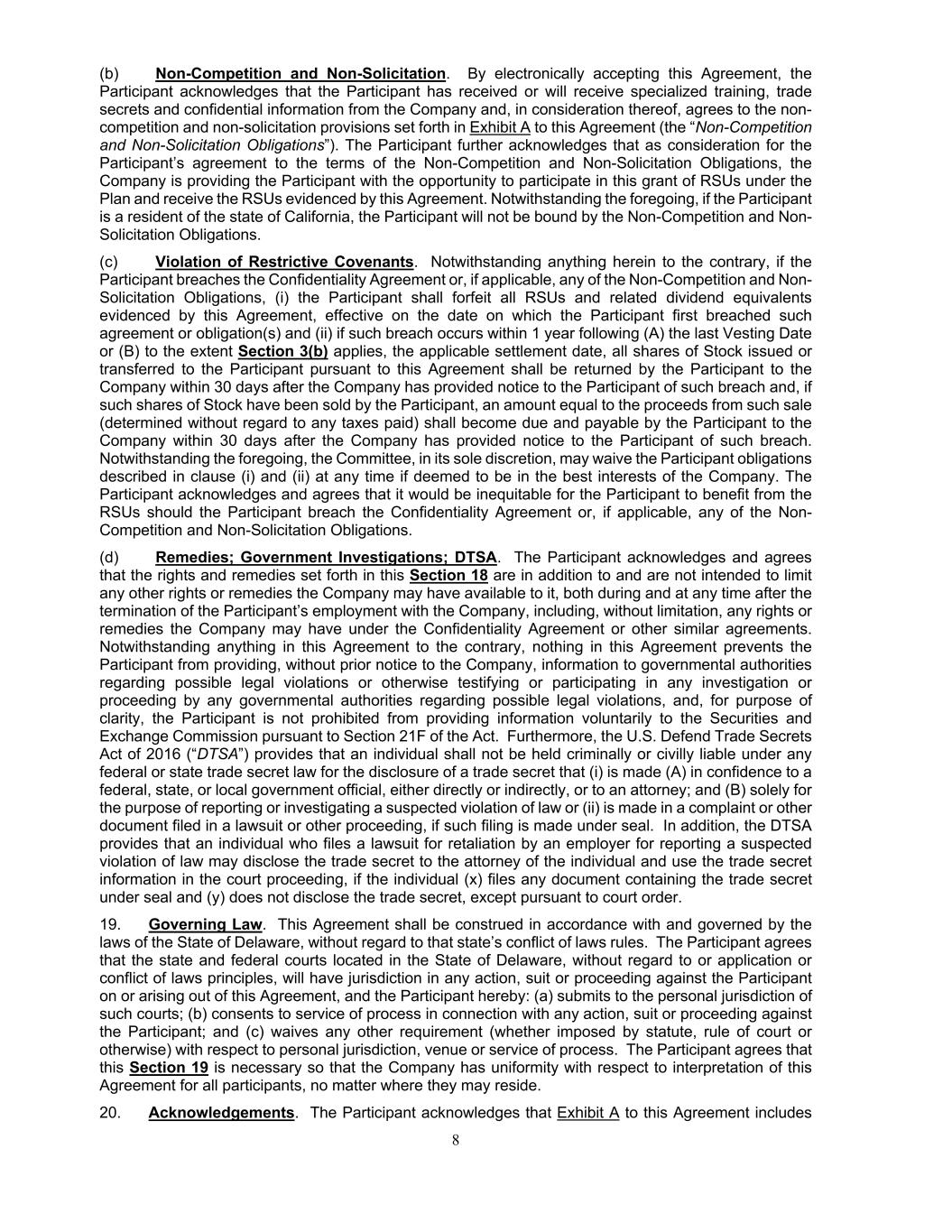8 (b) Non-Competition and Non-Solicitation. By electronically accepting this Agreement, the Participant acknowledges that the Participant has received or will receive specialized training, trade secrets and confidential information from the Company and, in consideration thereof, agrees to the non- competition and non-solicitation provisions set forth in Exhibit A to this Agreement (the “Non-Competition and Non-Solicitation Obligations”). The Participant further acknowledges that as consideration for the Participant’s agreement to the terms of the Non-Competition and Non-Solicitation Obligations, the Company is providing the Participant with the opportunity to participate in this grant of RSUs under the Plan and receive the RSUs evidenced by this Agreement. Notwithstanding the foregoing, if the Participant is a resident of the state of California, the Participant will not be bound by the Non-Competition and Non- Solicitation Obligations. (c) Violation of Restrictive Covenants. Notwithstanding anything herein to the contrary, if the Participant breaches the Confidentiality Agreement or, if applicable, any of the Non-Competition and Non- Solicitation Obligations, (i) the Participant shall forfeit all RSUs and related dividend equivalents evidenced by this Agreement, effective on the date on which the Participant first breached such agreement or obligation(s) and (ii) if such breach occurs within 1 year following (A) the last Vesting Date or (B) to the extent Section 3(b) applies, the applicable settlement date, all shares of Stock issued or transferred to the Participant pursuant to this Agreement shall be returned by the Participant to the Company within 30 days after the Company has provided notice to the Participant of such breach and, if such shares of Stock have been sold by the Participant, an amount equal to the proceeds from such sale (determined without regard to any taxes paid) shall become due and payable by the Participant to the Company within 30 days after the Company has provided notice to the Participant of such breach. Notwithstanding the foregoing, the Committee, in its sole discretion, may waive the Participant obligations described in clause (i) and (ii) at any time if deemed to be in the best interests of the Company. The Participant acknowledges and agrees that it would be inequitable for the Participant to benefit from the RSUs should the Participant breach the Confidentiality Agreement or, if applicable, any of the Non- Competition and Non-Solicitation Obligations. (d) Remedies; Government Investigations; DTSA. The Participant acknowledges and agrees that the rights and remedies set forth in this Section 18 are in addition to and are not intended to limit any other rights or remedies the Company may have available to it, both during and at any time after the termination of the Participant’s employment with the Company, including, without limitation, any rights or remedies the Company may have under the Confidentiality Agreement or other similar agreements. Notwithstanding anything in this Agreement to the contrary, nothing in this Agreement prevents the Participant from providing, without prior notice to the Company, information to governmental authorities regarding possible legal violations or otherwise testifying or participating in any investigation or proceeding by any governmental authorities regarding possible legal violations, and, for purpose of clarity, the Participant is not prohibited from providing information voluntarily to the Securities and Exchange Commission pursuant to Section 21F of the Act. Furthermore, the U.S. Defend Trade Secrets Act of 2016 (“DTSA”) provides that an individual shall not be held criminally or civilly liable under any federal or state trade secret law for the disclosure of a trade secret that (i) is made (A) in confidence to a federal, state, or local government official, either directly or indirectly, or to an attorney; and (B) solely for the purpose of reporting or investigating a suspected violation of law or (ii) is made in a complaint or other document filed in a lawsuit or other proceeding, if such filing is made under seal. In addition, the DTSA provides that an individual who files a lawsuit for retaliation by an employer for reporting a suspected violation of law may disclose the trade secret to the attorney of the individual and use the trade secret information in the court proceeding, if the individual (x) files any document containing the trade secret under seal and (y) does not disclose the trade secret, except pursuant to court order. 19. Governing Law. This Agreement shall be construed in accordance with and governed by the laws of the State of Delaware, without regard to that state’s conflict of laws rules. The Participant agrees that the state and federal courts located in the State of Delaware, without regard to or application or conflict of laws principles, will have jurisdiction in any action, suit or proceeding against the Participant on or arising out of this Agreement, and the Participant hereby: (a) submits to the personal jurisdiction of such courts; (b) consents to service of process in connection with any action, suit or proceeding against the Participant; and (c) waives any other requirement (whether imposed by statute, rule of court or otherwise) with respect to personal jurisdiction, venue or service of process. The Participant agrees that this Section 19 is necessary so that the Company has uniformity with respect to interpretation of this Agreement for all participants, no matter where they may reside. 20. Acknowledgements. The Participant acknowledges that Exhibit A to this Agreement includes