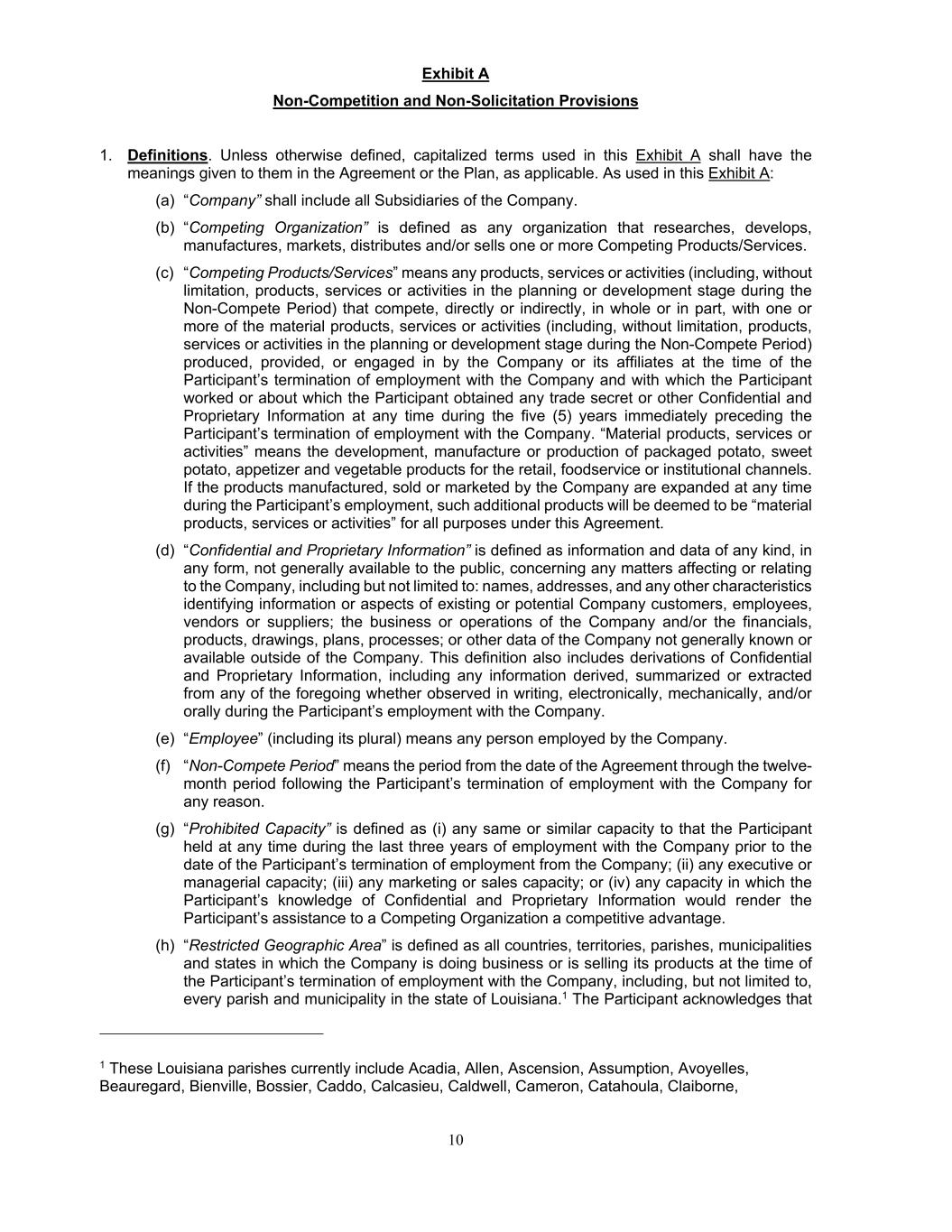 10 Exhibit A Non-Competition and Non-Solicitation Provisions 1. Definitions. Unless otherwise defined, capitalized terms used in this Exhibit A shall have the meanings given to them in the Agreement or the Plan, as applicable. As used in this Exhibit A: (a) “Company” shall include all Subsidiaries of the Company. (b) “Competing Organization” is defined as any organization that researches, develops, manufactures, markets, distributes and/or sells one or more Competing Products/Services. (c) “Competing Products/Services” means any products, services or activities (including, without limitation, products, services or activities in the planning or development stage during the Non-Compete Period) that compete, directly or indirectly, in whole or in part, with one or more of the material products, services or activities (including, without limitation, products, services or activities in the planning or development stage during the Non-Compete Period) produced, provided, or engaged in by the Company or its affiliates at the time of the Participant’s termination of employment with the Company and with which the Participant worked or about which the Participant obtained any trade secret or other Confidential and Proprietary Information at any time during the five (5) years immediately preceding the Participant’s termination of employment with the Company. “Material products, services or activities” means the development, manufacture or production of packaged potato, sweet potato, appetizer and vegetable products for the retail, foodservice or institutional channels. If the products manufactured, sold or marketed by the Company are expanded at any time during the Participant’s employment, such additional products will be deemed to be “material products, services or activities” for all purposes under this Agreement. (d) “Confidential and Proprietary Information” is defined as information and data of any kind, in any form, not generally available to the public, concerning any matters affecting or relating to the Company, including but not limited to: names, addresses, and any other characteristics identifying information or aspects of existing or potential Company customers, employees, vendors or suppliers; the business or operations of the Company and/or the financials, products, drawings, plans, processes; or other data of the Company not generally known or available outside of the Company. This definition also includes derivations of Confidential and Proprietary Information, including any information derived, summarized or extracted from any of the foregoing whether observed in writing, electronically, mechanically, and/or orally during the Participant’s employment with the Company. (e) “Employee” (including its plural) means any person employed by the Company. (f) “Non-Compete Period” means the period from the date of the Agreement through the twelve- month period following the Participant’s termination of employment with the Company for any reason. (g) “Prohibited Capacity” is defined as (i) any same or similar capacity to that the Participant held at any time during the last three years of employment with the Company prior to the date of the Participant’s termination of employment from the Company; (ii) any executive or managerial capacity; (iii) any marketing or sales capacity; or (iv) any capacity in which the Participant’s knowledge of Confidential and Proprietary Information would render the Participant’s assistance to a Competing Organization a competitive advantage. (h) “Restricted Geographic Area” is defined as all countries, territories, parishes, municipalities and states in which the Company is doing business or is selling its products at the time of the Participant’s termination of employment with the Company, including, but not limited to, every parish and municipality in the state of Louisiana.1 The Participant acknowledges that 1 These Louisiana parishes currently include Acadia, Allen, Ascension, Assumption, Avoyelles, Beauregard, Bienville, Bossier, Caddo, Calcasieu, Caldwell, Cameron, Catahoula, Claiborne,