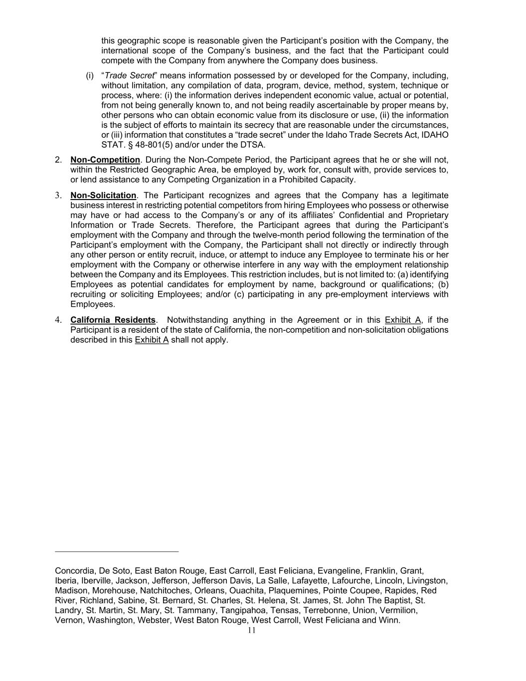 11 this geographic scope is reasonable given the Participant’s position with the Company, the international scope of the Company’s business, and the fact that the Participant could compete with the Company from anywhere the Company does business. (i) “Trade Secret” means information possessed by or developed for the Company, including, without limitation, any compilation of data, program, device, method, system, technique or process, where: (i) the information derives independent economic value, actual or potential, from not being generally known to, and not being readily ascertainable by proper means by, other persons who can obtain economic value from its disclosure or use, (ii) the information is the subject of efforts to maintain its secrecy that are reasonable under the circumstances, or (iii) information that constitutes a “trade secret” under the Idaho Trade Secrets Act, IDAHO STAT. § 48-801(5) and/or under the DTSA. 2. Non-Competition. During the Non-Compete Period, the Participant agrees that he or she will not, within the Restricted Geographic Area, be employed by, work for, consult with, provide services to, or lend assistance to any Competing Organization in a Prohibited Capacity. 3. Non-Solicitation. The Participant recognizes and agrees that the Company has a legitimate business interest in restricting potential competitors from hiring Employees who possess or otherwise may have or had access to the Company’s or any of its affiliates’ Confidential and Proprietary Information or Trade Secrets. Therefore, the Participant agrees that during the Participant’s employment with the Company and through the twelve-month period following the termination of the Participant’s employment with the Company, the Participant shall not directly or indirectly through any other person or entity recruit, induce, or attempt to induce any Employee to terminate his or her employment with the Company or otherwise interfere in any way with the employment relationship between the Company and its Employees. This restriction includes, but is not limited to: (a) identifying Employees as potential candidates for employment by name, background or qualifications; (b) recruiting or soliciting Employees; and/or (c) participating in any pre-employment interviews with Employees. 4. California Residents. Notwithstanding anything in the Agreement or in this Exhibit A, if the Participant is a resident of the state of California, the non-competition and non-solicitation obligations described in this Exhibit A shall not apply. Concordia, De Soto, East Baton Rouge, East Carroll, East Feliciana, Evangeline, Franklin, Grant, Iberia, Iberville, Jackson, Jefferson, Jefferson Davis, La Salle, Lafayette, Lafourche, Lincoln, Livingston, Madison, Morehouse, Natchitoches, Orleans, Ouachita, Plaquemines, Pointe Coupee, Rapides, Red River, Richland, Sabine, St. Bernard, St. Charles, St. Helena, St. James, St. John The Baptist, St. Landry, St. Martin, St. Mary, St. Tammany, Tangipahoa, Tensas, Terrebonne, Union, Vermilion, Vernon, Washington, Webster, West Baton Rouge, West Carroll, West Feliciana and Winn.