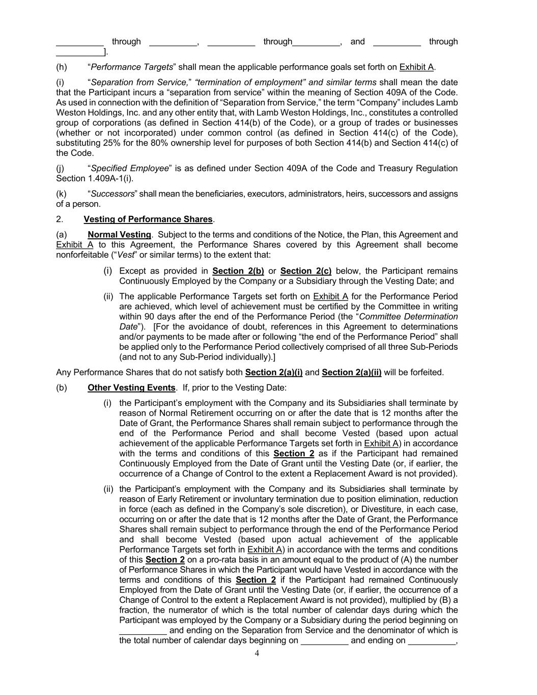 4 __________ through __________, __________ through__________, and __________ through __________]. (h) “Performance Targets” shall mean the applicable performance goals set forth on Exhibit A. (i) “Separation from Service,” “termination of employment” and similar terms shall mean the date that the Participant incurs a “separation from service” within the meaning of Section 409A of the Code. As used in connection with the definition of “Separation from Service,” the term “Company” includes Lamb Weston Holdings, Inc. and any other entity that, with Lamb Weston Holdings, Inc., constitutes a controlled group of corporations (as defined in Section 414(b) of the Code), or a group of trades or businesses (whether or not incorporated) under common control (as defined in Section 414(c) of the Code), substituting 25% for the 80% ownership level for purposes of both Section 414(b) and Section 414(c) of the Code. (j) “Specified Employee” is as defined under Section 409A of the Code and Treasury Regulation Section 1.409A-1(i). (k) “Successors” shall mean the beneficiaries, executors, administrators, heirs, successors and assigns of a person. 2. Vesting of Performance Shares. (a) Normal Vesting. Subject to the terms and conditions of the Notice, the Plan, this Agreement and Exhibit A to this Agreement, the Performance Shares covered by this Agreement shall become nonforfeitable (“Vest” or similar terms) to the extent that: (i) Except as provided in Section 2(b) or Section 2(c) below, the Participant remains Continuously Employed by the Company or a Subsidiary through the Vesting Date; and (ii) The applicable Performance Targets set forth on Exhibit A for the Performance Period are achieved, which level of achievement must be certified by the Committee in writing within 90 days after the end of the Performance Period (the “Committee Determination Date”). [For the avoidance of doubt, references in this Agreement to determinations and/or payments to be made after or following “the end of the Performance Period” shall be applied only to the Performance Period collectively comprised of all three Sub-Periods (and not to any Sub-Period individually).] Any Performance Shares that do not satisfy both Section 2(a)(i) and Section 2(a)(ii) will be forfeited. (b) Other Vesting Events. If, prior to the Vesting Date: (i) the Participant’s employment with the Company and its Subsidiaries shall terminate by reason of Normal Retirement occurring on or after the date that is 12 months after the Date of Grant, the Performance Shares shall remain subject to performance through the end of the Performance Period and shall become Vested (based upon actual achievement of the applicable Performance Targets set forth in Exhibit A) in accordance with the terms and conditions of this Section 2 as if the Participant had remained Continuously Employed from the Date of Grant until the Vesting Date (or, if earlier, the occurrence of a Change of Control to the extent a Replacement Award is not provided). (ii) the Participant’s employment with the Company and its Subsidiaries shall terminate by reason of Early Retirement or involuntary termination due to position elimination, reduction in force (each as defined in the Company’s sole discretion), or Divestiture, in each case, occurring on or after the date that is 12 months after the Date of Grant, the Performance Shares shall remain subject to performance through the end of the Performance Period and shall become Vested (based upon actual achievement of the applicable Performance Targets set forth in Exhibit A) in accordance with the terms and conditions of this Section 2 on a pro-rata basis in an amount equal to the product of (A) the number of Performance Shares in which the Participant would have Vested in accordance with the terms and conditions of this Section 2 if the Participant had remained Continuously Employed from the Date of Grant until the Vesting Date (or, if earlier, the occurrence of a Change of Control to the extent a Replacement Award is not provided), multiplied by (B) a fraction, the numerator of which is the total number of calendar days during which the Participant was employed by the Company or a Subsidiary during the period beginning on __________ and ending on the Separation from Service and the denominator of which is the total number of calendar days beginning on __________ and ending on __________,