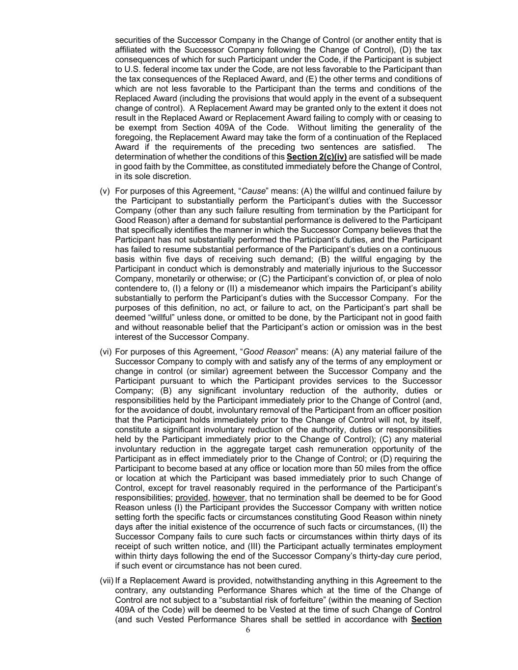 6 securities of the Successor Company in the Change of Control (or another entity that is affiliated with the Successor Company following the Change of Control), (D) the tax consequences of which for such Participant under the Code, if the Participant is subject to U.S. federal income tax under the Code, are not less favorable to the Participant than the tax consequences of the Replaced Award, and (E) the other terms and conditions of which are not less favorable to the Participant than the terms and conditions of the Replaced Award (including the provisions that would apply in the event of a subsequent change of control). A Replacement Award may be granted only to the extent it does not result in the Replaced Award or Replacement Award failing to comply with or ceasing to be exempt from Section 409A of the Code. Without limiting the generality of the foregoing, the Replacement Award may take the form of a continuation of the Replaced Award if the requirements of the preceding two sentences are satisfied. The determination of whether the conditions of this Section 2(c)(iv) are satisfied will be made in good faith by the Committee, as constituted immediately before the Change of Control, in its sole discretion. (v) For purposes of this Agreement, “Cause” means: (A) the willful and continued failure by the Participant to substantially perform the Participant’s duties with the Successor Company (other than any such failure resulting from termination by the Participant for Good Reason) after a demand for substantial performance is delivered to the Participant that specifically identifies the manner in which the Successor Company believes that the Participant has not substantially performed the Participant’s duties, and the Participant has failed to resume substantial performance of the Participant’s duties on a continuous basis within five days of receiving such demand; (B) the willful engaging by the Participant in conduct which is demonstrably and materially injurious to the Successor Company, monetarily or otherwise; or (C) the Participant’s conviction of, or plea of nolo contendere to, (I) a felony or (II) a misdemeanor which impairs the Participant’s ability substantially to perform the Participant’s duties with the Successor Company. For the purposes of this definition, no act, or failure to act, on the Participant’s part shall be deemed “willful” unless done, or omitted to be done, by the Participant not in good faith and without reasonable belief that the Participant’s action or omission was in the best interest of the Successor Company. (vi) For purposes of this Agreement, “Good Reason” means: (A) any material failure of the Successor Company to comply with and satisfy any of the terms of any employment or change in control (or similar) agreement between the Successor Company and the Participant pursuant to which the Participant provides services to the Successor Company; (B) any significant involuntary reduction of the authority, duties or responsibilities held by the Participant immediately prior to the Change of Control (and, for the avoidance of doubt, involuntary removal of the Participant from an officer position that the Participant holds immediately prior to the Change of Control will not, by itself, constitute a significant involuntary reduction of the authority, duties or responsibilities held by the Participant immediately prior to the Change of Control); (C) any material involuntary reduction in the aggregate target cash remuneration opportunity of the Participant as in effect immediately prior to the Change of Control; or (D) requiring the Participant to become based at any office or location more than 50 miles from the office or location at which the Participant was based immediately prior to such Change of Control, except for travel reasonably required in the performance of the Participant’s responsibilities; provided, however, that no termination shall be deemed to be for Good Reason unless (I) the Participant provides the Successor Company with written notice setting forth the specific facts or circumstances constituting Good Reason within ninety days after the initial existence of the occurrence of such facts or circumstances, (II) the Successor Company fails to cure such facts or circumstances within thirty days of its receipt of such written notice, and (III) the Participant actually terminates employment within thirty days following the end of the Successor Company’s thirty-day cure period, if such event or circumstance has not been cured. (vii) If a Replacement Award is provided, notwithstanding anything in this Agreement to the contrary, any outstanding Performance Shares which at the time of the Change of Control are not subject to a “substantial risk of forfeiture” (within the meaning of Section 409A of the Code) will be deemed to be Vested at the time of such Change of Control (and such Vested Performance Shares shall be settled in accordance with Section