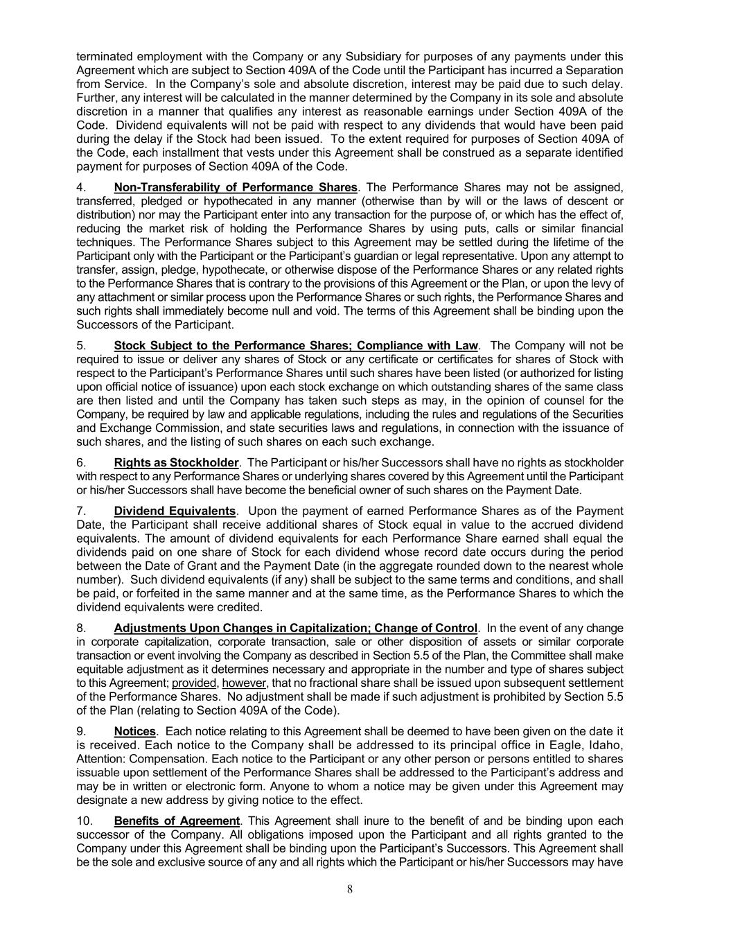 8 terminated employment with the Company or any Subsidiary for purposes of any payments under this Agreement which are subject to Section 409A of the Code until the Participant has incurred a Separation from Service. In the Company’s sole and absolute discretion, interest may be paid due to such delay. Further, any interest will be calculated in the manner determined by the Company in its sole and absolute discretion in a manner that qualifies any interest as reasonable earnings under Section 409A of the Code. Dividend equivalents will not be paid with respect to any dividends that would have been paid during the delay if the Stock had been issued. To the extent required for purposes of Section 409A of the Code, each installment that vests under this Agreement shall be construed as a separate identified payment for purposes of Section 409A of the Code. 4. Non-Transferability of Performance Shares. The Performance Shares may not be assigned, transferred, pledged or hypothecated in any manner (otherwise than by will or the laws of descent or distribution) nor may the Participant enter into any transaction for the purpose of, or which has the effect of, reducing the market risk of holding the Performance Shares by using puts, calls or similar financial techniques. The Performance Shares subject to this Agreement may be settled during the lifetime of the Participant only with the Participant or the Participant’s guardian or legal representative. Upon any attempt to transfer, assign, pledge, hypothecate, or otherwise dispose of the Performance Shares or any related rights to the Performance Shares that is contrary to the provisions of this Agreement or the Plan, or upon the levy of any attachment or similar process upon the Performance Shares or such rights, the Performance Shares and such rights shall immediately become null and void. The terms of this Agreement shall be binding upon the Successors of the Participant. 5. Stock Subject to the Performance Shares; Compliance with Law. The Company will not be required to issue or deliver any shares of Stock or any certificate or certificates for shares of Stock with respect to the Participant’s Performance Shares until such shares have been listed (or authorized for listing upon official notice of issuance) upon each stock exchange on which outstanding shares of the same class are then listed and until the Company has taken such steps as may, in the opinion of counsel for the Company, be required by law and applicable regulations, including the rules and regulations of the Securities and Exchange Commission, and state securities laws and regulations, in connection with the issuance of such shares, and the listing of such shares on each such exchange. 6. Rights as Stockholder. The Participant or his/her Successors shall have no rights as stockholder with respect to any Performance Shares or underlying shares covered by this Agreement until the Participant or his/her Successors shall have become the beneficial owner of such shares on the Payment Date. 7. Dividend Equivalents. Upon the payment of earned Performance Shares as of the Payment Date, the Participant shall receive additional shares of Stock equal in value to the accrued dividend equivalents. The amount of dividend equivalents for each Performance Share earned shall equal the dividends paid on one share of Stock for each dividend whose record date occurs during the period between the Date of Grant and the Payment Date (in the aggregate rounded down to the nearest whole number). Such dividend equivalents (if any) shall be subject to the same terms and conditions, and shall be paid, or forfeited in the same manner and at the same time, as the Performance Shares to which the dividend equivalents were credited. 8. Adjustments Upon Changes in Capitalization; Change of Control. In the event of any change in corporate capitalization, corporate transaction, sale or other disposition of assets or similar corporate transaction or event involving the Company as described in Section 5.5 of the Plan, the Committee shall make equitable adjustment as it determines necessary and appropriate in the number and type of shares subject to this Agreement; provided, however, that no fractional share shall be issued upon subsequent settlement of the Performance Shares. No adjustment shall be made if such adjustment is prohibited by Section 5.5 of the Plan (relating to Section 409A of the Code). 9. Notices. Each notice relating to this Agreement shall be deemed to have been given on the date it is received. Each notice to the Company shall be addressed to its principal office in Eagle, Idaho, Attention: Compensation. Each notice to the Participant or any other person or persons entitled to shares issuable upon settlement of the Performance Shares shall be addressed to the Participant’s address and may be in written or electronic form. Anyone to whom a notice may be given under this Agreement may designate a new address by giving notice to the effect. 10. Benefits of Agreement. This Agreement shall inure to the benefit of and be binding upon each successor of the Company. All obligations imposed upon the Participant and all rights granted to the Company under this Agreement shall be binding upon the Participant’s Successors. This Agreement shall be the sole and exclusive source of any and all rights which the Participant or his/her Successors may have