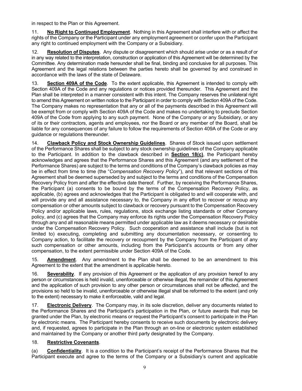 9 in respect to the Plan or this Agreement. 11. No Right to Continued Employment. Nothing in this Agreement shall interfere with or affect the rights of the Company or the Participant under any employment agreement or confer upon the Participant any right to continued employment with the Company or a Subsidiary. 12. Resolution of Disputes. Any dispute or disagreement which should arise under or as a result of or in any way related to the interpretation, construction or application of this Agreement will be determined by the Committee. Any determination made hereunder shall be final, binding and conclusive for all purposes. This Agreement and the legal relations between the parties hereto shall be governed by and construed in accordance with the laws of the state of Delaware. 13. Section 409A of the Code. To the extent applicable, this Agreement is intended to comply with Section 409A of the Code and any regulations or notices provided thereunder. This Agreement and the Plan shall be interpreted in a manner consistent with this intent. The Company reserves the unilateral right to amend this Agreement on written notice to the Participant in order to comply with Section 409A of the Code. The Company makes no representation that any or all of the payments described in this Agreement will be exempt from or comply with Section 409A of the Code and makes no undertaking to preclude Section 409A of the Code from applying to any such payment. None of the Company or any Subsidiary, or any of its or their contractors, agents and employees, nor the Board or any member of the Board, shall be liable for any consequences of any failure to follow the requirements of Section 409A of the Code or any guidance or regulations thereunder. 14. Clawback Policy and Stock Ownership Guidelines. Shares of Stock issued upon settlement of the Performance Shares shall be subject to any stock ownership guidelines of the Company applicable to the Participant. In addition to the clawback described in Section 18(c), the Participant hereby acknowledges and agrees that the Performance Shares and this Agreement (and any settlement of the Performance Shares) are subject to the terms and conditions of the Company’s clawback policies as may be in effect from time to time (the “Compensation Recovery Policy”), and that relevant sections of this Agreement shall be deemed superseded by and subject to the terms and conditions of the Compensation Recovery Policy from and after the effective date thereof. Further, by receiving the Performance Shares, the Participant (a) consents to be bound by the terms of the Compensation Recovery Policy, as applicable, (b) agrees and acknowledges that the Participant is obligated to and will cooperate with, and will provide any and all assistance necessary to, the Company in any effort to recover or recoup any compensation or other amounts subject to clawback or recovery pursuant to the Compensation Recovery Policy and/or applicable laws, rules, regulations, stock exchange listing standards or other Company policy, and (c) agrees that the Company may enforce its rights under the Compensation Recovery Policy through any and all reasonable means permitted under applicable law as it deems necessary or desirable under the Compensation Recovery Policy. Such cooperation and assistance shall include (but is not limited to) executing, completing and submitting any documentation necessary, or consenting to Company action, to facilitate the recovery or recoupment by the Company from the Participant of any such compensation or other amounts, including from the Participant’s accounts or from any other compensation, to the extent permissible under Section 409A of the Code. 15. Amendment. Any amendment to the Plan shall be deemed to be an amendment to this Agreement to the extent that the amendment is applicable hereto. 16. Severability. If any provision of this Agreement or the application of any provision hereof to any person or circumstances is held invalid, unenforceable or otherwise illegal, the remainder of this Agreement and the application of such provision to any other person or circumstances shall not be affected, and the provisions so held to be invalid, unenforceable or otherwise illegal shall be reformed to the extent (and only to the extent) necessary to make it enforceable, valid and legal. 17. Electronic Delivery. The Company may, in its sole discretion, deliver any documents related to the Performance Shares and the Participant’s participation in the Plan, or future awards that may be granted under the Plan, by electronic means or request the Participant’s consent to participate in the Plan by electronic means. The Participant hereby consents to receive such documents by electronic delivery and, if requested, agrees to participate in the Plan through an on-line or electronic system established and maintained by the Company or another third party designated by the Company. 18. Restrictive Covenants. (a) Confidentiality. It is a condition to the Participant’s receipt of the Performance Shares that the Participant execute and agree to the terms of the Company or a Subsidiary’s current and applicable