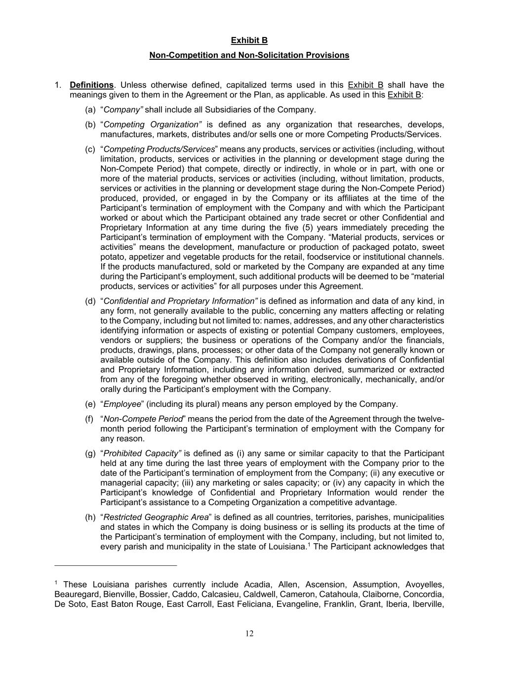 12 Exhibit B Non-Competition and Non-Solicitation Provisions 1. Definitions. Unless otherwise defined, capitalized terms used in this Exhibit B shall have the meanings given to them in the Agreement or the Plan, as applicable. As used in this Exhibit B: (a) “Company” shall include all Subsidiaries of the Company. (b) “Competing Organization” is defined as any organization that researches, develops, manufactures, markets, distributes and/or sells one or more Competing Products/Services. (c) “Competing Products/Services” means any products, services or activities (including, without limitation, products, services or activities in the planning or development stage during the Non-Compete Period) that compete, directly or indirectly, in whole or in part, with one or more of the material products, services or activities (including, without limitation, products, services or activities in the planning or development stage during the Non-Compete Period) produced, provided, or engaged in by the Company or its affiliates at the time of the Participant’s termination of employment with the Company and with which the Participant worked or about which the Participant obtained any trade secret or other Confidential and Proprietary Information at any time during the five (5) years immediately preceding the Participant’s termination of employment with the Company. “Material products, services or activities” means the development, manufacture or production of packaged potato, sweet potato, appetizer and vegetable products for the retail, foodservice or institutional channels. If the products manufactured, sold or marketed by the Company are expanded at any time during the Participant’s employment, such additional products will be deemed to be “material products, services or activities” for all purposes under this Agreement. (d) “Confidential and Proprietary Information” is defined as information and data of any kind, in any form, not generally available to the public, concerning any matters affecting or relating to the Company, including but not limited to: names, addresses, and any other characteristics identifying information or aspects of existing or potential Company customers, employees, vendors or suppliers; the business or operations of the Company and/or the financials, products, drawings, plans, processes; or other data of the Company not generally known or available outside of the Company. This definition also includes derivations of Confidential and Proprietary Information, including any information derived, summarized or extracted from any of the foregoing whether observed in writing, electronically, mechanically, and/or orally during the Participant’s employment with the Company. (e) “Employee” (including its plural) means any person employed by the Company. (f) “Non-Compete Period” means the period from the date of the Agreement through the twelve- month period following the Participant’s termination of employment with the Company for any reason. (g) “Prohibited Capacity” is defined as (i) any same or similar capacity to that the Participant held at any time during the last three years of employment with the Company prior to the date of the Participant’s termination of employment from the Company; (ii) any executive or managerial capacity; (iii) any marketing or sales capacity; or (iv) any capacity in which the Participant’s knowledge of Confidential and Proprietary Information would render the Participant’s assistance to a Competing Organization a competitive advantage. (h) “Restricted Geographic Area” is defined as all countries, territories, parishes, municipalities and states in which the Company is doing business or is selling its products at the time of the Participant’s termination of employment with the Company, including, but not limited to, every parish and municipality in the state of Louisiana.1 The Participant acknowledges that 1 These Louisiana parishes currently include Acadia, Allen, Ascension, Assumption, Avoyelles, Beauregard, Bienville, Bossier, Caddo, Calcasieu, Caldwell, Cameron, Catahoula, Claiborne, Concordia, De Soto, East Baton Rouge, East Carroll, East Feliciana, Evangeline, Franklin, Grant, Iberia, Iberville,