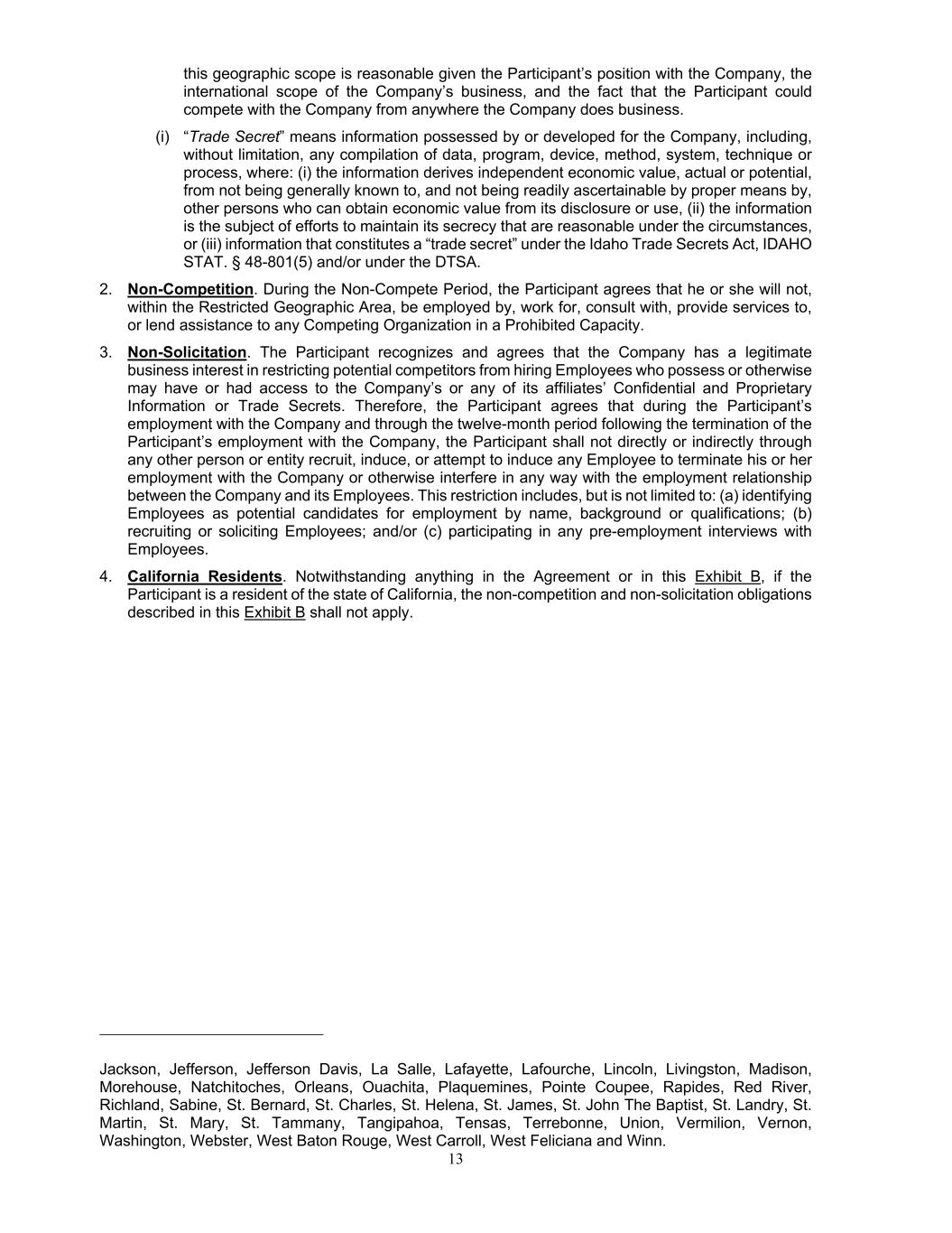 13 this geographic scope is reasonable given the Participant’s position with the Company, the international scope of the Company’s business, and the fact that the Participant could compete with the Company from anywhere the Company does business. (i) “Trade Secret” means information possessed by or developed for the Company, including, without limitation, any compilation of data, program, device, method, system, technique or process, where: (i) the information derives independent economic value, actual or potential, from not being generally known to, and not being readily ascertainable by proper means by, other persons who can obtain economic value from its disclosure or use, (ii) the information is the subject of efforts to maintain its secrecy that are reasonable under the circumstances, or (iii) information that constitutes a “trade secret” under the Idaho Trade Secrets Act, IDAHO STAT. § 48-801(5) and/or under the DTSA. 2. Non-Competition. During the Non-Compete Period, the Participant agrees that he or she will not, within the Restricted Geographic Area, be employed by, work for, consult with, provide services to, or lend assistance to any Competing Organization in a Prohibited Capacity. 3. Non-Solicitation. The Participant recognizes and agrees that the Company has a legitimate business interest in restricting potential competitors from hiring Employees who possess or otherwise may have or had access to the Company’s or any of its affiliates’ Confidential and Proprietary Information or Trade Secrets. Therefore, the Participant agrees that during the Participant’s employment with the Company and through the twelve-month period following the termination of the Participant’s employment with the Company, the Participant shall not directly or indirectly through any other person or entity recruit, induce, or attempt to induce any Employee to terminate his or her employment with the Company or otherwise interfere in any way with the employment relationship between the Company and its Employees. This restriction includes, but is not limited to: (a) identifying Employees as potential candidates for employment by name, background or qualifications; (b) recruiting or soliciting Employees; and/or (c) participating in any pre-employment interviews with Employees. 4. California Residents. Notwithstanding anything in the Agreement or in this Exhibit B, if the Participant is a resident of the state of California, the non-competition and non-solicitation obligations described in this Exhibit B shall not apply. Jackson, Jefferson, Jefferson Davis, La Salle, Lafayette, Lafourche, Lincoln, Livingston, Madison, Morehouse, Natchitoches, Orleans, Ouachita, Plaquemines, Pointe Coupee, Rapides, Red River, Richland, Sabine, St. Bernard, St. Charles, St. Helena, St. James, St. John The Baptist, St. Landry, St. Martin, St. Mary, St. Tammany, Tangipahoa, Tensas, Terrebonne, Union, Vermilion, Vernon, Washington, Webster, West Baton Rouge, West Carroll, West Feliciana and Winn.