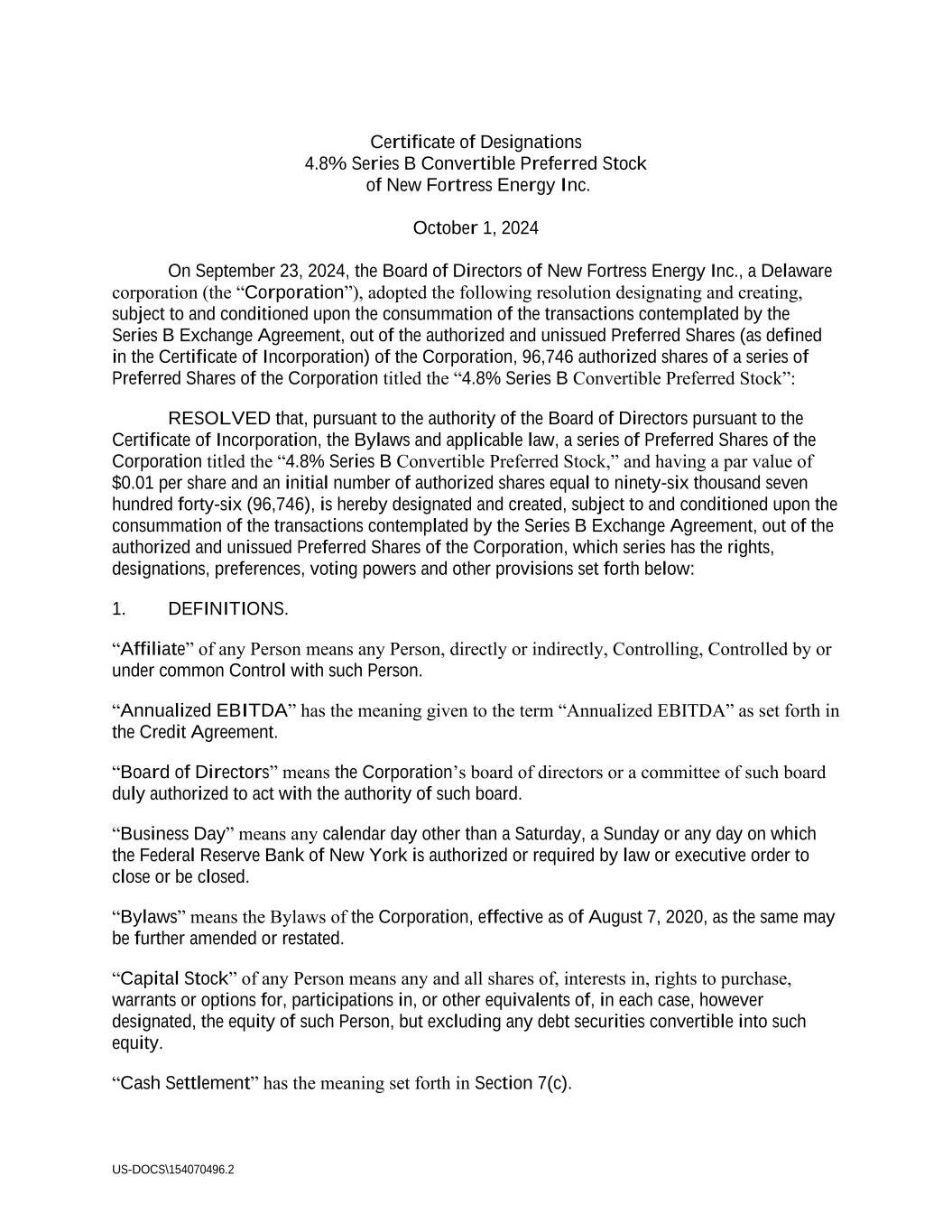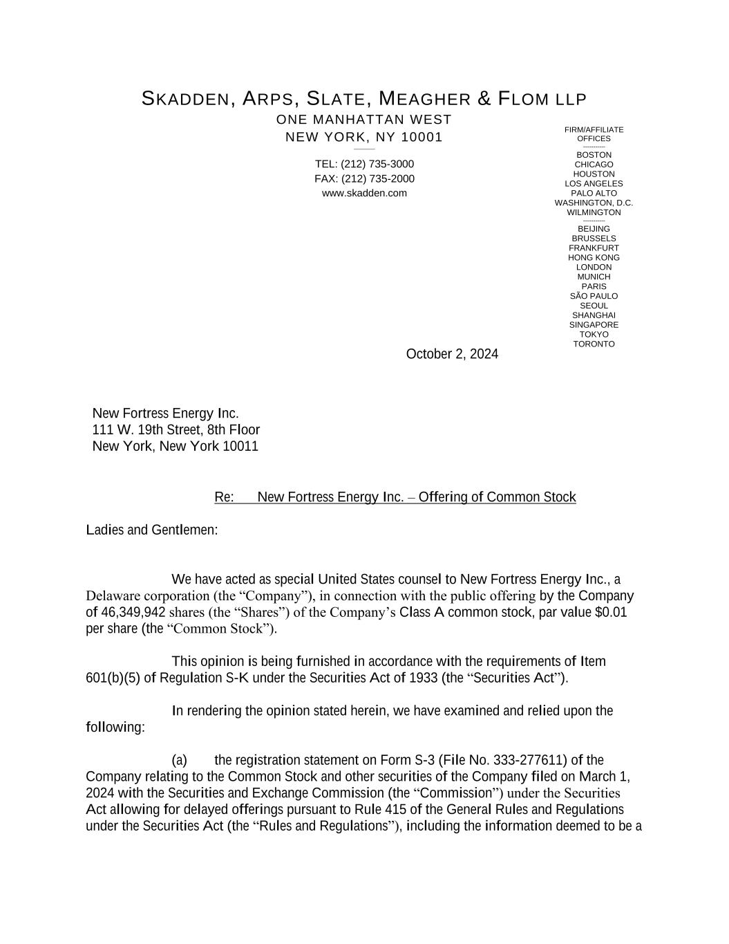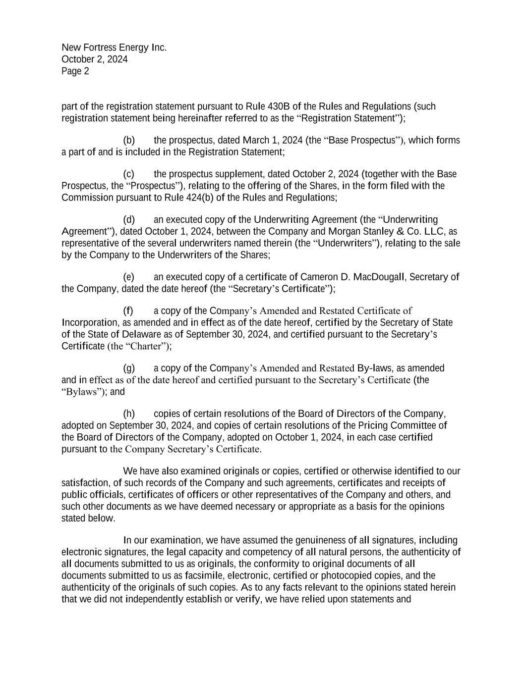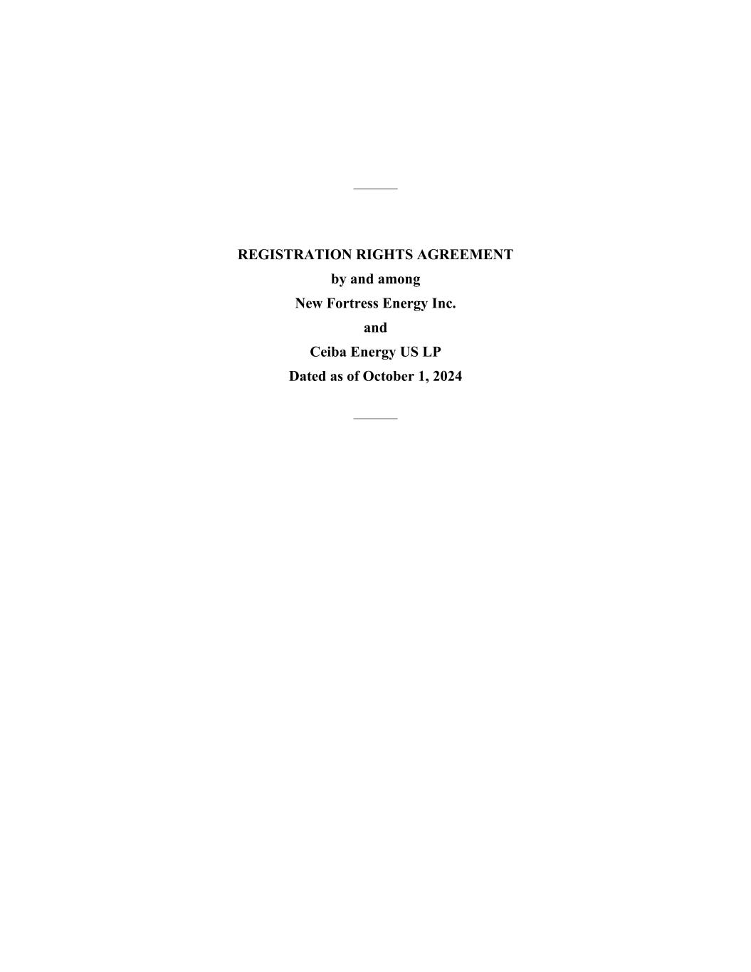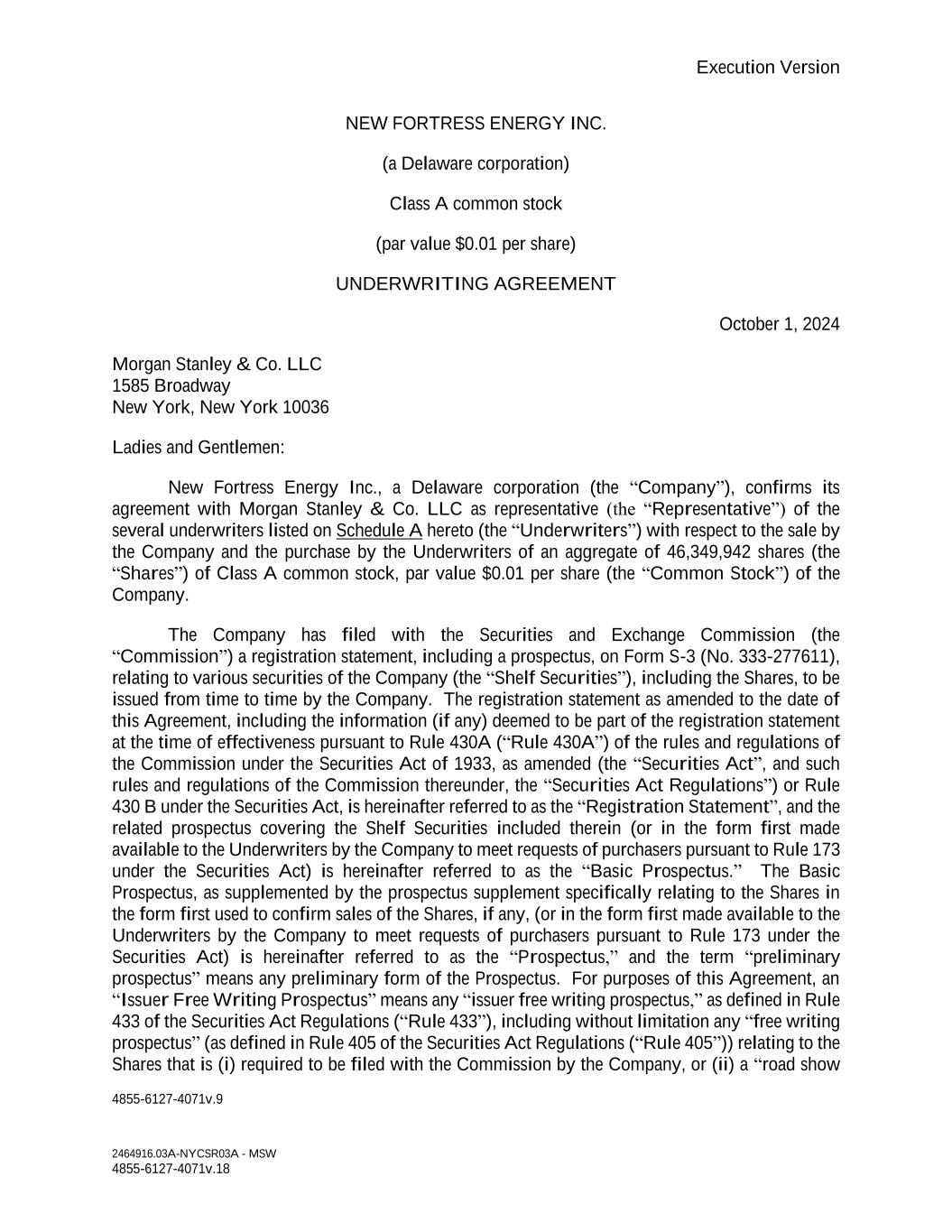 Execution Version 4855-6127-4071v.9 2464916.03A-NYCSR03A - MSW 4855-6127-4071v.18 NEW FORTRESS ENERGY INC. (a Delaware corporation) Class A common stock (par value $0.01 per share) UNDERWRITING AGREEMENT October 1, 2024 Morgan Stanley & Co. LLC 1585 Broadway New York, New York 10036 Ladies and Gentlemen: New Fortress Energy Inc., a Delaware corporation (the “Company”), confirms its agreement with Morgan Stanley & Co. LLC as representative (the “Representative”) of the several underwriters listed on Schedule A hereto (the “Underwriters”) with respect to the sale by the Company and the purchase by the Underwriters of an aggregate of 46,349,942 shares (the “Shares”) of Class A common stock, par value $0.01 per share (the “Common Stock”) of the Company. The Company has filed with the Securities and Exchange Commission (the “Commission”) a registration statement, including a prospectus, on Form S-3 (No. 333-277611), relating to various securities of the Company (the “Shelf Securities”), including the Shares, to be issued from time to time by the Company. The registration statement as amended to the date of this Agreement, including the information (if any) deemed to be part of the registration statement at the time of effectiveness pursuant to Rule 430A (“Rule 430A”) of the rules and regulations of the Commission under the Securities Act of 1933, as amended (the “Securities Act”, and such rules and regulations of the Commission thereunder, the “Securities Act Regulations”) or Rule 430 B under the Securities Act, is hereinafter referred to as the “Registration Statement”, and the related prospectus covering the Shelf Securities included therein (or in the form first made available to the Underwriters by the Company to meet requests of purchasers pursuant to Rule 173 under the Securities Act) is hereinafter referred to as the “Basic Prospectus.” The Basic Prospectus, as supplemented by the prospectus supplement specifically relating to the Shares in the form first used to confirm sales of the Shares, if any, (or in the form first made available to the Underwriters by the Company to meet requests of purchasers pursuant to Rule 173 under the Securities Act) is hereinafter referred to as the “Prospectus,” and the term “preliminary prospectus” means any preliminary form of the Prospectus. For purposes of this Agreement, an “Issuer Free Writing Prospectus” means any “issuer free writing prospectus,” as defined in Rule 433 of the Securities Act Regulations (“Rule 433”), including without limitation any “free writing prospectus” (as defined in Rule 405 of the Securities Act Regulations (“Rule 405”)) relating to the Shares that is (i) required to be filed with the Commission by the Company, or (ii) a “road show