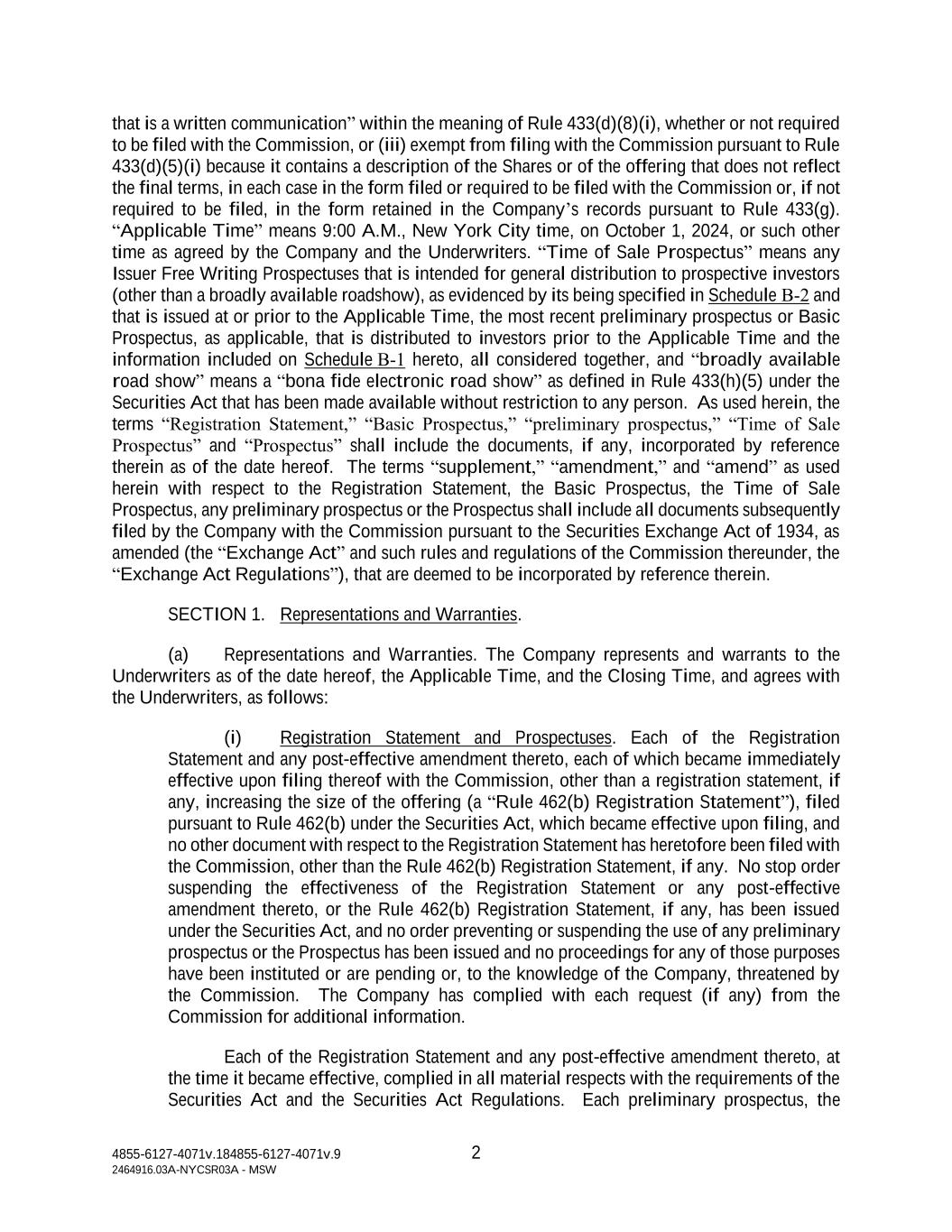 4855-6127-4071v.184855-6127-4071v.9 2 2464916.03A-NYCSR03A - MSW that is a written communication” within the meaning of Rule 433(d)(8)(i), whether or not required to be filed with the Commission, or (iii) exempt from filing with the Commission pursuant to Rule 433(d)(5)(i) because it contains a description of the Shares or of the offering that does not reflect the final terms, in each case in the form filed or required to be filed with the Commission or, if not required to be filed, in the form retained in the Company’s records pursuant to Rule 433(g). “Applicable Time” means 9:00 A.M., New York City time, on October 1, 2024, or such other time as agreed by the Company and the Underwriters. “Time of Sale Prospectus” means any Issuer Free Writing Prospectuses that is intended for general distribution to prospective investors (other than a broadly available roadshow), as evidenced by its being specified in Schedule B‑2 and that is issued at or prior to the Applicable Time, the most recent preliminary prospectus or Basic Prospectus, as applicable, that is distributed to investors prior to the Applicable Time and the information included on Schedule B‑1 hereto, all considered together, and “broadly available road show” means a “bona fide electronic road show” as defined in Rule 433(h)(5) under the Securities Act that has been made available without restriction to any person. As used herein, the terms “Registration Statement,” “Basic Prospectus,” “preliminary prospectus,” “Time of Sale Prospectus” and “Prospectus” shall include the documents, if any, incorporated by reference therein as of the date hereof. The terms “supplement,” “amendment,” and “amend” as used herein with respect to the Registration Statement, the Basic Prospectus, the Time of Sale Prospectus, any preliminary prospectus or the Prospectus shall include all documents subsequently filed by the Company with the Commission pursuant to the Securities Exchange Act of 1934, as amended (the “Exchange Act” and such rules and regulations of the Commission thereunder, the “Exchange Act Regulations”), that are deemed to be incorporated by reference therein. SECTION 1. Representations and Warranties. (a) Representations and Warranties. The Company represents and warrants to the Underwriters as of the date hereof, the Applicable Time, and the Closing Time, and agrees with the Underwriters, as follows: (i) Registration Statement and Prospectuses. Each of the Registration Statement and any post-effective amendment thereto, each of which became immediately effective upon filing thereof with the Commission, other than a registration statement, if any, increasing the size of the offering (a “Rule 462(b) Registration Statement”), filed pursuant to Rule 462(b) under the Securities Act, which became effective upon filing, and no other document with respect to the Registration Statement has heretofore been filed with the Commission, other than the Rule 462(b) Registration Statement, if any. No stop order suspending the effectiveness of the Registration Statement or any post-effective amendment thereto, or the Rule 462(b) Registration Statement, if any, has been issued under the Securities Act, and no order preventing or suspending the use of any preliminary prospectus or the Prospectus has been issued and no proceedings for any of those purposes have been instituted or are pending or, to the knowledge of the Company, threatened by the Commission. The Company has complied with each request (if any) from the Commission for additional information. Each of the Registration Statement and any post-effective amendment thereto, at the time it became effective, complied in all material respects with the requirements of the Securities Act and the Securities Act Regulations. Each preliminary prospectus, the