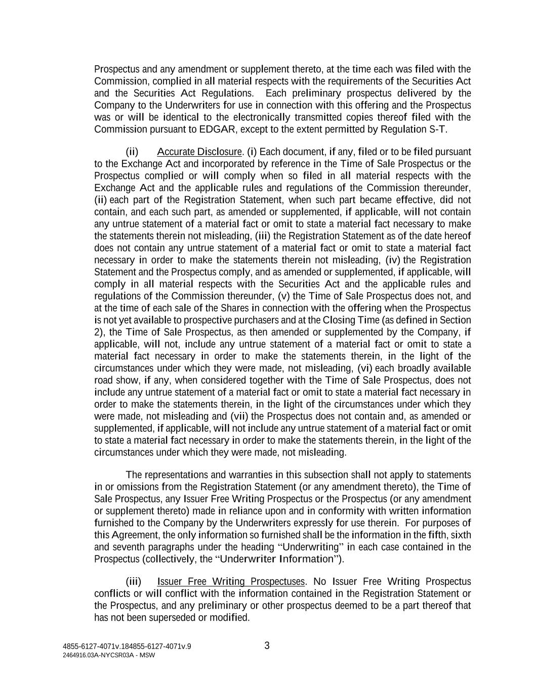 4855-6127-4071v.184855-6127-4071v.9 3 2464916.03A-NYCSR03A - MSW Prospectus and any amendment or supplement thereto, at the time each was filed with the Commission, complied in all material respects with the requirements of the Securities Act and the Securities Act Regulations. Each preliminary prospectus delivered by the Company to the Underwriters for use in connection with this offering and the Prospectus was or will be identical to the electronically transmitted copies thereof filed with the Commission pursuant to EDGAR, except to the extent permitted by Regulation S-T. (ii) Accurate Disclosure. (i) Each document, if any, filed or to be filed pursuant to the Exchange Act and incorporated by reference in the Time of Sale Prospectus or the Prospectus complied or will comply when so filed in all material respects with the Exchange Act and the applicable rules and regulations of the Commission thereunder, (ii) each part of the Registration Statement, when such part became effective, did not contain, and each such part, as amended or supplemented, if applicable, will not contain any untrue statement of a material fact or omit to state a material fact necessary to make the statements therein not misleading, (iii) the Registration Statement as of the date hereof does not contain any untrue statement of a material fact or omit to state a material fact necessary in order to make the statements therein not misleading, (iv) the Registration Statement and the Prospectus comply, and as amended or supplemented, if applicable, will comply in all material respects with the Securities Act and the applicable rules and regulations of the Commission thereunder, (v) the Time of Sale Prospectus does not, and at the time of each sale of the Shares in connection with the offering when the Prospectus is not yet available to prospective purchasers and at the Closing Time (as defined in Section 2), the Time of Sale Prospectus, as then amended or supplemented by the Company, if applicable, will not, include any untrue statement of a material fact or omit to state a material fact necessary in order to make the statements therein, in the light of the circumstances under which they were made, not misleading, (vi) each broadly available road show, if any, when considered together with the Time of Sale Prospectus, does not include any untrue statement of a material fact or omit to state a material fact necessary in order to make the statements therein, in the light of the circumstances under which they were made, not misleading and (vii) the Prospectus does not contain and, as amended or supplemented, if applicable, will not include any untrue statement of a material fact or omit to state a material fact necessary in order to make the statements therein, in the light of the circumstances under which they were made, not misleading. The representations and warranties in this subsection shall not apply to statements in or omissions from the Registration Statement (or any amendment thereto), the Time of Sale Prospectus, any Issuer Free Writing Prospectus or the Prospectus (or any amendment or supplement thereto) made in reliance upon and in conformity with written information furnished to the Company by the Underwriters expressly for use therein. For purposes of this Agreement, the only information so furnished shall be the information in the fifth, sixth and seventh paragraphs under the heading “Underwriting” in each case contained in the Prospectus (collectively, the “Underwriter Information”). (iii) Issuer Free Writing Prospectuses. No Issuer Free Writing Prospectus conflicts or will conflict with the information contained in the Registration Statement or the Prospectus, and any preliminary or other prospectus deemed to be a part thereof that has not been superseded or modified.