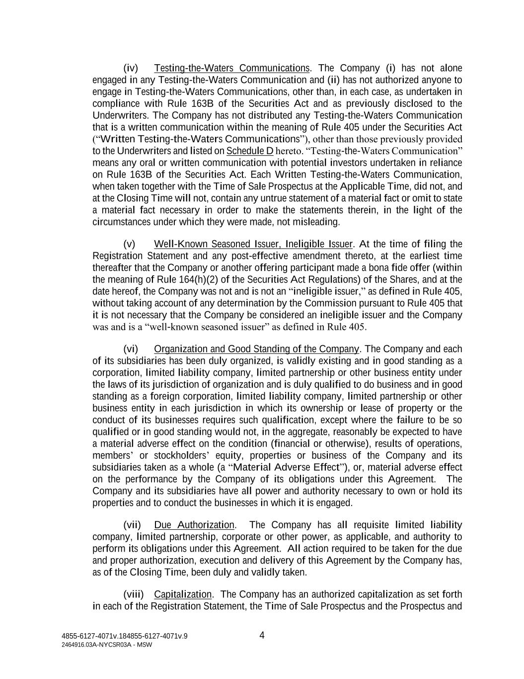 4855-6127-4071v.184855-6127-4071v.9 4 2464916.03A-NYCSR03A - MSW (iv) Testing-the-Waters Communications. The Company (i) has not alone engaged in any Testing-the-Waters Communication and (ii) has not authorized anyone to engage in Testing-the-Waters Communications, other than, in each case, as undertaken in compliance with Rule 163B of the Securities Act and as previously disclosed to the Underwriters. The Company has not distributed any Testing-the-Waters Communication that is a written communication within the meaning of Rule 405 under the Securities Act (“Written Testing-the-Waters Communications”), other than those previously provided to the Underwriters and listed on Schedule D hereto. “Testing-the-Waters Communication” means any oral or written communication with potential investors undertaken in reliance on Rule 163B of the Securities Act. Each Written Testing-the-Waters Communication, when taken together with the Time of Sale Prospectus at the Applicable Time, did not, and at the Closing Time will not, contain any untrue statement of a material fact or omit to state a material fact necessary in order to make the statements therein, in the light of the circumstances under which they were made, not misleading. (v) Well-Known Seasoned Issuer, Ineligible Issuer. At the time of filing the Registration Statement and any post-effective amendment thereto, at the earliest time thereafter that the Company or another offering participant made a bona fide offer (within the meaning of Rule 164(h)(2) of the Securities Act Regulations) of the Shares, and at the date hereof, the Company was not and is not an “ineligible issuer,” as defined in Rule 405, without taking account of any determination by the Commission pursuant to Rule 405 that it is not necessary that the Company be considered an ineligible issuer and the Company was and is a “well-known seasoned issuer” as defined in Rule 405. (vi) Organization and Good Standing of the Company. The Company and each of its subsidiaries has been duly organized, is validly existing and in good standing as a corporation, limited liability company, limited partnership or other business entity under the laws of its jurisdiction of organization and is duly qualified to do business and in good standing as a foreign corporation, limited liability company, limited partnership or other business entity in each jurisdiction in which its ownership or lease of property or the conduct of its businesses requires such qualification, except where the failure to be so qualified or in good standing would not, in the aggregate, reasonably be expected to have a material adverse effect on the condition (financial or otherwise), results of operations, members’ or stockholders’ equity, properties or business of the Company and its subsidiaries taken as a whole (a “Material Adverse Effect”), or, material adverse effect on the performance by the Company of its obligations under this Agreement. The Company and its subsidiaries have all power and authority necessary to own or hold its properties and to conduct the businesses in which it is engaged. (vii) Due Authorization. The Company has all requisite limited liability company, limited partnership, corporate or other power, as applicable, and authority to perform its obligations under this Agreement. All action required to be taken for the due and proper authorization, execution and delivery of this Agreement by the Company has, as of the Closing Time, been duly and validly taken. (viii) Capitalization. The Company has an authorized capitalization as set forth in each of the Registration Statement, the Time of Sale Prospectus and the Prospectus and