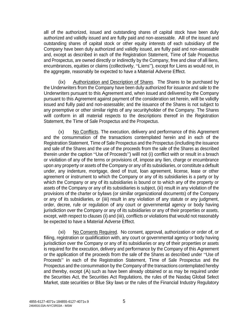 4855-6127-4071v.184855-6127-4071v.9 5 2464916.03A-NYCSR03A - MSW all of the authorized, issued and outstanding shares of capital stock have been duly authorized and validly issued and are fully paid and non-assessable. All of the issued and outstanding shares of capital stock or other equity interests of each subsidiary of the Company have been duly authorized and validly issued, are fully paid and non-assessable and, except as described in each of the Registration Statement, Time of Sale Prospectus and Prospectus, are owned directly or indirectly by the Company, free and clear of all liens, encumbrances, equities or claims (collectively, “Liens”), except for Liens as would not, in the aggregate, reasonably be expected to have a Material Adverse Effect. (ix) Authorization and Description of Shares. The Shares to be purchased by the Underwriters from the Company have been duly authorized for issuance and sale to the Underwriters pursuant to this Agreement and, when issued and delivered by the Company pursuant to this Agreement against payment of the consideration set herein, will be validly issued and fully paid and non-assessable; and the issuance of the Shares is not subject to any preemptive or other similar rights of any securityholder of the Company. The Shares will conform in all material respects to the descriptions thereof in the Registration Statement, the Time of Sale Prospectus and the Prospectus. (x) No Conflicts. The execution, delivery and performance of this Agreement and the consummation of the transactions contemplated herein and in each of the Registration Statement, Time of Sale Prospectus and the Prospectus (including the issuance and sale of the Shares and the use of the proceeds from the sale of the Shares as described therein under the caption “Use of Proceeds”) will not (i) conflict with or result in a breach or violation of any of the terms or provisions of, impose any lien, charge or encumbrance upon any property or assets of the Company or any of its subsidiaries, or constitute a default under, any indenture, mortgage, deed of trust, loan agreement, license, lease or other agreement or instrument to which the Company or any of its subsidiaries is a party or by which the Company or any of its subsidiaries is bound or to which any of the property or assets of the Company or any of its subsidiaries is subject, (ii) result in any violation of the provisions of the charter or bylaws (or similar organizational documents) of the Company or any of its subsidiaries, or (iii) result in any violation of any statute or any judgment, order, decree, rule or regulation of any court or governmental agency or body having jurisdiction over the Company or any of its subsidiaries or any of their properties or assets, except, with respect to clauses (i) and (iii), conflicts or violations that would not reasonably be expected to have a Material Adverse Effect. (xi) No Consents Required. No consent, approval, authorization or order of, or filing, registration or qualification with, any court or governmental agency or body having jurisdiction over the Company or any of its subsidiaries or any of their properties or assets is required for the execution, delivery and performance by the Company of this Agreement or the application of the proceeds from the sale of the Shares as described under “Use of Proceeds” in each of the Registration Statement, Time of Sale Prospectus and the Prospectus and the consummation by the Company of the transactions contemplated hereby and thereby, except (A) such as have been already obtained or as may be required under the Securities Act, the Securities Act Regulations, the rules of the Nasdaq Global Select Market, state securities or Blue Sky laws or the rules of the Financial Industry Regulatory