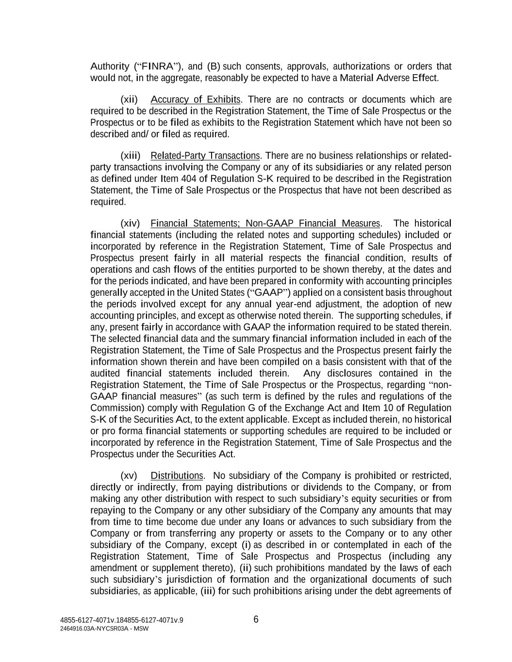 4855-6127-4071v.184855-6127-4071v.9 6 2464916.03A-NYCSR03A - MSW Authority (“FINRA”), and (B) such consents, approvals, authorizations or orders that would not, in the aggregate, reasonably be expected to have a Material Adverse Effect. (xii) Accuracy of Exhibits. There are no contracts or documents which are required to be described in the Registration Statement, the Time of Sale Prospectus or the Prospectus or to be filed as exhibits to the Registration Statement which have not been so described and/ or filed as required. (xiii) Related-Party Transactions. There are no business relationships or related- party transactions involving the Company or any of its subsidiaries or any related person as defined under Item 404 of Regulation S-K required to be described in the Registration Statement, the Time of Sale Prospectus or the Prospectus that have not been described as required. (xiv) Financial Statements; Non-GAAP Financial Measures. The historical financial statements (including the related notes and supporting schedules) included or incorporated by reference in the Registration Statement, Time of Sale Prospectus and Prospectus present fairly in all material respects the financial condition, results of operations and cash flows of the entities purported to be shown thereby, at the dates and for the periods indicated, and have been prepared in conformity with accounting principles generally accepted in the United States (“GAAP”) applied on a consistent basis throughout the periods involved except for any annual year-end adjustment, the adoption of new accounting principles, and except as otherwise noted therein. The supporting schedules, if any, present fairly in accordance with GAAP the information required to be stated therein. The selected financial data and the summary financial information included in each of the Registration Statement, the Time of Sale Prospectus and the Prospectus present fairly the information shown therein and have been compiled on a basis consistent with that of the audited financial statements included therein. Any disclosures contained in the Registration Statement, the Time of Sale Prospectus or the Prospectus, regarding “non- GAAP financial measures” (as such term is defined by the rules and regulations of the Commission) comply with Regulation G of the Exchange Act and Item 10 of Regulation S-K of the Securities Act, to the extent applicable. Except as included therein, no historical or pro forma financial statements or supporting schedules are required to be included or incorporated by reference in the Registration Statement, Time of Sale Prospectus and the Prospectus under the Securities Act. (xv) Distributions. No subsidiary of the Company is prohibited or restricted, directly or indirectly, from paying distributions or dividends to the Company, or from making any other distribution with respect to such subsidiary’s equity securities or from repaying to the Company or any other subsidiary of the Company any amounts that may from time to time become due under any loans or advances to such subsidiary from the Company or from transferring any property or assets to the Company or to any other subsidiary of the Company, except (i) as described in or contemplated in each of the Registration Statement, Time of Sale Prospectus and Prospectus (including any amendment or supplement thereto), (ii) such prohibitions mandated by the laws of each such subsidiary’s jurisdiction of formation and the organizational documents of such subsidiaries, as applicable, (iii) for such prohibitions arising under the debt agreements of