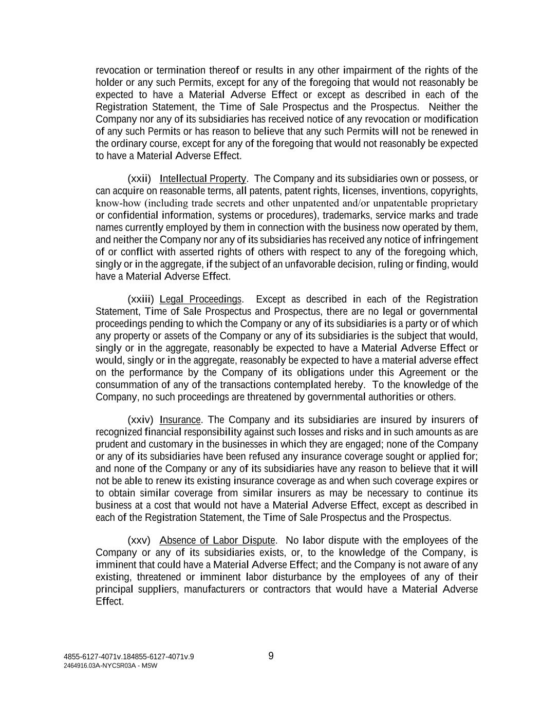 4855-6127-4071v.184855-6127-4071v.9 9 2464916.03A-NYCSR03A - MSW revocation or termination thereof or results in any other impairment of the rights of the holder or any such Permits, except for any of the foregoing that would not reasonably be expected to have a Material Adverse Effect or except as described in each of the Registration Statement, the Time of Sale Prospectus and the Prospectus. Neither the Company nor any of its subsidiaries has received notice of any revocation or modification of any such Permits or has reason to believe that any such Permits will not be renewed in the ordinary course, except for any of the foregoing that would not reasonably be expected to have a Material Adverse Effect. (xxii) Intellectual Property. The Company and its subsidiaries own or possess, or can acquire on reasonable terms, all patents, patent rights, licenses, inventions, copyrights, know‑how (including trade secrets and other unpatented and/or unpatentable proprietary or confidential information, systems or procedures), trademarks, service marks and trade names currently employed by them in connection with the business now operated by them, and neither the Company nor any of its subsidiaries has received any notice of infringement of or conflict with asserted rights of others with respect to any of the foregoing which, singly or in the aggregate, if the subject of an unfavorable decision, ruling or finding, would have a Material Adverse Effect. (xxiii) Legal Proceedings. Except as described in each of the Registration Statement, Time of Sale Prospectus and Prospectus, there are no legal or governmental proceedings pending to which the Company or any of its subsidiaries is a party or of which any property or assets of the Company or any of its subsidiaries is the subject that would, singly or in the aggregate, reasonably be expected to have a Material Adverse Effect or would, singly or in the aggregate, reasonably be expected to have a material adverse effect on the performance by the Company of its obligations under this Agreement or the consummation of any of the transactions contemplated hereby. To the knowledge of the Company, no such proceedings are threatened by governmental authorities or others. (xxiv) Insurance. The Company and its subsidiaries are insured by insurers of recognized financial responsibility against such losses and risks and in such amounts as are prudent and customary in the businesses in which they are engaged; none of the Company or any of its subsidiaries have been refused any insurance coverage sought or applied for; and none of the Company or any of its subsidiaries have any reason to believe that it will not be able to renew its existing insurance coverage as and when such coverage expires or to obtain similar coverage from similar insurers as may be necessary to continue its business at a cost that would not have a Material Adverse Effect, except as described in each of the Registration Statement, the Time of Sale Prospectus and the Prospectus. (xxv) Absence of Labor Dispute. No labor dispute with the employees of the Company or any of its subsidiaries exists, or, to the knowledge of the Company, is imminent that could have a Material Adverse Effect; and the Company is not aware of any existing, threatened or imminent labor disturbance by the employees of any of their principal suppliers, manufacturers or contractors that would have a Material Adverse Effect.