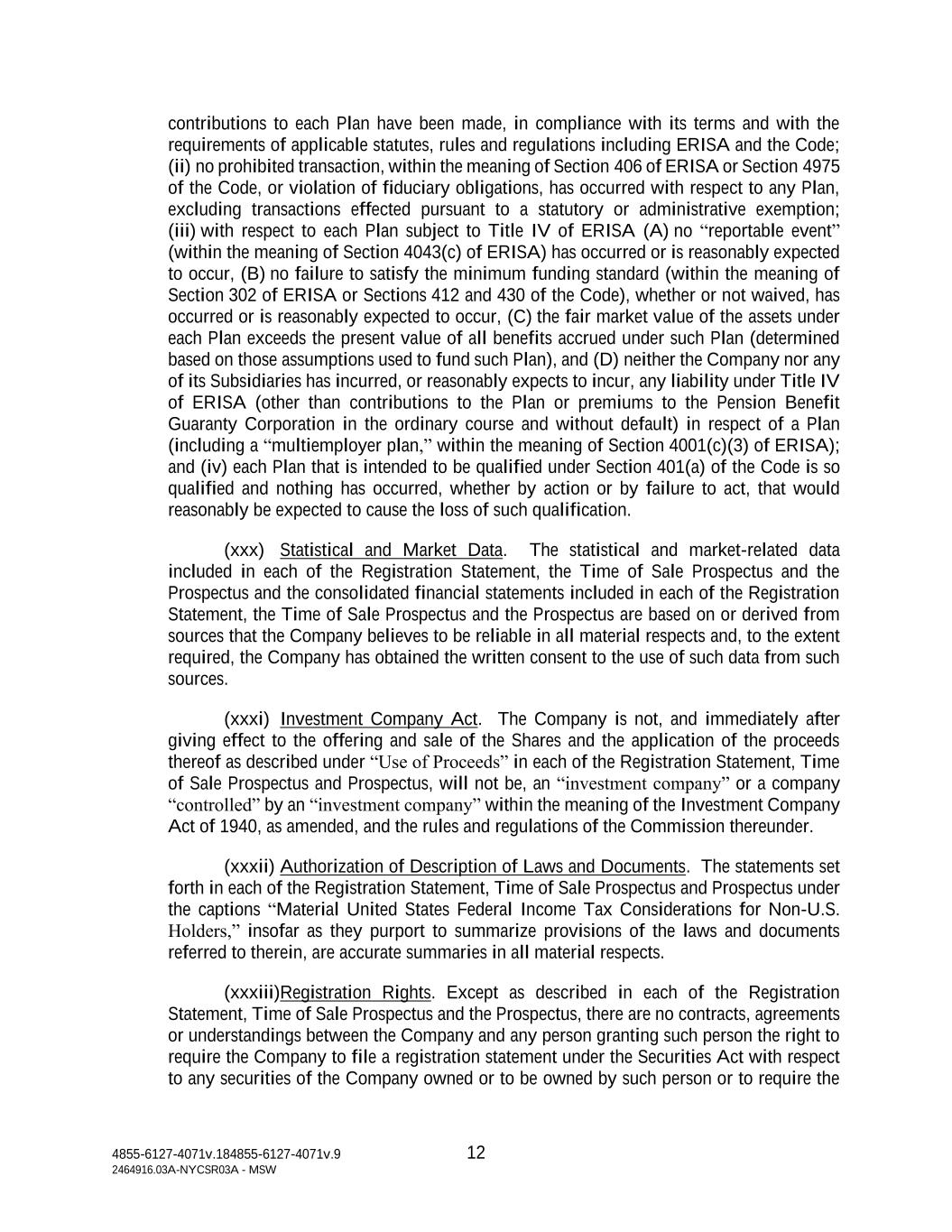 4855-6127-4071v.184855-6127-4071v.9 12 2464916.03A-NYCSR03A - MSW contributions to each Plan have been made, in compliance with its terms and with the requirements of applicable statutes, rules and regulations including ERISA and the Code; (ii) no prohibited transaction, within the meaning of Section 406 of ERISA or Section 4975 of the Code, or violation of fiduciary obligations, has occurred with respect to any Plan, excluding transactions effected pursuant to a statutory or administrative exemption; (iii) with respect to each Plan subject to Title IV of ERISA (A) no “reportable event” (within the meaning of Section 4043(c) of ERISA) has occurred or is reasonably expected to occur, (B) no failure to satisfy the minimum funding standard (within the meaning of Section 302 of ERISA or Sections 412 and 430 of the Code), whether or not waived, has occurred or is reasonably expected to occur, (C) the fair market value of the assets under each Plan exceeds the present value of all benefits accrued under such Plan (determined based on those assumptions used to fund such Plan), and (D) neither the Company nor any of its Subsidiaries has incurred, or reasonably expects to incur, any liability under Title IV of ERISA (other than contributions to the Plan or premiums to the Pension Benefit Guaranty Corporation in the ordinary course and without default) in respect of a Plan (including a “multiemployer plan,” within the meaning of Section 4001(c)(3) of ERISA); and (iv) each Plan that is intended to be qualified under Section 401(a) of the Code is so qualified and nothing has occurred, whether by action or by failure to act, that would reasonably be expected to cause the loss of such qualification. (xxx) Statistical and Market Data. The statistical and market-related data included in each of the Registration Statement, the Time of Sale Prospectus and the Prospectus and the consolidated financial statements included in each of the Registration Statement, the Time of Sale Prospectus and the Prospectus are based on or derived from sources that the Company believes to be reliable in all material respects and, to the extent required, the Company has obtained the written consent to the use of such data from such sources. (xxxi) Investment Company Act. The Company is not, and immediately after giving effect to the offering and sale of the Shares and the application of the proceeds thereof as described under “Use of Proceeds” in each of the Registration Statement, Time of Sale Prospectus and Prospectus, will not be, an “investment company” or a company “controlled” by an “investment company” within the meaning of the Investment Company Act of 1940, as amended, and the rules and regulations of the Commission thereunder. (xxxii) Authorization of Description of Laws and Documents. The statements set forth in each of the Registration Statement, Time of Sale Prospectus and Prospectus under the captions “Material United States Federal Income Tax Considerations for Non-U.S. Holders,” insofar as they purport to summarize provisions of the laws and documents referred to therein, are accurate summaries in all material respects. (xxxiii)Registration Rights. Except as described in each of the Registration Statement, Time of Sale Prospectus and the Prospectus, there are no contracts, agreements or understandings between the Company and any person granting such person the right to require the Company to file a registration statement under the Securities Act with respect to any securities of the Company owned or to be owned by such person or to require the