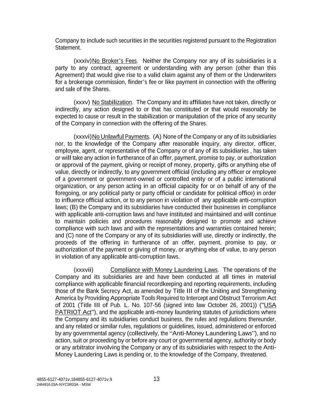 4855-6127-4071v.184855-6127-4071v.9 13 2464916.03A-NYCSR03A - MSW Company to include such securities in the securities registered pursuant to the Registration Statement. (xxxiv) No Broker’s Fees. Neither the Company nor any of its subsidiaries is a party to any contract, agreement or understanding with any person (other than this Agreement) that would give rise to a valid claim against any of them or the Underwriters for a brokerage commission, finder’s fee or like payment in connection with the offering and sale of the Shares. (xxxv) No Stabilization. The Company and its affiliates have not taken, directly or indirectly, any action designed to or that has constituted or that would reasonably be expected to cause or result in the stabilization or manipulation of the price of any security of the Company in connection with the offering of the Shares. (xxxvi) No Unlawful Payments. (A) None of the Company or any of its subsidiaries nor, to the knowledge of the Company after reasonable inquiry, any director, officer, employee, agent, or representative of the Company or of any of its subsidiaries , has taken or will take any action in furtherance of an offer, payment, promise to pay, or authorization or approval of the payment, giving or receipt of money, property, gifts or anything else of value, directly or indirectly, to any government official (including any officer or employee of a government or government-owned or controlled entity or of a public international organization, or any person acting in an official capacity for or on behalf of any of the foregoing, or any political party or party official or candidate for political office) in order to influence official action, or to any person in violation of any applicable anti-corruption laws; (B) the Company and its subsidiaries have conducted their businesses in compliance with applicable anti-corruption laws and have instituted and maintained and will continue to maintain policies and procedures reasonably designed to promote and achieve compliance with such laws and with the representations and warranties contained herein; and (C) none of the Company or any of its subsidiaries will use, directly or indirectly, the proceeds of the offering in furtherance of an offer, payment, promise to pay, or authorization of the payment or giving of money, or anything else of value, to any person in violation of any applicable anti-corruption laws. (xxxvii) Compliance with Money Laundering Laws. The operations of the Company and its subsidiaries are and have been conducted at all times in material compliance with applicable financial recordkeeping and reporting requirements, including those of the Bank Secrecy Act, as amended by Title III of the Uniting and Strengthening America by Providing Appropriate Tools Required to Intercept and Obstruct Terrorism Act of 2001 (Title III of Pub. L. No. 107-56 (signed into law October 26, 2001)) ("USA PATRIOT Act"), and the applicable anti-money laundering statutes of jurisdictions where the Company and its subsidiaries conduct business, the rules and regulations thereunder, and any related or similar rules, regulations or guidelines, issued, administered or enforced by any governmental agency (collectively, the “Anti-Money Laundering Laws”), and no action, suit or proceeding by or before any court or governmental agency, authority or body or any arbitrator involving the Company or any of its subsidiaries with respect to the Anti- Money Laundering Laws is pending or, to the knowledge of the Company, threatened.