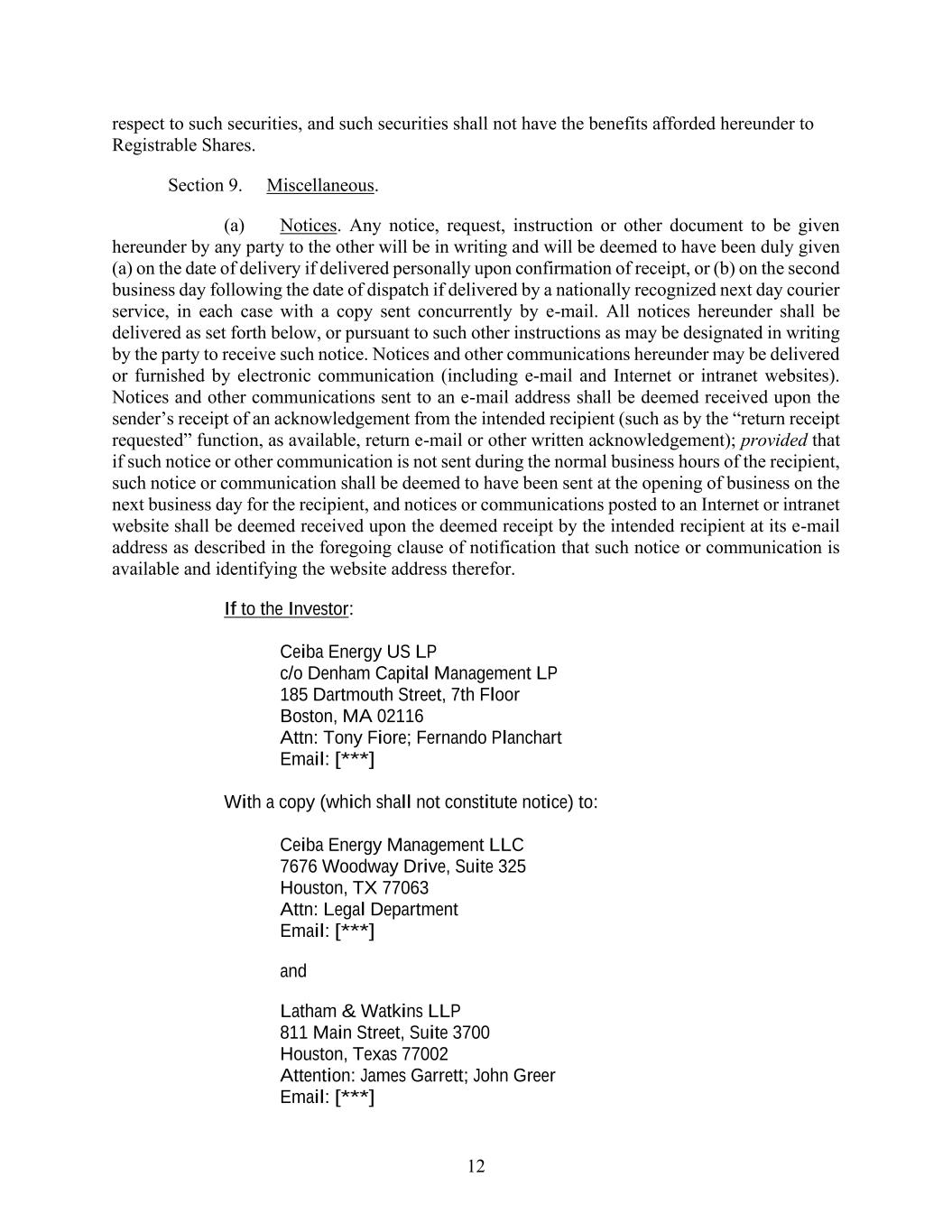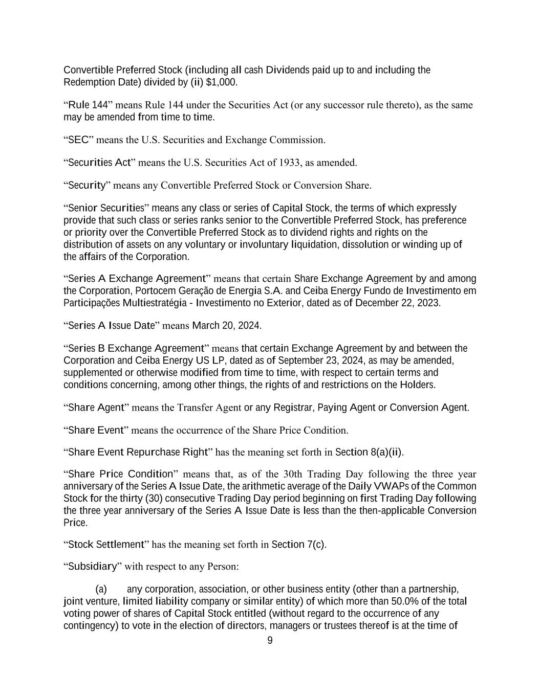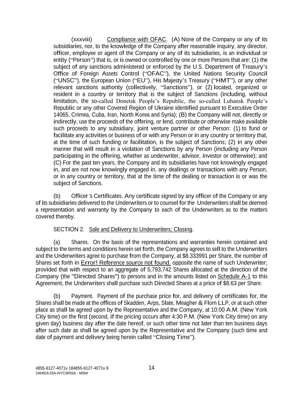4855-6127-4071v.184855-6127-4071v.9 14 2464916.03A-NYCSR03A - MSW (xxxviii) Compliance with OFAC. (A) None of the Company or any of its subsidiaries, nor, to the knowledge of the Company after reasonable inquiry, any director, officer, employee or agent of the Company or any of its subsidiaries, is an individual or entity (“Person”) that is, or is owned or controlled by one or more Persons that are: (1) the subject of any sanctions administered or enforced by the U.S. Department of Treasury’s Office of Foreign Assets Control (“OFAC”), the United Nations Security Council (“UNSC”), the European Union (“EU”), His Majesty’s Treasury (“HMT”), or any other relevant sanctions authority (collectively, “Sanctions”), or (2) located, organized or resident in a country or territory that is the subject of Sanctions (including, without limitation, the so-called Donetsk People’s Republic, the so-called Luhansk People’s Republic or any other Covered Region of Ukraine identified pursuant to Executive Order 14065, Crimea, Cuba, Iran, North Korea and Syria); (B) the Company will not, directly or indirectly, use the proceeds of the offering, or lend, contribute or otherwise make available such proceeds to any subsidiary, joint venture partner or other Person: (1) to fund or facilitate any activities or business of or with any Person or in any country or territory that, at the time of such funding or facilitation, is the subject of Sanctions; (2) in any other manner that will result in a violation of Sanctions by any Person (including any Person participating in the offering, whether as underwriter, advisor, investor or otherwise); and (C) For the past ten years, the Company and its subsidiaries have not knowingly engaged in, and are not now knowingly engaged in, any dealings or transactions with any Person, or in any country or territory, that at the time of the dealing or transaction is or was the subject of Sanctions. (b) Officer’s Certificates. Any certificate signed by any officer of the Company or any of its subsidiaries delivered to the Underwriters or to counsel for the Underwriters shall be deemed a representation and warranty by the Company to each of the Underwriters as to the matters covered thereby. SECTION 2. Sale and Delivery to Underwriters; Closing. (a) Shares. On the basis of the representations and warranties herein contained and subject to the terms and conditions herein set forth, the Company agrees to sell to the Underwriters and the Underwriters agree to purchase from the Company, at $8.333991 per Share, the number of Shares set forth in Error! Reference source not found. opposite the name of such Underwriter; provided that with respect to an aggregate of 5,793,742 Shares allocated at the direction of the Company (the "Directed Shares") to persons and in the amounts listed on Schedule A-1 to this Agreement, the Underwriters shall purchase such Directed Shares at a price of $8.63 per Share. (b) Payment. Payment of the purchase price for, and delivery of certificates for, the Shares shall be made at the offices of Skadden, Arps, Slate, Meagher & Flom LLP, or at such other place as shall be agreed upon by the Representative and the Company, at 10:00 A.M. (New York City time) on the first (second, if the pricing occurs after 4:30 P.M. (New York City time) on any given day) business day after the date hereof, or such other time not later than ten business days after such date as shall be agreed upon by the Representative and the Company (such time and date of payment and delivery being herein called “Closing Time”).