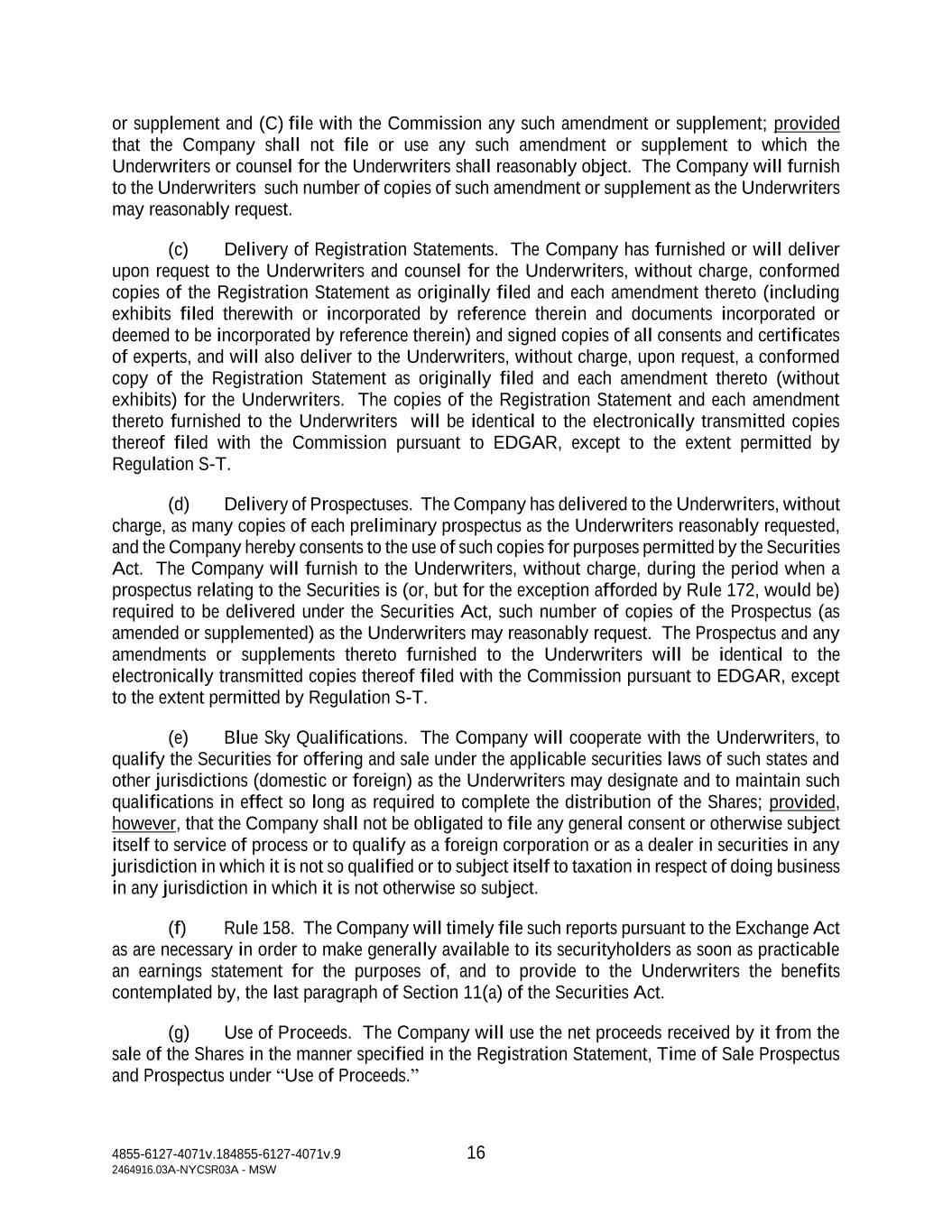4855-6127-4071v.184855-6127-4071v.9 16 2464916.03A-NYCSR03A - MSW or supplement and (C) file with the Commission any such amendment or supplement; provided that the Company shall not file or use any such amendment or supplement to which the Underwriters or counsel for the Underwriters shall reasonably object. The Company will furnish to the Underwriters such number of copies of such amendment or supplement as the Underwriters may reasonably request. (c) Delivery of Registration Statements. The Company has furnished or will deliver upon request to the Underwriters and counsel for the Underwriters, without charge, conformed copies of the Registration Statement as originally filed and each amendment thereto (including exhibits filed therewith or incorporated by reference therein and documents incorporated or deemed to be incorporated by reference therein) and signed copies of all consents and certificates of experts, and will also deliver to the Underwriters, without charge, upon request, a conformed copy of the Registration Statement as originally filed and each amendment thereto (without exhibits) for the Underwriters. The copies of the Registration Statement and each amendment thereto furnished to the Underwriters will be identical to the electronically transmitted copies thereof filed with the Commission pursuant to EDGAR, except to the extent permitted by Regulation S-T. (d) Delivery of Prospectuses. The Company has delivered to the Underwriters, without charge, as many copies of each preliminary prospectus as the Underwriters reasonably requested, and the Company hereby consents to the use of such copies for purposes permitted by the Securities Act. The Company will furnish to the Underwriters, without charge, during the period when a prospectus relating to the Securities is (or, but for the exception afforded by Rule 172, would be) required to be delivered under the Securities Act, such number of copies of the Prospectus (as amended or supplemented) as the Underwriters may reasonably request. The Prospectus and any amendments or supplements thereto furnished to the Underwriters will be identical to the electronically transmitted copies thereof filed with the Commission pursuant to EDGAR, except to the extent permitted by Regulation S-T. (e) Blue Sky Qualifications. The Company will cooperate with the Underwriters, to qualify the Securities for offering and sale under the applicable securities laws of such states and other jurisdictions (domestic or foreign) as the Underwriters may designate and to maintain such qualifications in effect so long as required to complete the distribution of the Shares; provided, however, that the Company shall not be obligated to file any general consent or otherwise subject itself to service of process or to qualify as a foreign corporation or as a dealer in securities in any jurisdiction in which it is not so qualified or to subject itself to taxation in respect of doing business in any jurisdiction in which it is not otherwise so subject. (f) Rule 158. The Company will timely file such reports pursuant to the Exchange Act as are necessary in order to make generally available to its securityholders as soon as practicable an earnings statement for the purposes of, and to provide to the Underwriters the benefits contemplated by, the last paragraph of Section 11(a) of the Securities Act. (g) Use of Proceeds. The Company will use the net proceeds received by it from the sale of the Shares in the manner specified in the Registration Statement, Time of Sale Prospectus and Prospectus under “Use of Proceeds.”