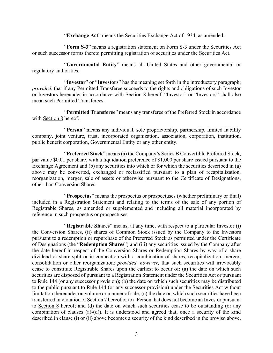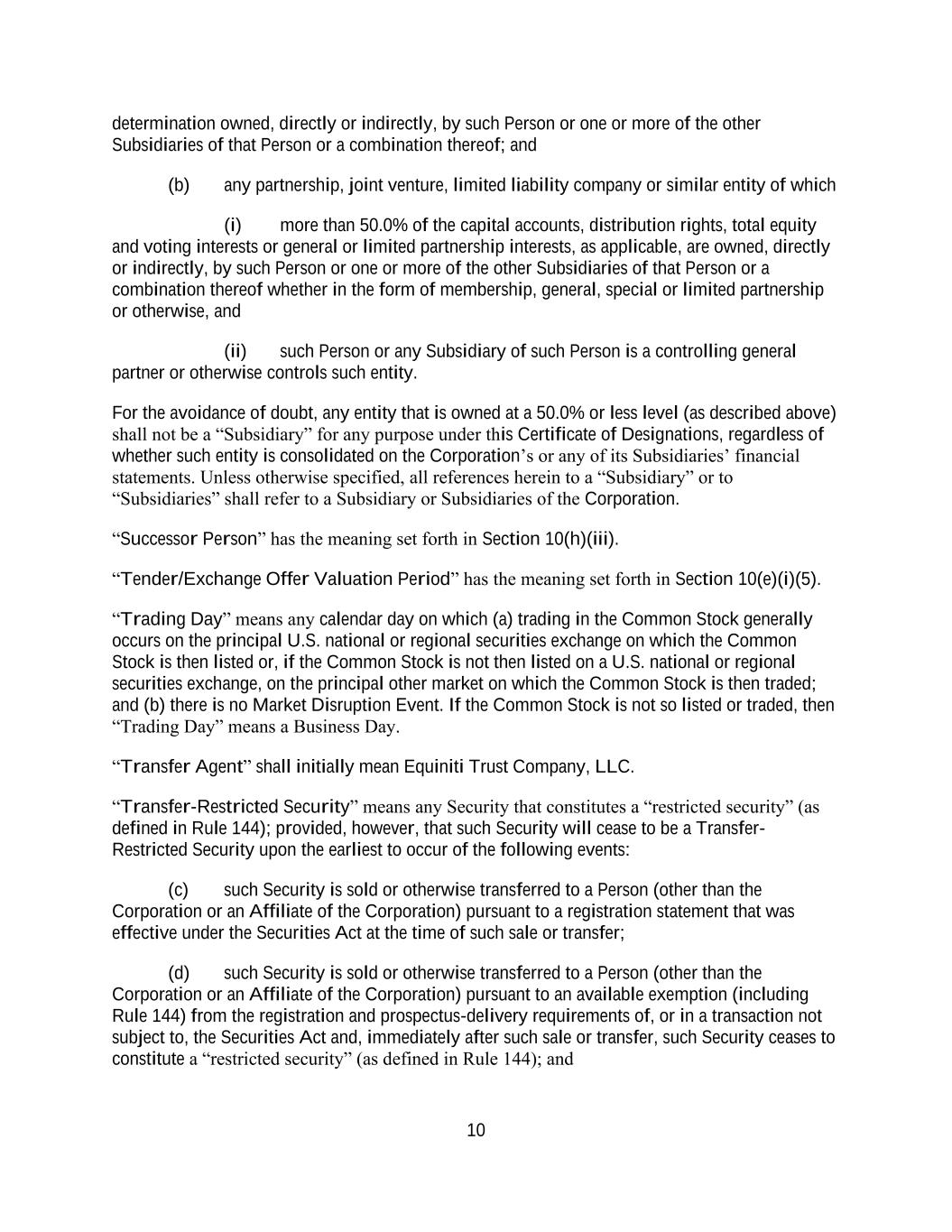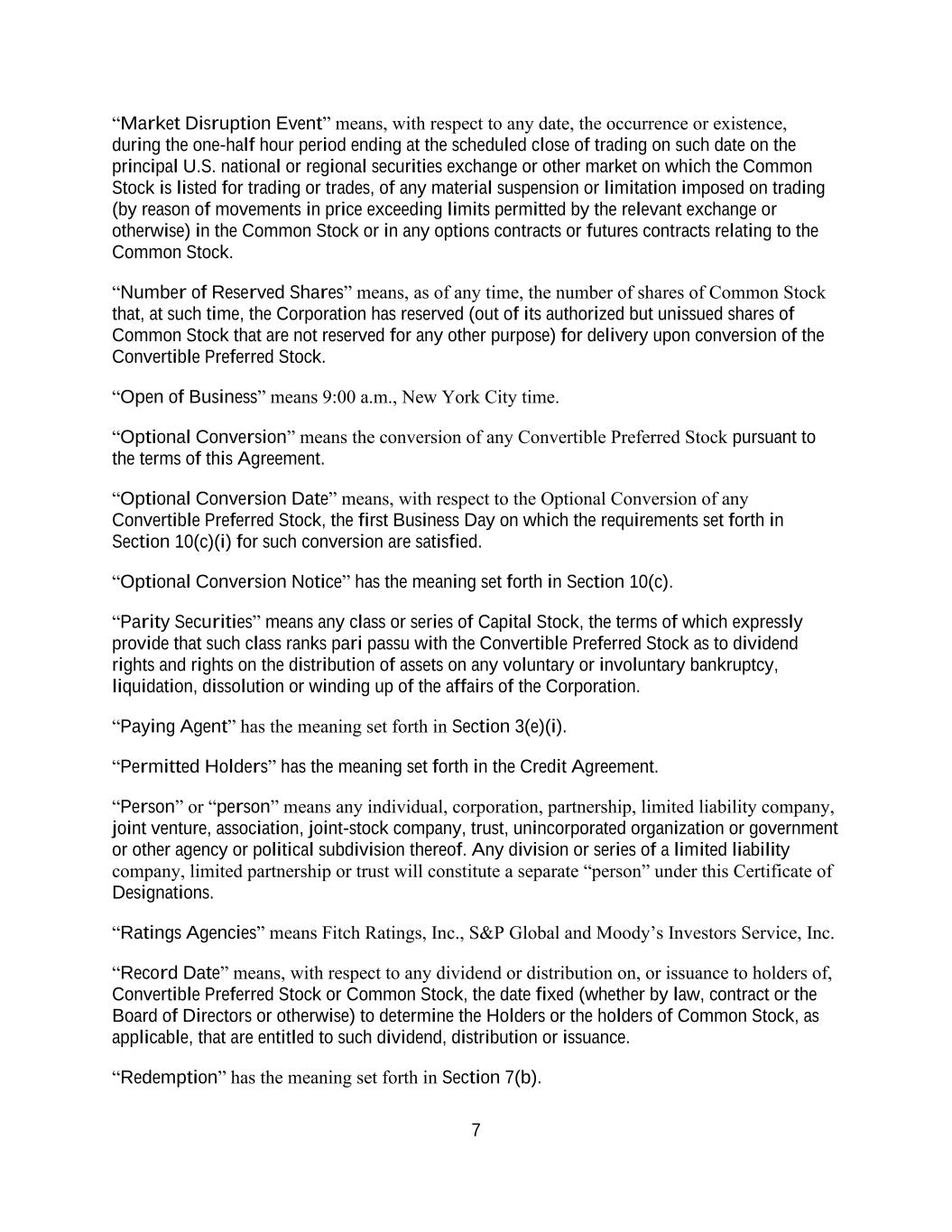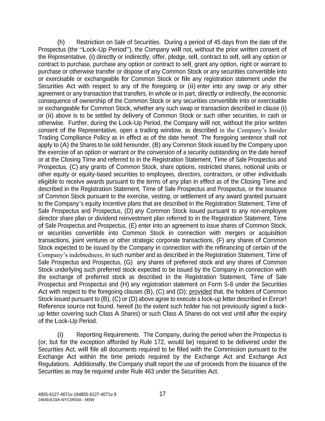 4855-6127-4071v.184855-6127-4071v.9 17 2464916.03A-NYCSR03A - MSW (h) Restriction on Sale of Securities. During a period of 45 days from the date of the Prospectus (the “Lock-Up Period”), the Company will not, without the prior written consent of the Representative, (i) directly or indirectly, offer, pledge, sell, contract to sell, sell any option or contract to purchase, purchase any option or contract to sell, grant any option, right or warrant to purchase or otherwise transfer or dispose of any Common Stock or any securities convertible into or exercisable or exchangeable for Common Stock or file any registration statement under the Securities Act with respect to any of the foregoing or (ii) enter into any swap or any other agreement or any transaction that transfers, in whole or in part, directly or indirectly, the economic consequence of ownership of the Common Stock or any securities convertible into or exercisable or exchangeable for Common Stock, whether any such swap or transaction described in clause (i) or (ii) above is to be settled by delivery of Common Stock or such other securities, in cash or otherwise. Further, during the Lock-Up Period, the Company will not, without the prior written consent of the Representative, open a trading window, as described in the Company’s Insider Trading Compliance Policy as in effect as of the date hereof. The foregoing sentence shall not apply to (A) the Shares to be sold hereunder, (B) any Common Stock issued by the Company upon the exercise of an option or warrant or the conversion of a security outstanding on the date hereof or at the Closing Time and referred to in the Registration Statement, Time of Sale Prospectus and Prospectus, (C) any grants of Common Stock, share options, restricted shares, notional units or other equity or equity-based securities to employees, directors, contractors, or other individuals eligible to receive awards pursuant to the terms of any plan in effect as of the Closing Time and described in the Registration Statement, Time of Sale Prospectus and Prospectus, or the issuance of Common Stock pursuant to the exercise, vesting, or settlement of any award granted pursuant to the Company’s equity incentive plans that are described in the Registration Statement, Time of Sale Prospectus and Prospectus, (D) any Common Stock issued pursuant to any non-employee director share plan or dividend reinvestment plan referred to in the Registration Statement, Time of Sale Prospectus and Prospectus, (E) enter into an agreement to issue shares of Common Stock, or securities convertible into Common Stock in connection with mergers or acquisition transactions, joint ventures or other strategic corporate transactions, (F) any shares of Common Stock expected to be issued by the Company in connection with the refinancing of certain of the Company’s indebtedness, in such number and as described in the Registration Statement, Time of Sale Prospectus and Prospectus, (G) any shares of preferred stock and any shares of Common Stock underlying such preferred stock expected to be issued by the Company in connection with the exchange of preferred stock as described in the Registration Statement, Time of Sale Prospectus and Prospectus and (H) any registration statement on Form S-8 under the Securities Act with respect to the foregoing clauses (B), (C) and (D); provided that, the holders of Common Stock issued pursuant to (B), (C) or (D) above agree to execute a lock-up letter described in Error! Reference source not found. hereof (to the extent such holder has not previously signed a lock- up letter covering such Class A Shares) or such Class A Shares do not vest until after the expiry of the Lock-Up Period. (i) Reporting Requirements. The Company, during the period when the Prospectus is (or, but for the exception afforded by Rule 172, would be) required to be delivered under the Securities Act, will file all documents required to be filed with the Commission pursuant to the Exchange Act within the time periods required by the Exchange Act and Exchange Act Regulations. Additionally, the Company shall report the use of proceeds from the issuance of the Securities as may be required under Rule 463 under the Securities Act.