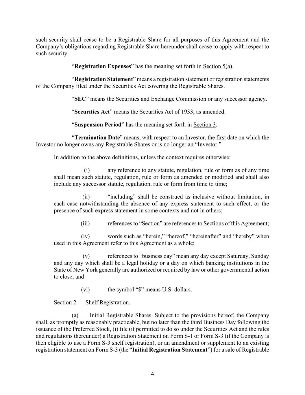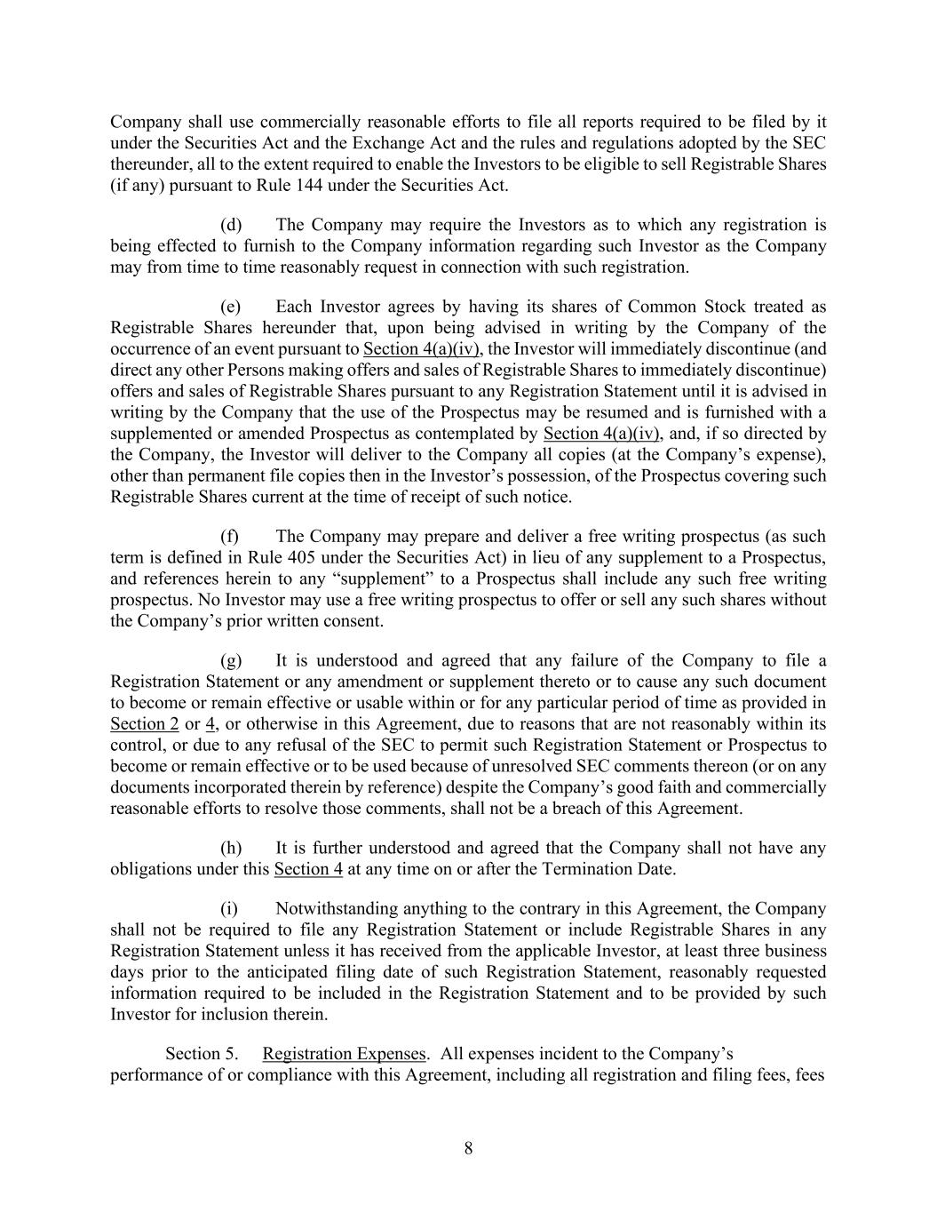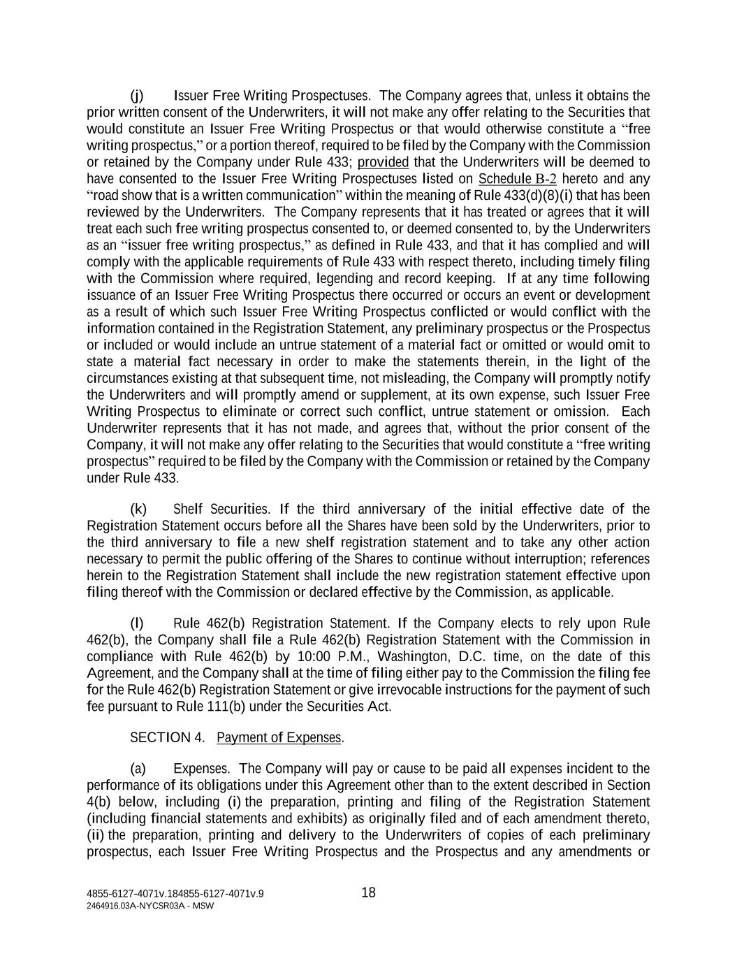 4855-6127-4071v.184855-6127-4071v.9 18 2464916.03A-NYCSR03A - MSW (j) Issuer Free Writing Prospectuses. The Company agrees that, unless it obtains the prior written consent of the Underwriters, it will not make any offer relating to the Securities that would constitute an Issuer Free Writing Prospectus or that would otherwise constitute a “free writing prospectus,” or a portion thereof, required to be filed by the Company with the Commission or retained by the Company under Rule 433; provided that the Underwriters will be deemed to have consented to the Issuer Free Writing Prospectuses listed on Schedule B‑2 hereto and any “road show that is a written communication” within the meaning of Rule 433(d)(8)(i) that has been reviewed by the Underwriters. The Company represents that it has treated or agrees that it will treat each such free writing prospectus consented to, or deemed consented to, by the Underwriters as an “issuer free writing prospectus,” as defined in Rule 433, and that it has complied and will comply with the applicable requirements of Rule 433 with respect thereto, including timely filing with the Commission where required, legending and record keeping. If at any time following issuance of an Issuer Free Writing Prospectus there occurred or occurs an event or development as a result of which such Issuer Free Writing Prospectus conflicted or would conflict with the information contained in the Registration Statement, any preliminary prospectus or the Prospectus or included or would include an untrue statement of a material fact or omitted or would omit to state a material fact necessary in order to make the statements therein, in the light of the circumstances existing at that subsequent time, not misleading, the Company will promptly notify the Underwriters and will promptly amend or supplement, at its own expense, such Issuer Free Writing Prospectus to eliminate or correct such conflict, untrue statement or omission. Each Underwriter represents that it has not made, and agrees that, without the prior consent of the Company, it will not make any offer relating to the Securities that would constitute a “free writing prospectus” required to be filed by the Company with the Commission or retained by the Company under Rule 433. (k) Shelf Securities. If the third anniversary of the initial effective date of the Registration Statement occurs before all the Shares have been sold by the Underwriters, prior to the third anniversary to file a new shelf registration statement and to take any other action necessary to permit the public offering of the Shares to continue without interruption; references herein to the Registration Statement shall include the new registration statement effective upon filing thereof with the Commission or declared effective by the Commission, as applicable. (l) Rule 462(b) Registration Statement. If the Company elects to rely upon Rule 462(b), the Company shall file a Rule 462(b) Registration Statement with the Commission in compliance with Rule 462(b) by 10:00 P.M., Washington, D.C. time, on the date of this Agreement, and the Company shall at the time of filing either pay to the Commission the filing fee for the Rule 462(b) Registration Statement or give irrevocable instructions for the payment of such fee pursuant to Rule 111(b) under the Securities Act. SECTION 4. Payment of Expenses. (a) Expenses. The Company will pay or cause to be paid all expenses incident to the performance of its obligations under this Agreement other than to the extent described in Section 4(b) below, including (i) the preparation, printing and filing of the Registration Statement (including financial statements and exhibits) as originally filed and of each amendment thereto, (ii) the preparation, printing and delivery to the Underwriters of copies of each preliminary prospectus, each Issuer Free Writing Prospectus and the Prospectus and any amendments or