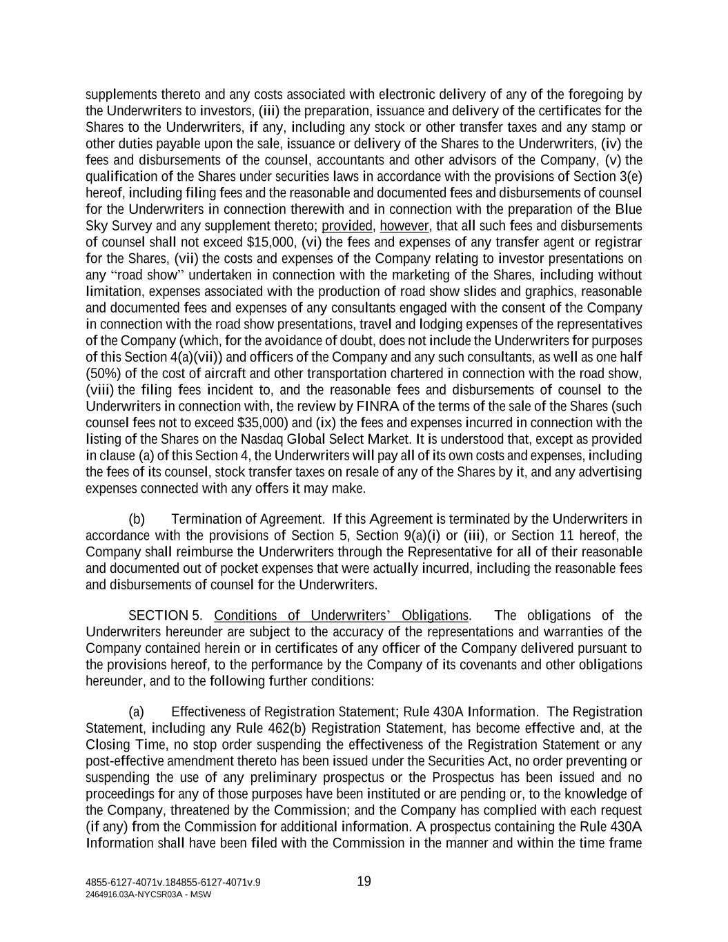 4855-6127-4071v.184855-6127-4071v.9 19 2464916.03A-NYCSR03A - MSW supplements thereto and any costs associated with electronic delivery of any of the foregoing by the Underwriters to investors, (iii) the preparation, issuance and delivery of the certificates for the Shares to the Underwriters, if any, including any stock or other transfer taxes and any stamp or other duties payable upon the sale, issuance or delivery of the Shares to the Underwriters, (iv) the fees and disbursements of the counsel, accountants and other advisors of the Company, (v) the qualification of the Shares under securities laws in accordance with the provisions of Section 3(e) hereof, including filing fees and the reasonable and documented fees and disbursements of counsel for the Underwriters in connection therewith and in connection with the preparation of the Blue Sky Survey and any supplement thereto; provided, however, that all such fees and disbursements of counsel shall not exceed $15,000, (vi) the fees and expenses of any transfer agent or registrar for the Shares, (vii) the costs and expenses of the Company relating to investor presentations on any “road show” undertaken in connection with the marketing of the Shares, including without limitation, expenses associated with the production of road show slides and graphics, reasonable and documented fees and expenses of any consultants engaged with the consent of the Company in connection with the road show presentations, travel and lodging expenses of the representatives of the Company (which, for the avoidance of doubt, does not include the Underwriters for purposes of this Section 4(a)(vii)) and officers of the Company and any such consultants, as well as one half (50%) of the cost of aircraft and other transportation chartered in connection with the road show, (viii) the filing fees incident to, and the reasonable fees and disbursements of counsel to the Underwriters in connection with, the review by FINRA of the terms of the sale of the Shares (such counsel fees not to exceed $35,000) and (ix) the fees and expenses incurred in connection with the listing of the Shares on the Nasdaq Global Select Market. It is understood that, except as provided in clause (a) of this Section 4, the Underwriters will pay all of its own costs and expenses, including the fees of its counsel, stock transfer taxes on resale of any of the Shares by it, and any advertising expenses connected with any offers it may make. (b) Termination of Agreement. If this Agreement is terminated by the Underwriters in accordance with the provisions of Section 5, Section 9(a)(i) or (iii), or Section 11 hereof, the Company shall reimburse the Underwriters through the Representative for all of their reasonable and documented out of pocket expenses that were actually incurred, including the reasonable fees and disbursements of counsel for the Underwriters. SECTION 5. Conditions of Underwriters’ Obligations. The obligations of the Underwriters hereunder are subject to the accuracy of the representations and warranties of the Company contained herein or in certificates of any officer of the Company delivered pursuant to the provisions hereof, to the performance by the Company of its covenants and other obligations hereunder, and to the following further conditions: (a) Effectiveness of Registration Statement; Rule 430A Information. The Registration Statement, including any Rule 462(b) Registration Statement, has become effective and, at the Closing Time, no stop order suspending the effectiveness of the Registration Statement or any post-effective amendment thereto has been issued under the Securities Act, no order preventing or suspending the use of any preliminary prospectus or the Prospectus has been issued and no proceedings for any of those purposes have been instituted or are pending or, to the knowledge of the Company, threatened by the Commission; and the Company has complied with each request (if any) from the Commission for additional information. A prospectus containing the Rule 430A Information shall have been filed with the Commission in the manner and within the time frame