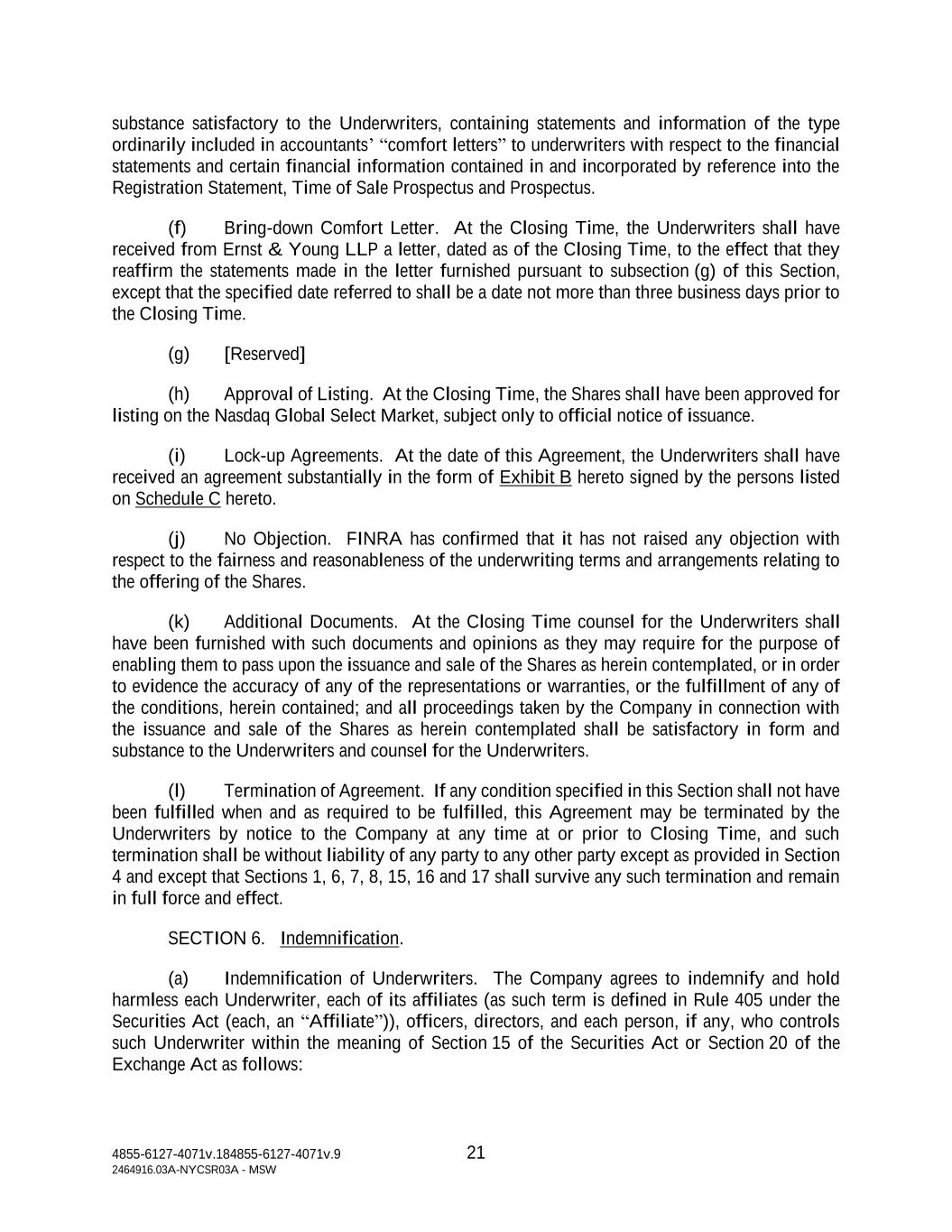 4855-6127-4071v.184855-6127-4071v.9 21 2464916.03A-NYCSR03A - MSW substance satisfactory to the Underwriters, containing statements and information of the type ordinarily included in accountants’ “comfort letters” to underwriters with respect to the financial statements and certain financial information contained in and incorporated by reference into the Registration Statement, Time of Sale Prospectus and Prospectus. (f) Bring-down Comfort Letter. At the Closing Time, the Underwriters shall have received from Ernst & Young LLP a letter, dated as of the Closing Time, to the effect that they reaffirm the statements made in the letter furnished pursuant to subsection (g) of this Section, except that the specified date referred to shall be a date not more than three business days prior to the Closing Time. (g) [Reserved] (h) Approval of Listing. At the Closing Time, the Shares shall have been approved for listing on the Nasdaq Global Select Market, subject only to official notice of issuance. (i) Lock-up Agreements. At the date of this Agreement, the Underwriters shall have received an agreement substantially in the form of Exhibit B hereto signed by the persons listed on Schedule C hereto. (j) No Objection. FINRA has confirmed that it has not raised any objection with respect to the fairness and reasonableness of the underwriting terms and arrangements relating to the offering of the Shares. (k) Additional Documents. At the Closing Time counsel for the Underwriters shall have been furnished with such documents and opinions as they may require for the purpose of enabling them to pass upon the issuance and sale of the Shares as herein contemplated, or in order to evidence the accuracy of any of the representations or warranties, or the fulfillment of any of the conditions, herein contained; and all proceedings taken by the Company in connection with the issuance and sale of the Shares as herein contemplated shall be satisfactory in form and substance to the Underwriters and counsel for the Underwriters. (l) Termination of Agreement. If any condition specified in this Section shall not have been fulfilled when and as required to be fulfilled, this Agreement may be terminated by the Underwriters by notice to the Company at any time at or prior to Closing Time, and such termination shall be without liability of any party to any other party except as provided in Section 4 and except that Sections 1, 6, 7, 8, 15, 16 and 17 shall survive any such termination and remain in full force and effect. SECTION 6. Indemnification. (a) Indemnification of Underwriters. The Company agrees to indemnify and hold harmless each Underwriter, each of its affiliates (as such term is defined in Rule 405 under the Securities Act (each, an “Affiliate”)), officers, directors, and each person, if any, who controls such Underwriter within the meaning of Section 15 of the Securities Act or Section 20 of the Exchange Act as follows: