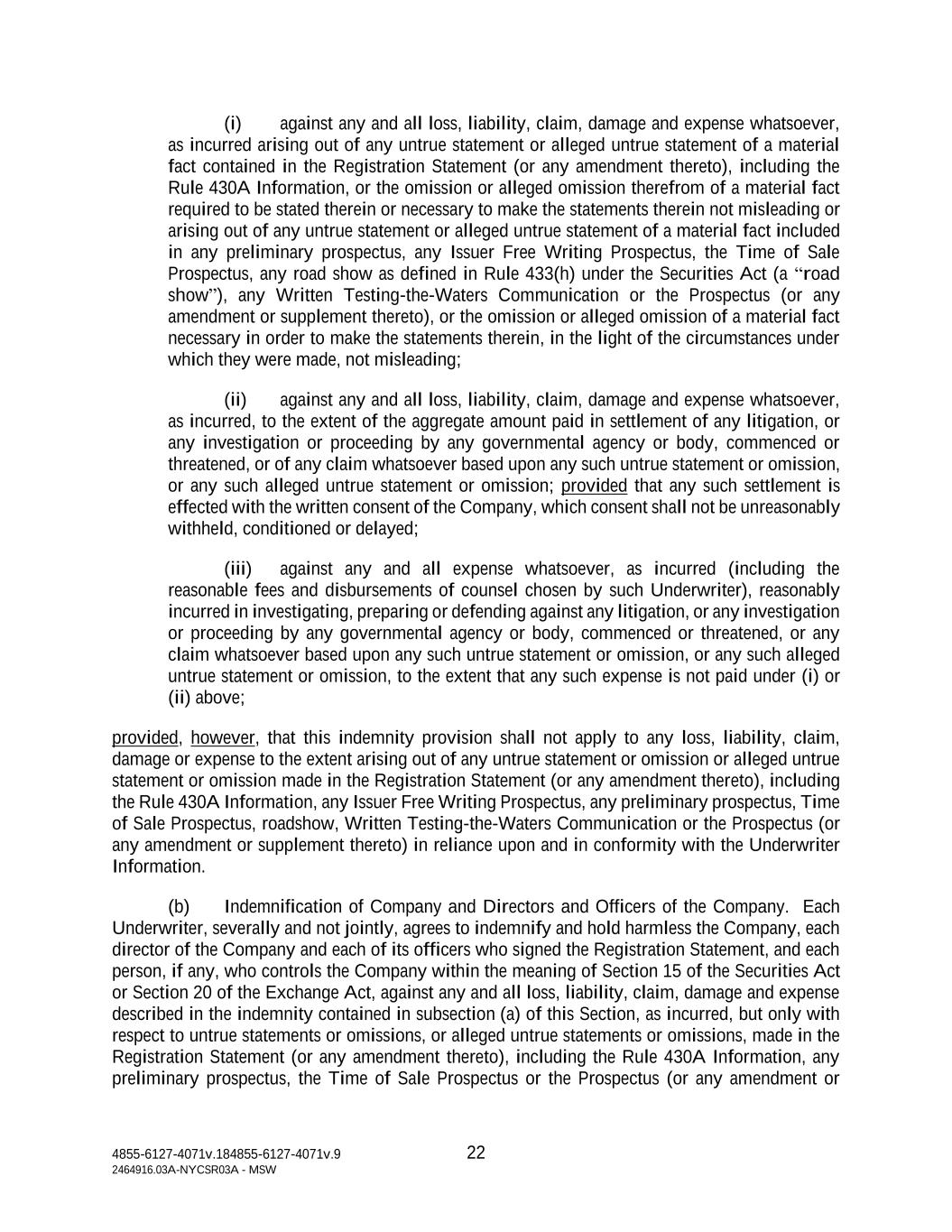 4855-6127-4071v.184855-6127-4071v.9 22 2464916.03A-NYCSR03A - MSW (i) against any and all loss, liability, claim, damage and expense whatsoever, as incurred arising out of any untrue statement or alleged untrue statement of a material fact contained in the Registration Statement (or any amendment thereto), including the Rule 430A Information, or the omission or alleged omission therefrom of a material fact required to be stated therein or necessary to make the statements therein not misleading or arising out of any untrue statement or alleged untrue statement of a material fact included in any preliminary prospectus, any Issuer Free Writing Prospectus, the Time of Sale Prospectus, any road show as defined in Rule 433(h) under the Securities Act (a “road show”), any Written Testing-the-Waters Communication or the Prospectus (or any amendment or supplement thereto), or the omission or alleged omission of a material fact necessary in order to make the statements therein, in the light of the circumstances under which they were made, not misleading; (ii) against any and all loss, liability, claim, damage and expense whatsoever, as incurred, to the extent of the aggregate amount paid in settlement of any litigation, or any investigation or proceeding by any governmental agency or body, commenced or threatened, or of any claim whatsoever based upon any such untrue statement or omission, or any such alleged untrue statement or omission; provided that any such settlement is effected with the written consent of the Company, which consent shall not be unreasonably withheld, conditioned or delayed; (iii) against any and all expense whatsoever, as incurred (including the reasonable fees and disbursements of counsel chosen by such Underwriter), reasonably incurred in investigating, preparing or defending against any litigation, or any investigation or proceeding by any governmental agency or body, commenced or threatened, or any claim whatsoever based upon any such untrue statement or omission, or any such alleged untrue statement or omission, to the extent that any such expense is not paid under (i) or (ii) above; provided, however, that this indemnity provision shall not apply to any loss, liability, claim, damage or expense to the extent arising out of any untrue statement or omission or alleged untrue statement or omission made in the Registration Statement (or any amendment thereto), including the Rule 430A Information, any Issuer Free Writing Prospectus, any preliminary prospectus, Time of Sale Prospectus, roadshow, Written Testing-the-Waters Communication or the Prospectus (or any amendment or supplement thereto) in reliance upon and in conformity with the Underwriter Information. (b) Indemnification of Company and Directors and Officers of the Company. Each Underwriter, severally and not jointly, agrees to indemnify and hold harmless the Company, each director of the Company and each of its officers who signed the Registration Statement, and each person, if any, who controls the Company within the meaning of Section 15 of the Securities Act or Section 20 of the Exchange Act, against any and all loss, liability, claim, damage and expense described in the indemnity contained in subsection (a) of this Section, as incurred, but only with respect to untrue statements or omissions, or alleged untrue statements or omissions, made in the Registration Statement (or any amendment thereto), including the Rule 430A Information, any preliminary prospectus, the Time of Sale Prospectus or the Prospectus (or any amendment or