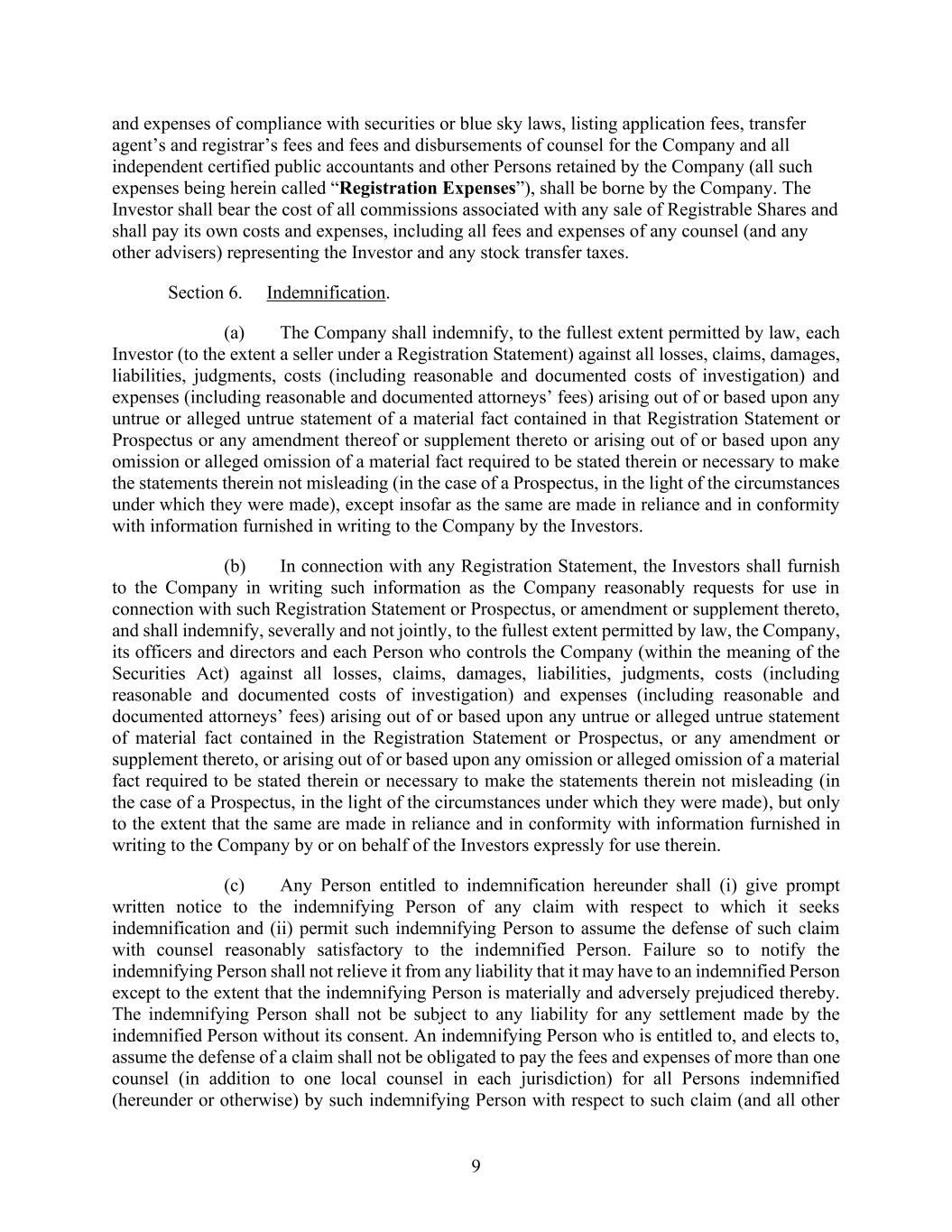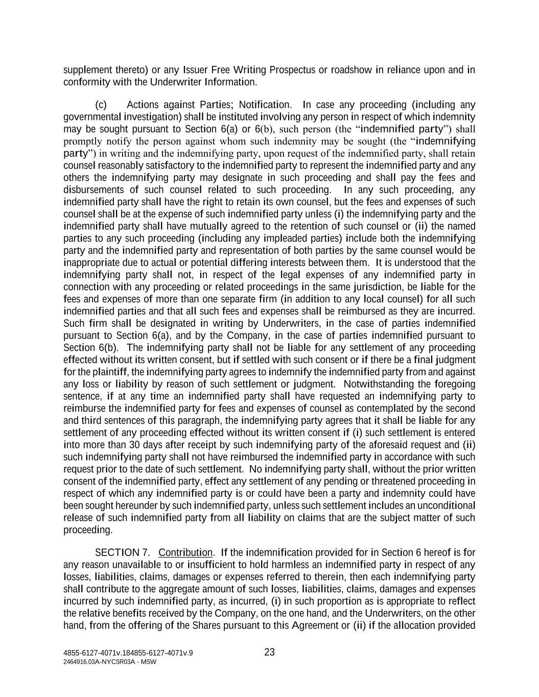 4855-6127-4071v.184855-6127-4071v.9 23 2464916.03A-NYCSR03A - MSW supplement thereto) or any Issuer Free Writing Prospectus or roadshow in reliance upon and in conformity with the Underwriter Information. (c) Actions against Parties; Notification. In case any proceeding (including any governmental investigation) shall be instituted involving any person in respect of which indemnity may be sought pursuant to Section 6(a) or 6(b), such person (the “indemnified party”) shall promptly notify the person against whom such indemnity may be sought (the “indemnifying party”) in writing and the indemnifying party, upon request of the indemnified party, shall retain counsel reasonably satisfactory to the indemnified party to represent the indemnified party and any others the indemnifying party may designate in such proceeding and shall pay the fees and disbursements of such counsel related to such proceeding. In any such proceeding, any indemnified party shall have the right to retain its own counsel, but the fees and expenses of such counsel shall be at the expense of such indemnified party unless (i) the indemnifying party and the indemnified party shall have mutually agreed to the retention of such counsel or (ii) the named parties to any such proceeding (including any impleaded parties) include both the indemnifying party and the indemnified party and representation of both parties by the same counsel would be inappropriate due to actual or potential differing interests between them. It is understood that the indemnifying party shall not, in respect of the legal expenses of any indemnified party in connection with any proceeding or related proceedings in the same jurisdiction, be liable for the fees and expenses of more than one separate firm (in addition to any local counsel) for all such indemnified parties and that all such fees and expenses shall be reimbursed as they are incurred. Such firm shall be designated in writing by Underwriters, in the case of parties indemnified pursuant to Section 6(a), and by the Company, in the case of parties indemnified pursuant to Section 6(b). The indemnifying party shall not be liable for any settlement of any proceeding effected without its written consent, but if settled with such consent or if there be a final judgment for the plaintiff, the indemnifying party agrees to indemnify the indemnified party from and against any loss or liability by reason of such settlement or judgment. Notwithstanding the foregoing sentence, if at any time an indemnified party shall have requested an indemnifying party to reimburse the indemnified party for fees and expenses of counsel as contemplated by the second and third sentences of this paragraph, the indemnifying party agrees that it shall be liable for any settlement of any proceeding effected without its written consent if (i) such settlement is entered into more than 30 days after receipt by such indemnifying party of the aforesaid request and (ii) such indemnifying party shall not have reimbursed the indemnified party in accordance with such request prior to the date of such settlement. No indemnifying party shall, without the prior written consent of the indemnified party, effect any settlement of any pending or threatened proceeding in respect of which any indemnified party is or could have been a party and indemnity could have been sought hereunder by such indemnified party, unless such settlement includes an unconditional release of such indemnified party from all liability on claims that are the subject matter of such proceeding. SECTION 7. Contribution. If the indemnification provided for in Section 6 hereof is for any reason unavailable to or insufficient to hold harmless an indemnified party in respect of any losses, liabilities, claims, damages or expenses referred to therein, then each indemnifying party shall contribute to the aggregate amount of such losses, liabilities, claims, damages and expenses incurred by such indemnified party, as incurred, (i) in such proportion as is appropriate to reflect the relative benefits received by the Company, on the one hand, and the Underwriters, on the other hand, from the offering of the Shares pursuant to this Agreement or (ii) if the allocation provided
