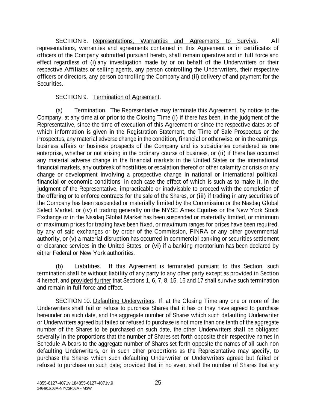 4855-6127-4071v.184855-6127-4071v.9 25 2464916.03A-NYCSR03A - MSW SECTION 8. Representations, Warranties and Agreements to Survive. All representations, warranties and agreements contained in this Agreement or in certificates of officers of the Company submitted pursuant hereto, shall remain operative and in full force and effect regardless of (i) any investigation made by or on behalf of the Underwriters or their respective Affiliates or selling agents, any person controlling the Underwriters, their respective officers or directors, any person controlling the Company and (ii) delivery of and payment for the Securities. SECTION 9. Termination of Agreement. (a) Termination. The Representative may terminate this Agreement, by notice to the Company, at any time at or prior to the Closing Time (i) if there has been, in the judgment of the Representative, since the time of execution of this Agreement or since the respective dates as of which information is given in the Registration Statement, the Time of Sale Prospectus or the Prospectus, any material adverse change in the condition, financial or otherwise, or in the earnings, business affairs or business prospects of the Company and its subsidiaries considered as one enterprise, whether or not arising in the ordinary course of business, or (ii) if there has occurred any material adverse change in the financial markets in the United States or the international financial markets, any outbreak of hostilities or escalation thereof or other calamity or crisis or any change or development involving a prospective change in national or international political, financial or economic conditions, in each case the effect of which is such as to make it, in the judgment of the Representative, impracticable or inadvisable to proceed with the completion of the offering or to enforce contracts for the sale of the Shares, or (iii) if trading in any securities of the Company has been suspended or materially limited by the Commission or the Nasdaq Global Select Market, or (iv) if trading generally on the NYSE Amex Equities or the New York Stock Exchange or in the Nasdaq Global Market has been suspended or materially limited, or minimum or maximum prices for trading have been fixed, or maximum ranges for prices have been required, by any of said exchanges or by order of the Commission, FINRA or any other governmental authority, or (v) a material disruption has occurred in commercial banking or securities settlement or clearance services in the United States, or (vi) if a banking moratorium has been declared by either Federal or New York authorities. (b) Liabilities. If this Agreement is terminated pursuant to this Section, such termination shall be without liability of any party to any other party except as provided in Section 4 hereof, and provided further that Sections 1, 6, 7, 8, 15, 16 and 17 shall survive such termination and remain in full force and effect. SECTION 10. Defaulting Underwriters. If, at the Closing Time any one or more of the Underwriters shall fail or refuse to purchase Shares that it has or they have agreed to purchase hereunder on such date, and the aggregate number of Shares which such defaulting Underwriter or Underwriters agreed but failed or refused to purchase is not more than one tenth of the aggregate number of the Shares to be purchased on such date, the other Underwriters shall be obligated severally in the proportions that the number of Shares set forth opposite their respective names in Schedule A bears to the aggregate number of Shares set forth opposite the names of all such non defaulting Underwriters, or in such other proportions as the Representative may specify, to purchase the Shares which such defaulting Underwriter or Underwriters agreed but failed or refused to purchase on such date; provided that in no event shall the number of Shares that any