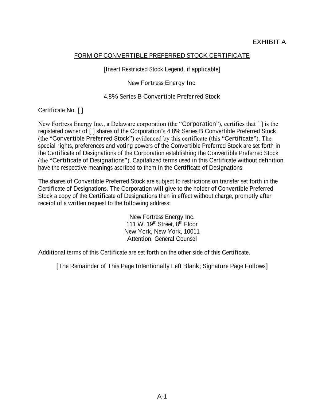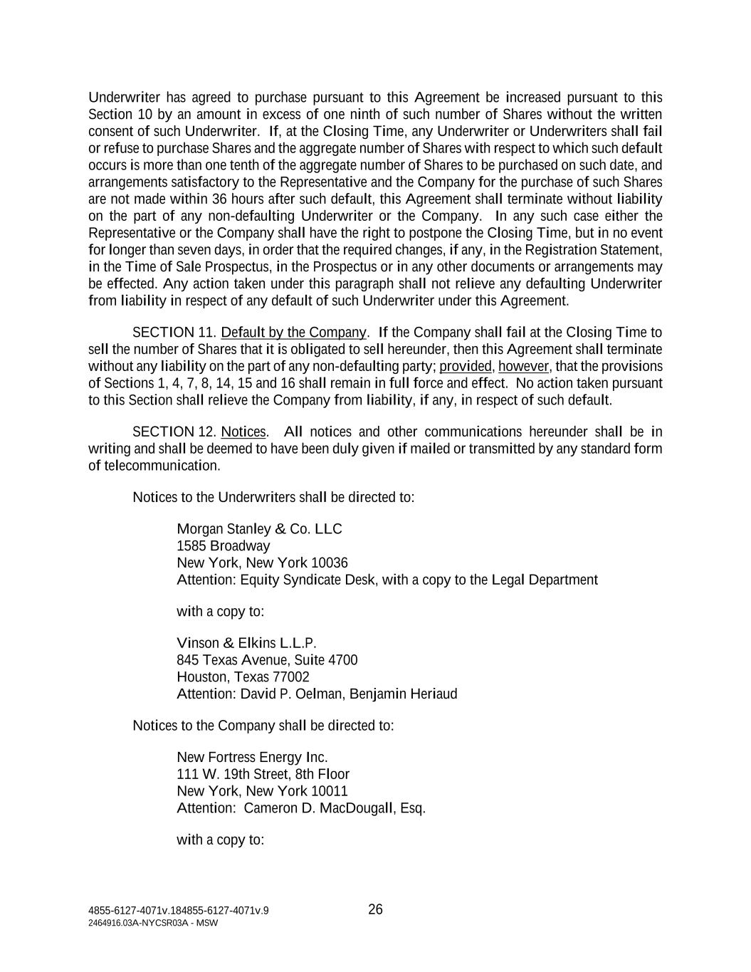 4855-6127-4071v.184855-6127-4071v.9 26 2464916.03A-NYCSR03A - MSW Underwriter has agreed to purchase pursuant to this Agreement be increased pursuant to this Section 10 by an amount in excess of one ninth of such number of Shares without the written consent of such Underwriter. If, at the Closing Time, any Underwriter or Underwriters shall fail or refuse to purchase Shares and the aggregate number of Shares with respect to which such default occurs is more than one tenth of the aggregate number of Shares to be purchased on such date, and arrangements satisfactory to the Representative and the Company for the purchase of such Shares are not made within 36 hours after such default, this Agreement shall terminate without liability on the part of any non-defaulting Underwriter or the Company. In any such case either the Representative or the Company shall have the right to postpone the Closing Time, but in no event for longer than seven days, in order that the required changes, if any, in the Registration Statement, in the Time of Sale Prospectus, in the Prospectus or in any other documents or arrangements may be effected. Any action taken under this paragraph shall not relieve any defaulting Underwriter from liability in respect of any default of such Underwriter under this Agreement. SECTION 11. Default by the Company. If the Company shall fail at the Closing Time to sell the number of Shares that it is obligated to sell hereunder, then this Agreement shall terminate without any liability on the part of any non-defaulting party; provided, however, that the provisions of Sections 1, 4, 7, 8, 14, 15 and 16 shall remain in full force and effect. No action taken pursuant to this Section shall relieve the Company from liability, if any, in respect of such default. SECTION 12. Notices. All notices and other communications hereunder shall be in writing and shall be deemed to have been duly given if mailed or transmitted by any standard form of telecommunication. Notices to the Underwriters shall be directed to: Morgan Stanley & Co. LLC 1585 Broadway New York, New York 10036 Attention: Equity Syndicate Desk, with a copy to the Legal Department with a copy to: Vinson & Elkins L.L.P. 845 Texas Avenue, Suite 4700 Houston, Texas 77002 Attention: David P. Oelman, Benjamin Heriaud Notices to the Company shall be directed to: New Fortress Energy Inc. 111 W. 19th Street, 8th Floor New York, New York 10011 Attention: Cameron D. MacDougall, Esq. with a copy to: