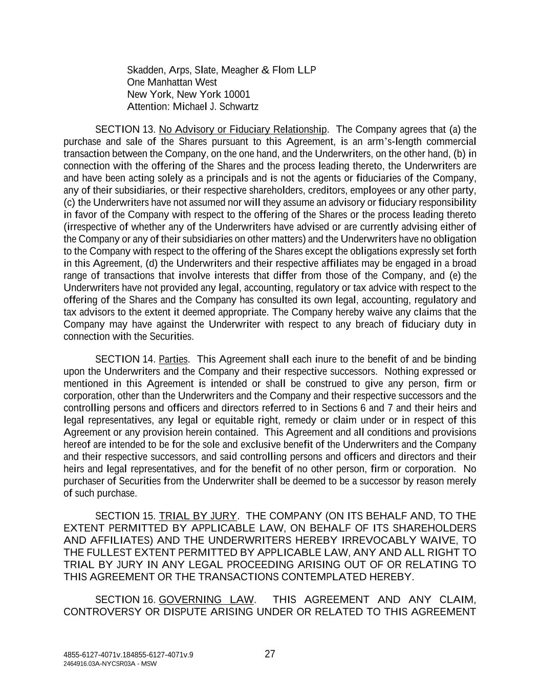 4855-6127-4071v.184855-6127-4071v.9 27 2464916.03A-NYCSR03A - MSW Skadden, Arps, Slate, Meagher & Flom LLP One Manhattan West New York, New York 10001 Attention: Michael J. Schwartz SECTION 13. No Advisory or Fiduciary Relationship. The Company agrees that (a) the purchase and sale of the Shares pursuant to this Agreement, is an arm’s-length commercial transaction between the Company, on the one hand, and the Underwriters, on the other hand, (b) in connection with the offering of the Shares and the process leading thereto, the Underwriters are and have been acting solely as a principals and is not the agents or fiduciaries of the Company, any of their subsidiaries, or their respective shareholders, creditors, employees or any other party, (c) the Underwriters have not assumed nor will they assume an advisory or fiduciary responsibility in favor of the Company with respect to the offering of the Shares or the process leading thereto (irrespective of whether any of the Underwriters have advised or are currently advising either of the Company or any of their subsidiaries on other matters) and the Underwriters have no obligation to the Company with respect to the offering of the Shares except the obligations expressly set forth in this Agreement, (d) the Underwriters and their respective affiliates may be engaged in a broad range of transactions that involve interests that differ from those of the Company, and (e) the Underwriters have not provided any legal, accounting, regulatory or tax advice with respect to the offering of the Shares and the Company has consulted its own legal, accounting, regulatory and tax advisors to the extent it deemed appropriate. The Company hereby waive any claims that the Company may have against the Underwriter with respect to any breach of fiduciary duty in connection with the Securities. SECTION 14. Parties. This Agreement shall each inure to the benefit of and be binding upon the Underwriters and the Company and their respective successors. Nothing expressed or mentioned in this Agreement is intended or shall be construed to give any person, firm or corporation, other than the Underwriters and the Company and their respective successors and the controlling persons and officers and directors referred to in Sections 6 and 7 and their heirs and legal representatives, any legal or equitable right, remedy or claim under or in respect of this Agreement or any provision herein contained. This Agreement and all conditions and provisions hereof are intended to be for the sole and exclusive benefit of the Underwriters and the Company and their respective successors, and said controlling persons and officers and directors and their heirs and legal representatives, and for the benefit of no other person, firm or corporation. No purchaser of Securities from the Underwriter shall be deemed to be a successor by reason merely of such purchase. SECTION 15. TRIAL BY JURY. THE COMPANY (ON ITS BEHALF AND, TO THE EXTENT PERMITTED BY APPLICABLE LAW, ON BEHALF OF ITS SHAREHOLDERS AND AFFILIATES) AND THE UNDERWRITERS HEREBY IRREVOCABLY WAIVE, TO THE FULLEST EXTENT PERMITTED BY APPLICABLE LAW, ANY AND ALL RIGHT TO TRIAL BY JURY IN ANY LEGAL PROCEEDING ARISING OUT OF OR RELATING TO THIS AGREEMENT OR THE TRANSACTIONS CONTEMPLATED HEREBY. SECTION 16. GOVERNING LAW. THIS AGREEMENT AND ANY CLAIM, CONTROVERSY OR DISPUTE ARISING UNDER OR RELATED TO THIS AGREEMENT