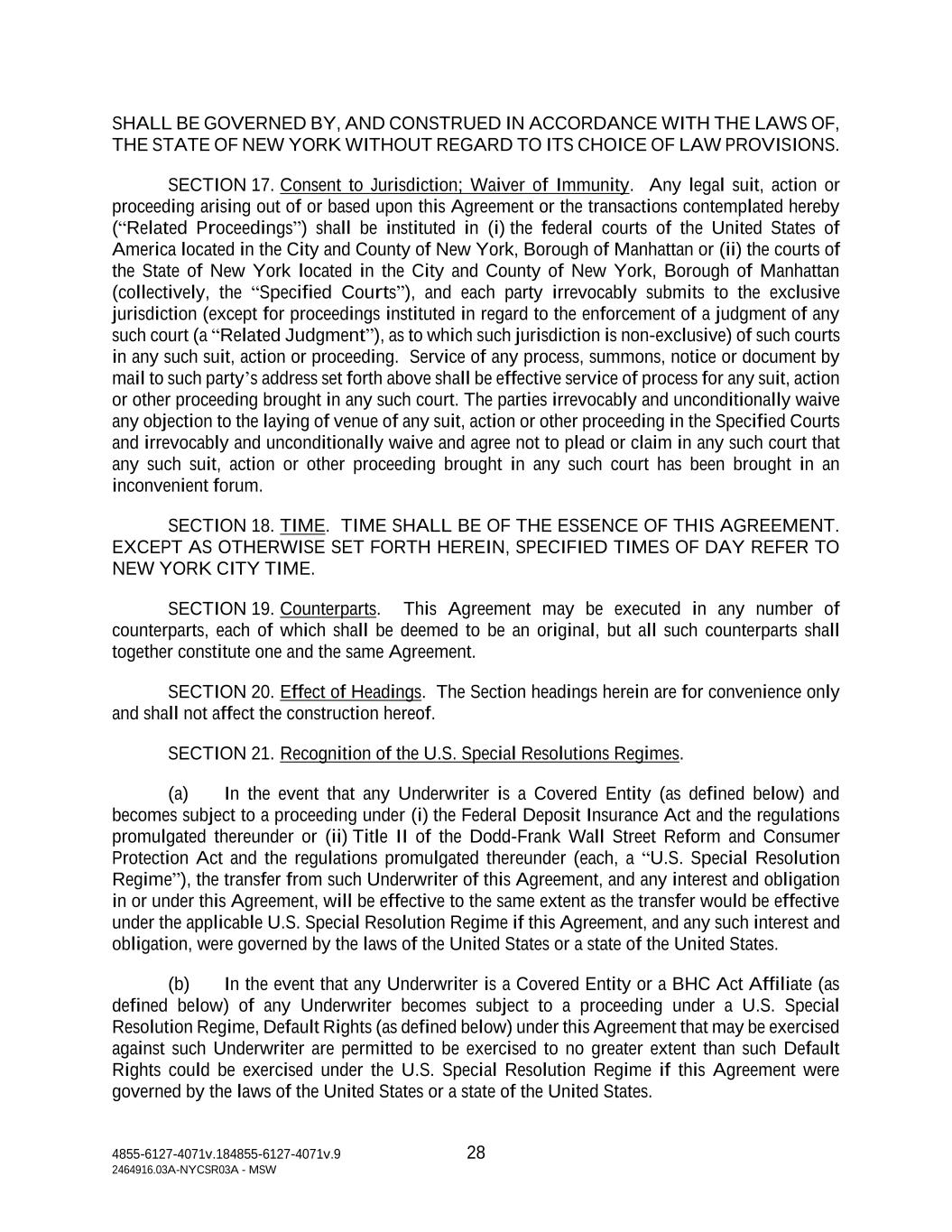 4855-6127-4071v.184855-6127-4071v.9 28 2464916.03A-NYCSR03A - MSW SHALL BE GOVERNED BY, AND CONSTRUED IN ACCORDANCE WITH THE LAWS OF, THE STATE OF NEW YORK WITHOUT REGARD TO ITS CHOICE OF LAW PROVISIONS. SECTION 17. Consent to Jurisdiction; Waiver of Immunity. Any legal suit, action or proceeding arising out of or based upon this Agreement or the transactions contemplated hereby (“Related Proceedings”) shall be instituted in (i) the federal courts of the United States of America located in the City and County of New York, Borough of Manhattan or (ii) the courts of the State of New York located in the City and County of New York, Borough of Manhattan (collectively, the “Specified Courts”), and each party irrevocably submits to the exclusive jurisdiction (except for proceedings instituted in regard to the enforcement of a judgment of any such court (a “Related Judgment”), as to which such jurisdiction is non-exclusive) of such courts in any such suit, action or proceeding. Service of any process, summons, notice or document by mail to such party’s address set forth above shall be effective service of process for any suit, action or other proceeding brought in any such court. The parties irrevocably and unconditionally waive any objection to the laying of venue of any suit, action or other proceeding in the Specified Courts and irrevocably and unconditionally waive and agree not to plead or claim in any such court that any such suit, action or other proceeding brought in any such court has been brought in an inconvenient forum. SECTION 18. TIME. TIME SHALL BE OF THE ESSENCE OF THIS AGREEMENT. EXCEPT AS OTHERWISE SET FORTH HEREIN, SPECIFIED TIMES OF DAY REFER TO NEW YORK CITY TIME. SECTION 19. Counterparts. This Agreement may be executed in any number of counterparts, each of which shall be deemed to be an original, but all such counterparts shall together constitute one and the same Agreement. SECTION 20. Effect of Headings. The Section headings herein are for convenience only and shall not affect the construction hereof. SECTION 21. Recognition of the U.S. Special Resolutions Regimes. (a) In the event that any Underwriter is a Covered Entity (as defined below) and becomes subject to a proceeding under (i) the Federal Deposit Insurance Act and the regulations promulgated thereunder or (ii) Title II of the Dodd-Frank Wall Street Reform and Consumer Protection Act and the regulations promulgated thereunder (each, a “U.S. Special Resolution Regime”), the transfer from such Underwriter of this Agreement, and any interest and obligation in or under this Agreement, will be effective to the same extent as the transfer would be effective under the applicable U.S. Special Resolution Regime if this Agreement, and any such interest and obligation, were governed by the laws of the United States or a state of the United States. (b) In the event that any Underwriter is a Covered Entity or a BHC Act Affiliate (as defined below) of any Underwriter becomes subject to a proceeding under a U.S. Special Resolution Regime, Default Rights (as defined below) under this Agreement that may be exercised against such Underwriter are permitted to be exercised to no greater extent than such Default Rights could be exercised under the U.S. Special Resolution Regime if this Agreement were governed by the laws of the United States or a state of the United States.
