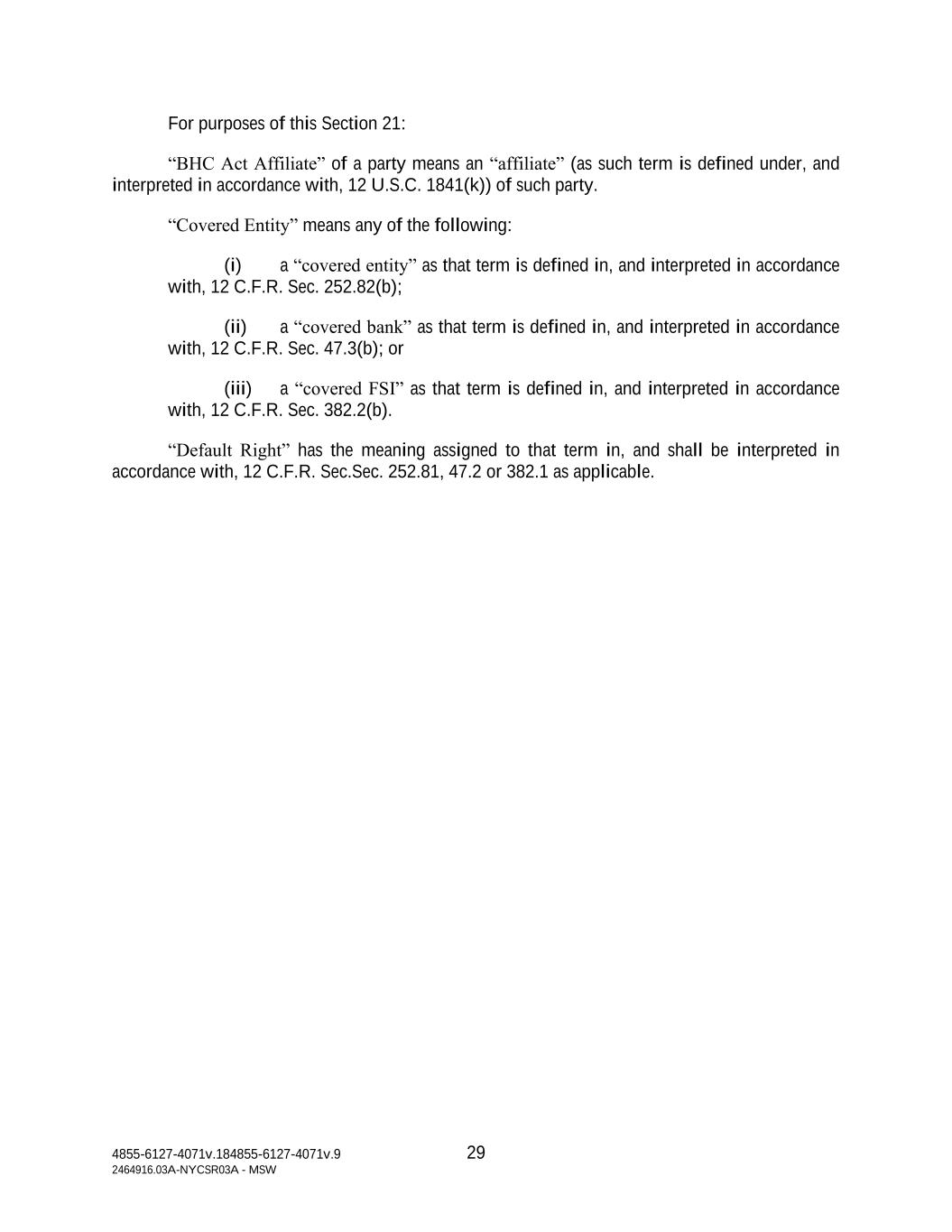4855-6127-4071v.184855-6127-4071v.9 29 2464916.03A-NYCSR03A - MSW For purposes of this Section 21: “BHC Act Affiliate” of a party means an “affiliate” (as such term is defined under, and interpreted in accordance with, 12 U.S.C. 1841(k)) of such party. “Covered Entity” means any of the following: (i) a “covered entity” as that term is defined in, and interpreted in accordance with, 12 C.F.R. Sec. 252.82(b); (ii) a “covered bank” as that term is defined in, and interpreted in accordance with, 12 C.F.R. Sec. 47.3(b); or (iii) a “covered FSI” as that term is defined in, and interpreted in accordance with, 12 C.F.R. Sec. 382.2(b). “Default Right” has the meaning assigned to that term in, and shall be interpreted in accordance with, 12 C.F.R. Sec.Sec. 252.81, 47.2 or 382.1 as applicable.