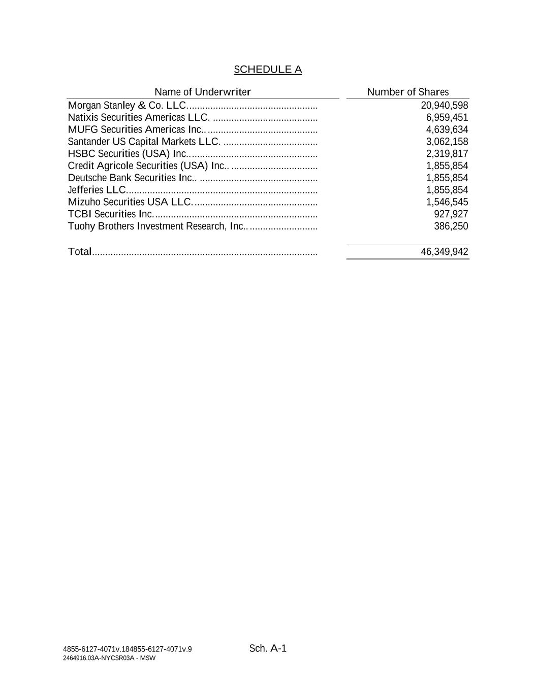 4855-6127-4071v.184855-6127-4071v.9 Sch. A-1 2464916.03A-NYCSR03A - MSW SCHEDULE A Name of Underwriter Number of Shares Morgan Stanley & Co. LLC. ................................................. 20,940,598 Natixis Securities Americas LLC. ........................................ 6,959,451 MUFG Securities Americas Inc.. .......................................... 4,639,634 Santander US Capital Markets LLC. .................................... 3,062,158 HSBC Securities (USA) Inc.. ................................................ 2,319,817 Credit Agricole Securities (USA) Inc.. ................................. 1,855,854 Deutsche Bank Securities Inc.. ............................................. 1,855,854 Jefferies LLC. ........................................................................ 1,855,854 Mizuho Securities USA LLC. ............................................... 1,546,545 TCBI Securities Inc. .............................................................. 927,927 Tuohy Brothers Investment Research, Inc.. .......................... 386,250 Total ...................................................................................... 46,349,942