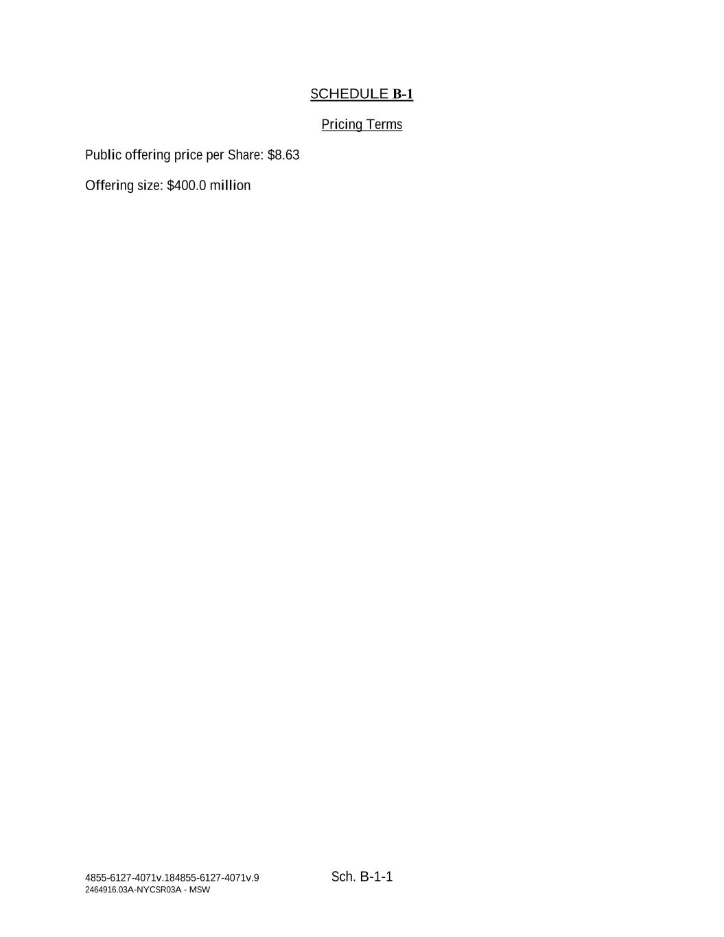 4855-6127-4071v.184855-6127-4071v.9 Sch. B-1-1 2464916.03A-NYCSR03A - MSW SCHEDULE B‑1 Pricing Terms Public offering price per Share: $8.63 Offering size: $400.0 million